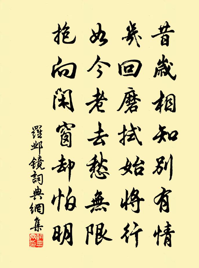 詩詞名句歷史字典書法欣賞書法字典國語詞典說文解字康熙字典古漢語字典標 題 作 者 詩 句 鏡作者:羅鄴 朝代:唐代鏡原文昔歲相知別有情,幾回磨拭始將行。如今老去愁無限,抱向閒窗卻怕明。詩詞問答問:鏡的作者是誰?答:羅鄴問:鏡寫於哪個朝代?答:唐代問:鏡是什麼體裁?答:七絕羅鄴鏡書法欣賞鏡書法作品注釋全唐詩:卷654-115詩詞推薦菩薩蠻周紫芝〔宋代〕風頭不定雲來去。天教月到湖心住。遙夜一襟愁。水風渾似秋。藕花迎露笑。暗水飛螢照。漁笛莫頻吹。客愁人不經林逋舊居二首蔡襄〔宋代〕山色凝嵐水色清,山雲長與水雲平。先生來舉持竿手,釣得人間亢俗名。南嶽道中二首汪元量〔宋代〕南嶽陰陰松道涼,又騎站馬望荊襄。山中老柏滴寒翠,江上危峰撐夕陽。昔往不堪經灩澦,此行重得看瀟湘。三宮和晏相公夜歸遇雪宋祁〔宋代〕孝王台下糅花飛,草草歸驂驟碧啼。斗作暝寒凌冒絮,更回餘舞拂鄣泥。城連迥闕迷蒼鳳,人度長橋壓素霓。頹玉湘江曲徐照〔宋代〕湘江無潮水,日夜一向流。別心無彼此,兩處各悠悠。自古吟邵雍〔宋代〕自古大聖人,猶以為難事。而況後世人,豈復便能至。求之不勝難,得之至容易。千人萬人心,一人之心是。贈別二首之一杜牧〔唐代〕娉娉裊裊十三餘,豆蔻梢頭二月初。春風十里揚州路,卷上珠簾總不如。平明出小東門觀梅陸游〔宋代〕知心多別離,慰眼易零落。東風吹梅花,爛漫照城郭。晴日千堆雪,偏宜馬上看。逢迎無幾日,不惜犯春寒。明年逍遙詠宋太宗〔宋代〕逍遙賢聖樂,我悶俗情愚。鄙俚何堪數,斟量解卷舒。惡緣須盡去,善事好相於。忙急真如夢,乾坤造化殊。刺左右膊詩趙武建〔唐代〕野鴨灘頭宿,朝朝被鶻梢。忽驚飛入水,留命到今朝。次及甫入峽雜詠峽口洪咨夔〔宋代〕山隘留天少,江迂占地多。風梢猿自掛,露草虎曾過。坐客猶吳語,行人盡楚歌。川妃瀾浪甚,著語試誰何。送英州蘇秘丞曾鞏〔宋代〕遠民歌舞戴昇平,碧閣朱樓照眼明。鄉饌雨余收白蕈,客樽秋後對紅英。瀧鳴湞水遙通海,路入南山不隔城。材術送客游江南韓翃〔唐代〕南使孤帆遠,東風任意吹。楚雲殊不斷,江鳥暫相隨。月淨鴛鴦水,春生豆蔻枝。賞稱佳麗地,君去莫應知。至後入城道中雜興十首楊萬里〔宋代〕問渠田父定無飢,卻道官人那得知。未送太倉新玉粒,敢先雲子滑流匙。此君亭歌毛漸〔宋代〕玉堂視草儒林翁,暫憑熊軾來江東。政成暇日開宴席,選勝共詣金仙宮。幽亭虛敞竹森聳,低徊映日清陰重。靜坐閒吟四首邵雍〔宋代〕居洛 * 載,投心唯二三。相逢各白首,共坐多清談。人事已默定,世情曾久諳。酒行勿相逼,徐得奉醺酣。送萬巨韓翃〔唐代〕漢相見王陵,揚州事張禹。風帆木蘭楫,水國蓮花府。百丈清江十月天,寒城鼓角曉鍾前。金爐促膝諸曹吏,玉管投曾秀州逢四首趙蕃〔宋代〕有蟹無監乃樂邦,人生如意信難雙。公才自是明堂用,寄語毗蜉盍少降。題洛尾亭二首張耒〔宋代〕日出南山春霧收,渾渾洛尾入淮流。莫向行人贈楊柳,折將離恨入孤舟。登靈山水閣貽釣者杜荀鶴〔唐代〕江上見僧誰是了,修齋補衲日勞身。未勝漁父閒垂釣,獨背斜陽不採人。縱有風波猶得睡,總無蓑笠始為貧。瓦瓶名句推薦問君何事輕離別,一年能幾團圓月。納蘭性德《菩薩蠻·問君何事輕離別》 惡之者眾則危。荀子《荀子·正論》 多讀兩句書,少說一句話,讀得兩行書,說得幾句話。陳繼儒《小窗幽記·集醒篇》 恥之於人大矣。為機變之巧者,無所用恥焉。孟子《孟子·盡心章句上·第七節》 一聲已動物皆靜,四座無言星欲稀。李頎《琴歌》 夢裡不知身是客,一晌貪歡。李煜《浪淘沙令·簾外雨潺潺》 隔戶楊柳弱裊裊,恰似十五女兒腰。杜甫《絕句漫興九首·其一》 迴廊遠砌生秋草,夢魂千里青門道。馮延巳《菩薩蠻·迴廊遠砌生秋草》 江上陰雲鎖夢魂,江邊深夜舞劉琨。譚用之《秋宿湘江遇雨》 送君九月交河北,雪裡題詩淚滿衣。岑參《送崔子還京》
