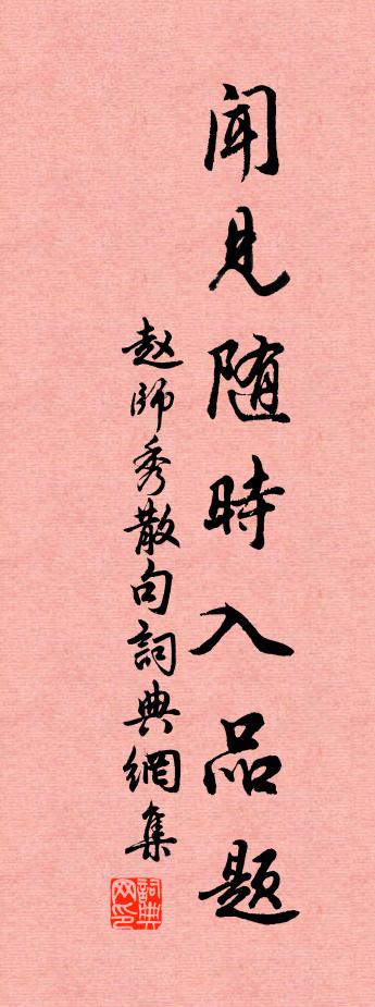 詩詞名句歷史字典書法欣賞書法字典國語詞典說文解字康熙字典古漢語字典標 題 作 者 詩 句 句作者:趙師秀 朝代:宋代句原文聞見隨時入品題。詩詞問答問:句的作者是誰?答:趙師秀問:句寫於哪個朝代?答:宋代趙師秀句書法欣賞句書法作品詩詞推薦秦樓月(梅花十闋)黎廷瑞〔宋代〕雲根屋。東風四壁花如玉。花如玉。水仙傷婉。山礬傷俗。高標懶趁時妝束。一丘一壑便幽獨。便幽獨。商山四皓秋堂弟自贛歸建安作別何文季〔宋代〕同飲西江甫兩春,匆匆馬首又東馳。歸與華閣春風裡,憶我鈴齋夜雨時。好把汗青傳久遠,莫將朱紫裹愚痴。閩中句王貽永〔宋代〕河朔雪深思愛月,並門春暖詠甘棠。賀新郎應法孫〔宋代〕宿霧樓台濕。曉清初、花明柳潤,燕飛鶯集。舊約重來歌舞地,留得艷香嬌色。又夢草、東風吹碧。午困騰騰春欲臨江仙(陳守美任)陳韡〔宋代〕三十四年台榭,八千餘里江津。去時楊柳正輕顰。重來桃李少,不似舊時春。風掃半空煙雨,玉虹翠浪如新。可憐送趙振文主簿樓鑰〔宋代〕去去江西不作難,片帆雙槳盪秋瀾。已知官業非時樣,尤喜情親耐歲寒。志大自然羞附驥,官卑何用嘆棲鸞。少卿閒居吟金朋說〔宋代〕斗室安居廣,爐香樂性閒。不欺幽獨境,無愧兩儀間。春晚詠懷贈皇甫朗之白居易〔唐代〕艷陽時節又蹉跎,遲暮光陰復若何。一歲中分春日少,百年通計老時多。多中更被愁牽引,少處兼遭病折磨。賴有大唐鐘山進士歌楊維楨〔元代〕睛如貓,須如茅,烏靴白簡鴨色袍。元是鐘山老馗唐進土,感君之賜何以酬君勞。雖生不得祿,誓死為鬼豪。老馗寄雲泉僧永頤周弼〔宋代〕書來只說住高峰,不記松林第幾重。欲揀青巒問茅舍,秋山一樣白雲封。觀春秋吟邵雍〔宋代〕堂堂王室寄空名,天下無時不戰爭。滅國伐人雖恐後,尋盟報役未嘗寧。晉齊命令炎如火,文武資基冷似冰。唯有嘗諸店酒醉吟二首楊萬里〔宋代〕我飲無定數,一杯復一杯。醉來我自止,不須問樽罍。白眼望青天,青天為我開。青天不開時,我醉眠蒼苔。夜歸陸游〔宋代〕城角傳三弄,桑村喜獨歸。雨多螢滿野,徑狹露沾衣。食儉鹽醯薄,年衰氣力微。青燈對兒女,撫事一歔欷。哭吳縣房聳明府皎然〔唐代〕仁人邁厚德,可謂名實全。撫跡若疏曠,會心極精研。履危節詎屈,著論識不偏。恨以榮級淺,嘉猷未及宣。伊人和張王臣登清斯亭韻三首廖行之〔宋代〕海棠冬暖亦狂花,步繞畦區羨物華。微雨蒼茫低塞雁,寒聲寂歷到汀葭。映人清絕梅松竹,照眼黃垂橘柚樝。自喜北郭貧居孟郊〔唐代〕進乏廣莫力,退為蒙籠居。三年失意歸,四向相識疏。地僻草木壯,荒條扶我廬。夜貧燈燭絕,明月照吾書。欲識高宗皇帝挽章四首陳造〔宋代〕雨露均皇澤,丹青煥帝猷。恢圖自天運,授聖與神謀。方眕修齡夢,俄偕造物游。姑山餘四子,不復侯瓊輈。和張功父聞子規楊萬里〔宋代〕久雨今朝忽作晴,老人懷抱不勝清。仲宣久作登樓賦,望帝更吟當殿聲。春去春來渾是夢,花開花落若為情。歸心和張秀才陳造〔宋代〕山川向晚點塵無,忽訝篩瓊屑玉鋪。巧與梅花爭便旋,試將姑射比肌膚。破寒春酒何曾釅,薦箸窮鳩不料臞。陵藉嘗新茶呈聖俞歐陽修〔宋代〕建安三千里,京師三月嘗新茶。人情好先務取勝,百物貴早相矜誇。年窮臘盡春欲動,蟄雷未起驅龍蛇。夜聞擊鼓名句推薦審定有無與其實虛,隨其嗜欲以見其志意。王詡《鬼谷子·捭闔》 帝里重清明,人心自愁思。孟浩然《清明即事》 逢人且說三分話,未可全拋一片心。佚名《增廣賢文·上集》 綠楊芳草長亭路。年少拋人容易去。晏殊《玉樓春·春恨》 勞苦之事則爭先,饒樂之事則能讓。荀子《荀子·修身》 茶為累也,亦猶人參。陸羽《茶經·一之源》 鶯啼燕語報新年,馬邑龍堆路幾千。皇甫冉《春思》 願將腰下劍,直為斬樓蘭。李白《塞下曲六首》 扶桑已在渺茫中,家在扶桑東更東。韋莊《送日本國僧敬龍歸》 我本不棄世,世人自棄我。李白《送蔡山人》
