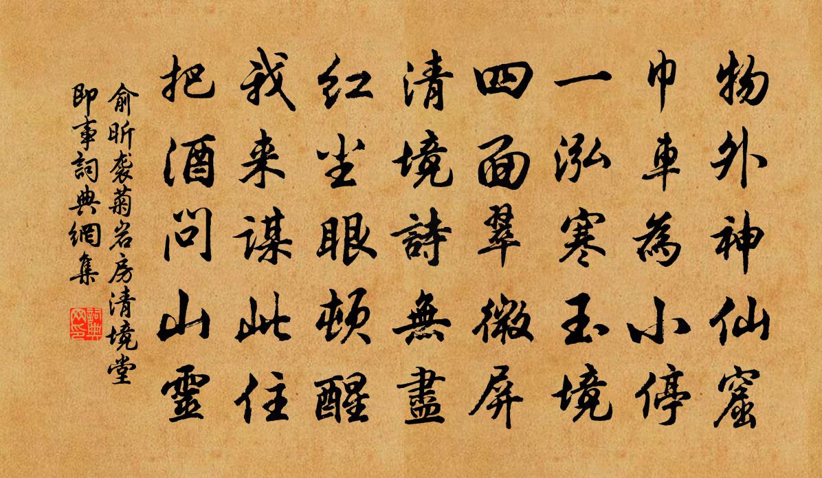 詩詞名句歷史字典書法欣賞書法字典國語詞典說文解字康熙字典古漢語字典標 題 作 者 詩 句 襲菊岩房清境堂即事作者:俞昕 朝代:宋代襲菊岩房清境堂即事原文物外神仙窟,巾車為小停。一泓寒玉境,四面翠微屏。清境詩無盡,紅塵眼頓醒。我來謀此住,把酒問山靈。詩詞問答問:襲菊岩房清境堂即事的作者是誰?答:俞昕問:襲菊岩房清境堂即事寫於哪個朝代?答:宋代俞昕襲菊岩房清境堂即事書法欣賞襲菊岩房清境堂即事書法作品詩詞推薦句左偃〔唐代〕胡笳聞欲死,漢月望還生。日華離碧海,雲影散青霄。西湖閒望梅堯臣〔宋代〕夏景已多趣,湖邊日更佳。園葵雜紅紫,岸柳自欹斜。雨氣收林表,城陰接水涯。愛閒輸白鳥,盡日立汀沙。戊午在靈隱聞曹源和尚訃音兼小師舉老為開語釋道沖〔宋代〕三處移場定紀綱,曾無一字落諸方。破家種草痴狂甚,醜惡無端向外揚。廬山王貞白〔唐代〕岳立鎮南楚,雄名天下聞。五峰高閡日,九疊翠連雲。夏谷雪猶在,陰岩晝不分。唯應嵩與華,清峻得為群。謁金門(用趙帳乾韻)程珌〔宋代〕煙漠漠。醉里看春都錯。過了清明遲一著。牡丹重約摸。曉日漸明檐角。天與芳辰難卻。駐得韶華元有藥。桃源誰西園劉得仁〔唐代〕夏圃秋涼入,樹低逢幘欹。水聲翻敗堰,山翠濕疏籬。綠滑莎藏徑,紅連果壓枝。幽人更何事,旦夕與僧期。九月十三日夜偶書李復〔宋代〕林葉紛紛已半凋,陰雲不放眼周遭。稍知風逐青娥動,更覺天騰北海高。萬里無心思假翼,百年多事喜持螯。山前浣溪沙佚名〔宋代〕梅與稱名蠟與黃。枝無裊娜色無光。掩檀欺麝冠群芳。結處定緣蜂力就,開時微帶蜜脾香。風標不減壽陽妝。馬上作傅察〔宋代〕心逐輕波去,身隨匹馬歸。據鞍揮淚盡,回首一依依。送宛句趙少府張九齡〔唐代〕解巾行作吏,尊酒謝離居。修竹含清景,華池澹碧虛。地將幽興愜,人與舊遊疏。林下紛相送,多逢長者車。赴陳留二首陳與義〔宋代〕馬上摩挲眼,出門光景新。雅鳴半陂雪,路轉一林春。舊歲有三日,全家無十人。平生鸚鵡盞,今夕最關身。花障姚勉〔宋代〕綠外濃黃白外紅,一屏香錦立春風。天真步障豪難敵,借與王家賽石崇。景仁思歸雨未克行以詩留之司馬光〔宋代〕嘉客念歸程,泥深未可行。今朝陰又重,春雨亦多情。送會之夢龍赴南安尉王邁〔宋代〕儒生十九諳吏事,君自胸中有八窗。好去褆知師長吏,謹毋泄邇薄鄰邦。政聲要重車渠百,祥兆須來鸂鶒雙。自笑次韻張守秋懷四首劉子翬〔宋代〕杖藜乘興出,佳處每關情。白石溪流淺,黃花籬落清。林煙經雨薄,野日傍山明。賴有杯中物,愁懷得暫平。商山旅中作邵雍〔宋代〕殘火香燈夜正沉,默思前事擁寒衾。霜天皎月雖千里,不抵傷時一寸心。飯後自嘲陸游〔宋代〕歲熟家彌困,天寒酒闕傾。僅能炊稻飯,敢望糝藜羹。一榻解腰臥,四廊摩腹行。詩人要疏瘦,此日媿膨脝。和鮑守次韻林德祖十四首傅察〔宋代〕恩分千里賞猶輕,好建精思李柏亭。日映普壺融皎潔,風臨玉樹發蔥青。高名競慕蒲葵扇,雅操寧施刻鏤屏。夢得西江月王哲〔元代〕酒飲清光滑辣,果餐軟美香甜。兩般每日做抽添。八味依時給贍。信步六街走遍,須尋七寶妝嚴。三田九轉似銀蟾臨安謠臨安人〔宋代〕滿頭青,都是假。這回來,不作耍。名句推薦不怕三十而死,只怕死後無名。佚名《增廣賢文·下集》 金陵津渡小山樓,一宿行人自可愁。張祜《題金陵渡》 寒英坐銷落,何用慰遠客。柳宗元《早梅》 銜霜當路發,映雪擬寒開。何遜《詠早梅 / 揚州法曹梅花盛開》 似此星辰非昨夜,為誰風露立中宵。黃景仁《綺懷》 機心信隱,交接靡密,庶下者知威而畏也。來俊臣《羅織經·治下卷第三》 非學無以廣才,非志無以成學。諸葛亮《誡子書》 彌傷孤舟夜,遠結萬里心。權德輿《月夜江行 / 旅次江亭》 單于北望拂雲堆,殺馬登壇祭幾回。王之渙《涼州詞二首》 低頭獨長嘆,此嘆無人喻。白居易《買花 / 牡丹》