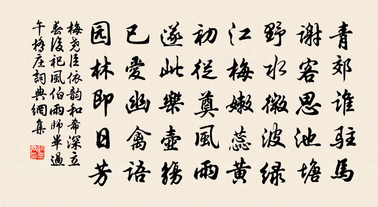 青郊誰駐馬,謝客思池塘。野水微波綠,江梅嫩蕊黃。
