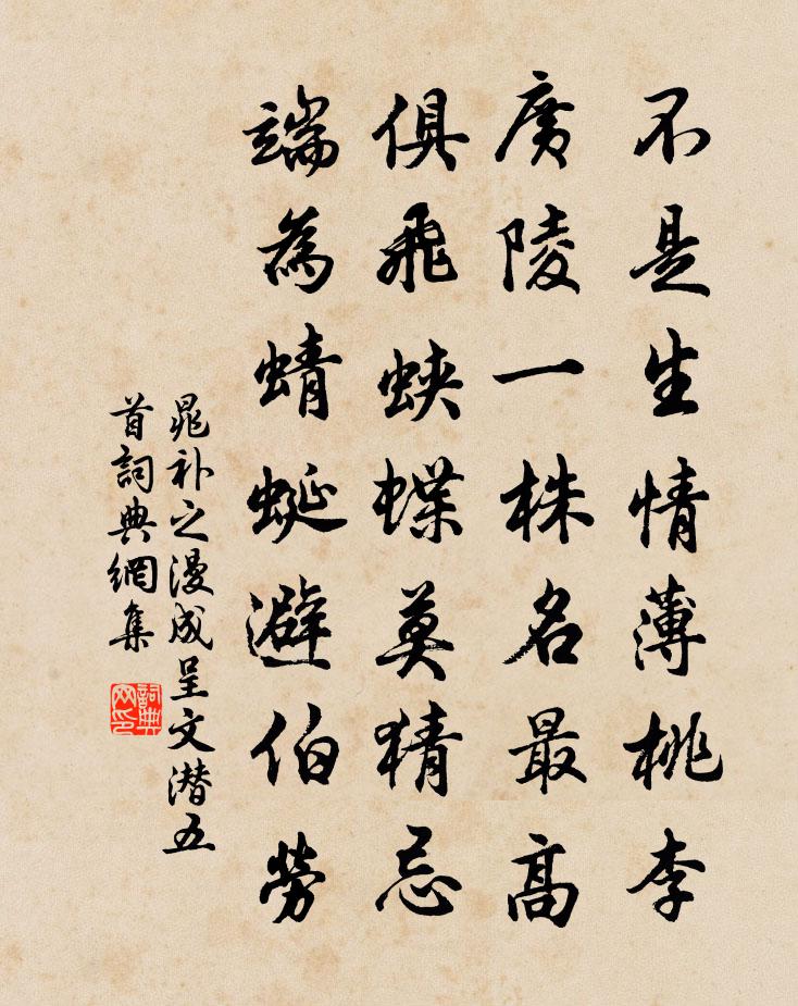 詩詞名句歷史字典書法欣賞書法字典國語詞典說文解字康熙字典古漢語字典標 題 作 者 詩 句 漫成呈文潛五首作者:晁補之 朝代:宋代漫成呈文潛五首原文不是生情薄桃李,廣陵一株名最高。俱飛蛺蝶莫猜忌,端為蜻蜓避伯勞。詩詞問答問:漫成呈文潛五首的作者是誰?答:晁補之問:漫成呈文潛五首寫於哪個朝代?答:宋代問:晁補之的名句有哪些?答:晁補之名句大全晁補之漫成呈文潛五首書法欣賞漫成呈文潛五首書法作品詩詞推薦過邵伯鎮文天祥〔宋代〕今朝車馬地,昔日戰爭場。我有揚州鶴,誰存邵伯棠。一灣流水小,數畝故城荒。回首江南路,青山斷夕陽。詠史下晉武帝陳普〔宋代〕杳杳羊車轉掖庭,夕陽亭上北風腥。紛紛羔膻趨河洛,為見深宮竹葉青。枕簟入林僻花瓜留客遲十韻葉茵〔宋代〕一會良不易,載言翻令愁。清風有時度,白日不可留。偈頌三十首釋印肅〔宋代〕圓應牛,經劫沒人收。若不遇人,虛度春秋。如今橫穿鼻孔,水草皆休。有時放,有時收,隨分納些些,自性優遊十五日游龍華淨明兩院值雨蔡襄〔宋代〕垂楊修竹半藏山,一徑紆迴暮雨間。綠滿野田看渺渺,白飛岩溜自潺潺。空村鮐背行歌去,古寺頭陀乞食還。卻羨商婦詞十首劉克莊〔宋代〕圖南倭舶透,敗北榷場開。妾貌不長好,君行何日回。又聞邊報四首劉克莊〔宋代〕玉帛朝馳盟暮寒,覆車胡不鑒燕山。未聞一范出乘塞,忽報六符來叩關。孫氏已憑江立國,孔融誤以許為寰。洛花春秋戰國門王孫滿周曇〔唐代〕九牧金熔物像成,辭昏去亂祚休明。興亡在德不在鼎,楚子何勞問重輕。止酒陶淵明〔魏晉〕居止次城邑,逍遙自閒止。坐止高蔭下,步止蓽門裡。好味止園葵,大懽止稚子。平生不止酒,止酒情無喜。暮止又擊毬司馬光〔宋代〕肅奉承軺命,仍陪戲馬游。朋分初迥出,勢合復相收。顧盼華星激,縈迴紫電流。良因重嘉好,禮接使臣優。山扉夜坐王勃〔唐代〕抱琴開野室,攜酒對情人。林塘花月下,別似一家春。關邑簿李大用任滿陳著〔宋代〕彩旗蔽野南風香,歡門遮馬東路長。黃童白叟百拜酒,鸞棲主人今日行。憶昔焦氛漲天赤,手挽龍津力輸滌。簿領東歸見梅喻良能〔宋代〕老大無堪鬢似銀,虛名猶復玷簪紳。久為碌碌趨朝士,暫作棲棲去國人。行李沖寒歸故里,江梅偷暖報新春。萬鍾和杜孝錫展江亭三首韓維〔宋代〕斜日低雲動水光,偶尋佳處閱群芳。城闉不隔和風度,吹過千花百草香。詠歌聖德遠懷天寶因題關亭長句四韻杜牧〔唐代〕聖敬文思業太平,海寰天下唱歌行。秋來氣勢洪河壯,霜後精神泰華獰。廣德者強朝萬國,用賢無敵是長城。君王中春中浣一日老人挈累下西市寓舍越三日某行洪咨夔〔宋代〕血氣危頻復,頭顱老數奇。家如緣角鼠,身是脫筒龜。草樹春離列,雲山晚蔽虧。意行隨所到,不必問何之。題范陽祖澤士榮松齋方回〔宋代〕九天風雨歲寒頻,十八公邊夜邊身。氣味菟□□□□,□朋梅竹可三人。秦皇愛護加封爵,夏後栽培作社□。可以經費征君舊居齊己〔唐代〕高眠當新地,雲鳥未為孤。天子征不起,閒人親得無。猿猱狂欲墜,水石怪難圖。寂寞荒齋外,松杉相倚枯。讀唐人愁詩戲作陸游〔宋代〕天恐文人未盡才,常教零落在蒿萊。不為千載離騷計,屈子何由澤畔來?詩送曾谹父還朝十首曹勛〔宋代〕源正嗣事江西派,句律先空冀北群。從此金門玉堂去,好將雅頌啟吾君。名句推薦萬歲山前珠翠繞,蓬壺殿里笙歌作岳飛《滿江紅·登黃鶴樓有感》 想見讀書頭已白,隔溪猿哭瘴溪藤。黃庭堅《寄黃幾復》 綠兮絲兮,女所治兮。我思古人,俾無訧兮!佚名《綠衣》 有無相生,難易相成,長短相形,高下相傾,音聲相和,前後相隨。老子《老子·道經·第二章》 無情燕子,怕春寒、輕失花期。晁沖之《漢宮春·梅》 日色已盡花含煙,月明欲素愁不眠。李白《長相思三首·其二》 野竹分青靄,飛泉掛碧峰。李白《訪戴天山道士不遇》 山遠天高煙水寒,相思楓葉丹。李煜《長相思·一重山》 文章本天成,妙手偶得之。陸游《文章》 自重者然後人重,人輕者便是自輕。佚名《增廣賢文·下集》