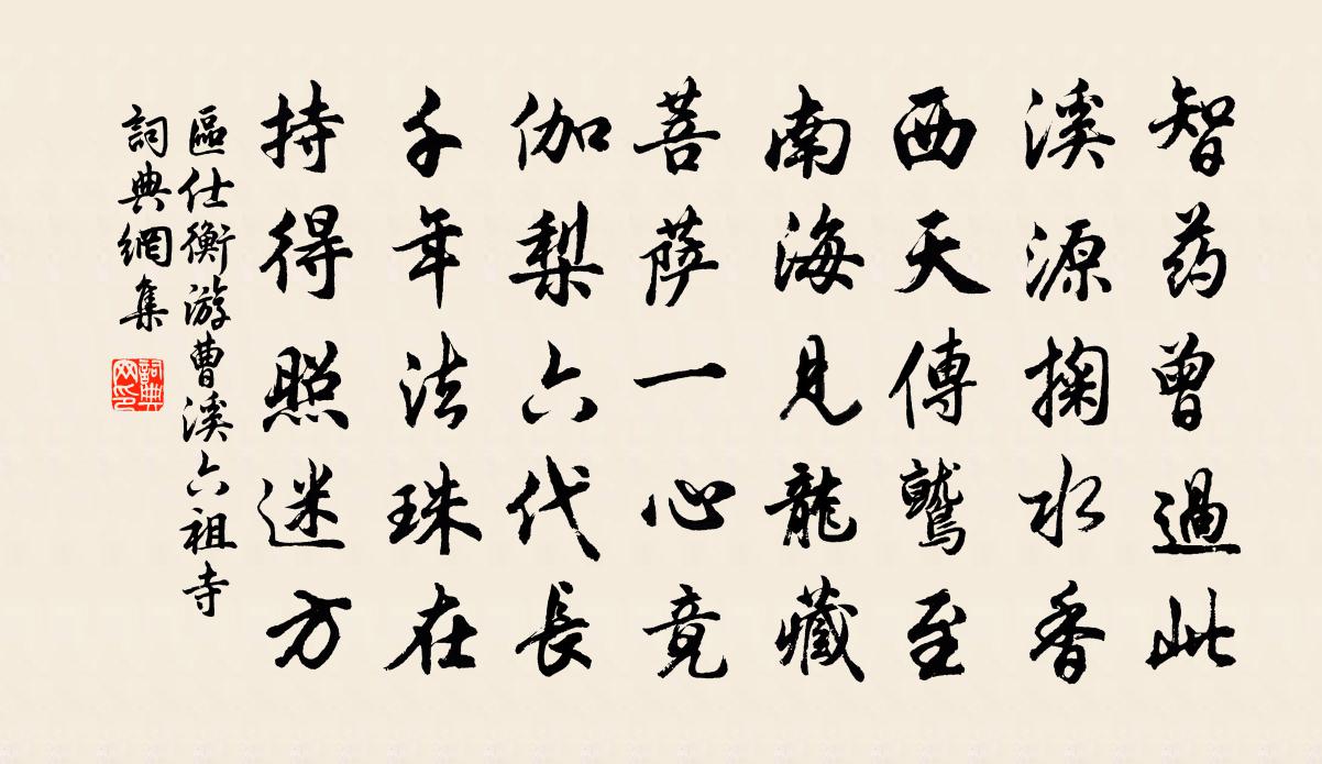 詩詞名句歷史字典書法欣賞書法字典國語詞典說文解字康熙字典古漢語字典標 題 作 者 詩 句 游曹溪六祖寺作者:區仕衡 朝代:宋代游曹溪六祖寺原文智藥曾過此,溪源掬水香。西天傳鷲至,南海見龍藏。菩薩一心竟,伽梨六代長。千年法珠在,持得照迷方。詩詞問答問:游曹溪六祖寺的作者是誰?答:區仕衡問:游曹溪六祖寺寫於哪個朝代?答:宋代區仕衡游曹溪六祖寺書法欣賞游曹溪六祖寺書法作品詩詞推薦留別唐次山胡寅〔宋代〕占君州土負沉痾,飽聽溪山欸乃歌。季路漫傳能折獄,陽城元自拙摧科。苟逃譴責恩波厚,更喜逢迎廩粟多。珍重道旁大松人取以為明王安石〔宋代〕龍甲虬髯不可攀,亭亭千丈蔭南山。應嗟無地逃斤斧,豈願爭明爝火間。頌古四十五首釋慧遠〔宋代〕等閒饒舌話金襴,便與當頭倒剎竿。從此天倫轉無義,冷光猶自逼人寒。和祝汝玉作舉子語之句楊萬里〔宋代〕玉奴何必減花奴,省識春風作畫圖。臨水隔花看走馬,翻身射鴈落雕弧。詞場君擅傾城色,詩社儂凋覓句須。摩壘巡諸州漸次空靈戍戴叔倫〔唐代〕寒盡鴻先至,春回客未歸。蚤知名是病,不敢繡為衣。霧積川原暗,山多郡縣稀。明朝下湘岸,更逐鷓鴣飛。代簡答次中見留孔武仲〔宋代〕詩夸洞庭湖,蓋舉其粗爾。自此稍南行,更有瀟湘水。瀟湘如此流,淺深清見底。吾邑在其旁,桑麻百餘里。民經成都運司園亭十首雪峰樓楊怡〔宋代〕翛翛樓下竹,虢虢竹間水。樓高雖不見,清響長在耳。晨光露西崦,積玉照窗紙。昆閬亦何人,當從跨金鯉。泛鄱陽湖韋莊〔唐代〕四顧無邊鳥不飛, * 驚隔楚山微。紛紛雨外靈均過,瑟瑟雲中帝子歸。迸鯉似棱投遠浪,小舟如葉傍斜暉。鴟夷寄楊侍御(一作包何詩)包佶〔唐代〕一官何幸得同時,十載無媒獨見遺。今日不論腰下組,請君看取鬢邊絲。漣上題樊氏水亭高適〔唐代〕漣上鹽非所趣,鹽偶為世務鹽牽。經時駐歸棹,日夕對平川。莫論行子愁,且得主人賢。亭上鹽初熟,廚中魚每鮮老衰畏寒晨起婢輩熾炭紅焰滿室身心俱泰喜而姜特立〔宋代〕嚴晨一爐火,愛重如兼金。既已暖我軀,且復豫我心。因思孟東野,曲身長苦吟。何如貴公子,得意椒房深。贈京師少年在海陵者晁說之〔宋代〕夷門子弟逞豪華,不念西京穀雨花。走馬城東玉仙醉,著身海角敢咨嗟。春雨周邦彥〔宋代〕耕人扶耒語林丘,花外時時落一鷗。欲驗春來多少雨,野塘漫水可回舟。【越調】小桃紅_當時羅帕寫周文質〔元代〕當時羅帕寫宮商,曾寄風流況。今日樽前且休唱,斷人腸,有花有酒應難忘。香消夜涼,月明枕上,不信不思量。扇子詩李石〔宋代〕誰將弱水隔蓬萊,對酒思君眼倦開。醉夢只堪逢故舊,五更酒醒卻歸來。出遊陸游〔宋代〕來往人間不計年,一枝筇竹雪垂肩。掃除身外閒名利,師友書中古聖賢。支遁山前饒石水,葛洪井畔慘風煙。小痴挽主簿吳寧侯三首陳棣〔宋代〕德行追前輩,聲華擅一鄉。游心終藝圃,得雋屢文場。小試棲鸞政,連飛薦鶚章。傷嗟台閣地,不許暫翱翔。題嵩山逸人元丹丘山居李白〔唐代〕家本紫雲山,道風未淪落。沉懷丹丘志,沖賞歸寂寞。朅來游閩荒,捫涉窮禹鑿。夤緣泛潮海,偃蹇陟廬霍。憑雷上已日予與沈虞卿、尤延之、莫仲謙招陸務觀楊萬里〔宋代〕東風吹我入錦幄,海棠點注燕支薄。不論宜雨更宜晴,莫愁傾國與傾城。半濃半淡晚明滅,欲開未開最奇絕。只銷和張謀父游石佛山觀魏太武書賀鑄〔宋代〕中夏昔屯否,代邦天所開。鴻圖屬太武,不世英雄才。南洗洛陽血,西盪長安灰。氈車十萬乘,略地驅風雷。一葦名句推薦大丈夫處世,當埽除天下范曄《後漢書·列傳·陳王列傳》 王侯將相寧有種乎?司馬遷《史記·陳涉世家》 黃鳥翩翩楊柳垂,春風送客使人悲。高適《東平別前衛縣李寀少府 / 送前衛縣李宷少府》 君自故鄉來,應知故鄉事。王維《雜詩三首·其二》 夜雨連明春水生,嬌雲濃暖弄陰晴。蘇舜欽《初晴游滄浪亭》 孩兒立志出鄉關,學不成名誓不還。 * 《七絕·改西鄉隆盛詩贈父親》 飛鳥沒何處,青山空向人。劉長卿《餞別王十一南遊》 握手一長嘆,淚為生別滋蘇武《留別妻》 近重陽、偏多風雨,絕憐此日暄明。姚雲文《紫萸香慢·近重陽》 萬樹寒無色,南枝獨有花。道源《早梅》