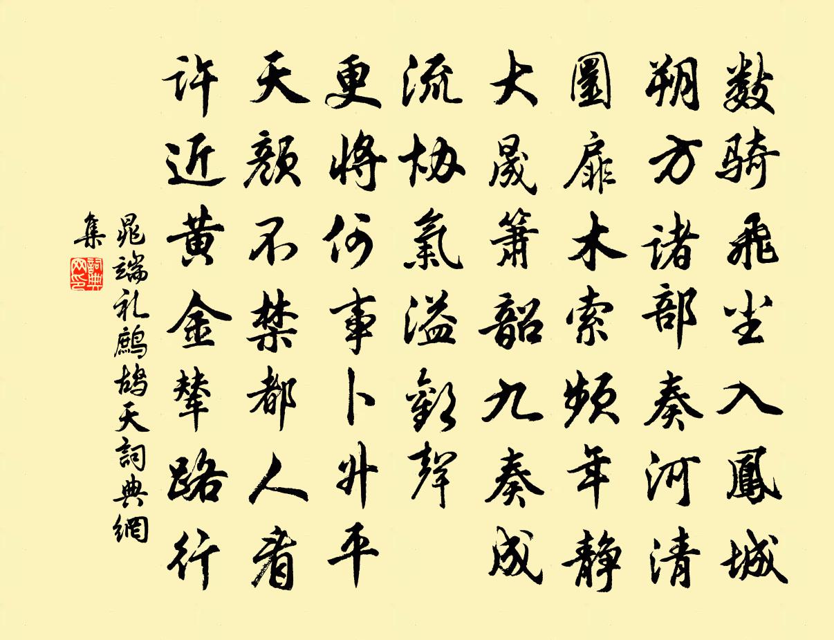 詩詞名句歷史字典書法欣賞書法字典國語詞典說文解字康熙字典古漢語字典標 題 作 者 詩 句 鷓鴣天作者:晁端禮 朝代:宋代鷓鴣天原文數騎飛塵入鳳城。朔方諸部奏河清。圜扉木索頻年靜,大晟簫韶九奏成。流協氣,溢歡聲。更將何事卜昇平。天顏不禁都人看,許近黃金輦路行。詩詞問答問:鷓鴣天的作者是誰?答:晁端禮問:鷓鴣天寫於哪個朝代?答:宋代問:鷓鴣天是什麼體裁?答:詞晁端禮鷓鴣天書法欣賞鷓鴣天書法作品詩詞推薦減字木蘭花(諸齋作真率會、又用前韻賦木蘭花令三首)沈瀛〔宋代〕陋人居止。旬一集真終日喜。先自薰風。客目輪流次第通。昔賢置酒。十老半千年紀壽。知彼由何。真處閒中日月師廷珍以詩見惠因用其韻晁公溯〔宋代〕蒼苔半蝕蔡邕碑,今日中郎有女歸。莫怪昏昏暗丘壟,浮雲淚濕不能飛。早春尋李校書元稹〔唐代〕款款春風澹澹雲,柳枝低作翠櫳裙。梅含雞舌兼紅氣,江弄瓊花散綠紋。帶霧山鶯啼尚小,穿沙蘆筍葉才分。今朝秋日懷孟夷庚羅隱〔唐代〕秋日黃陂下,孤舟憶共誰。江山三楚分,風雨二妃祠。知己秦貂沒,流年賈鵩悲。中原正兵馬,相見是何時。知邵武縣禱雨大有感應任滿作詩紀其事張士遜〔宋代〕乞靈曾爇一爐煙,言下滂沱救旱田。今日解龜留數字,要教來者更恭虔。鷓鴣天(新春)葛勝仲〔宋代〕玉琯還飛換歲灰。定山新棹酒船回。年時梁燕雙雙在,肯為人愁便不來。衰意緒,病情懷。玉山今夜為誰頹。年時小春言懷華岳〔宋代〕桃李生香花滿溪,南州十月尚襜長。春從酒罋榨將出,秋在詩囊帶得歸。弓射十分方破的,棋高一著便爭機。勸君雪後宿王純池州草堂耿湋〔唐代〕宿君湖上宅,琴韻靜參差。夜雪入秋浦,孤城連貴池。流年看共老,銜酒發中悲。良會應難再,晨雞自有期。西江月朱敦儒〔宋代〕澹澹薰風庭院,青青過雨園林。銅駝陌上舊鶯聲。今日江邊重聽。落帽酒中有趣,題橋琴里無心。香殘瀋水縷煙輕揚子江文天祥〔宋代〕幾日隨風北海游,回從揚子大江頭。臣心一片磁針石,不指南方不肯休。疇依王柏〔宋代〕生民以來,未有孔子。金聲玉振,始終條理。五經之道,天地同流。立此人極,萬世東周。登玄元廟皇甫冉〔唐代〕古廟川原迥,重門禁籞連。海童紛翠蓋,羽客事瓊筵。御路分疏柳,離宮出苑田。興新無向背,望久辨山川。物外四言贈兄秀才入軍詩 其十一嵇康〔兩漢〕凌高遠盻。俯仰咨嗟。怨彼幽縶。室邇路遐。雖有好音。誰與清歌。雖有姝顏。誰與發華。仰訊高雲。俯托輕波。歲朝方岳〔宋代〕青山不似歲華老,白酒最於鷗鳥親。十事九休書作崇,百無一有硯生春。貧中只是尋常日,醉裹何知見在身。卻喜山信至說平泉別墅草木滋長地轉幽深悵然思歸復此作李德裕〔唐代〕忽聞樵客語,暫慰野人心。幽徑芳蘭密,閒庭秀木深。麇麚來澗底,鳧鵠遍川潯。誰念滄溟上,歸歟起嘆音。送明甫赴銅鉛場六言七首劉克莊〔宋代〕旦市有攫金者,地靈豈愛寶哉。零陵貪而乳盡,合浦清而蚌回。重九前五日再游翟園楊萬里〔宋代〕翟園不到才幾日,寒梢冷葉秋簫瑟。只有黃花數點明,上照青松下蒼石。記得春頭來此嬉,梅花太瘦杏花肥。巷南書懷四首胡宏〔宋代〕秋風送盡炎威,日色淒涼半掩。皇天不斷春工,紅我芙蓉萬點。次韻郭帥梅三首陳造〔宋代〕客子徒煩賦憶梅,怯寒未肯臘前開。定知酒處頻回首,有待江南信使來。移居深山謝別親故劉商〔唐代〕不食黃精不採薇,葛苗為帶草為衣。孤雲更入深山去,人絕音書雁自飛。名句推薦半天涼月色,一笛酒人心。袁枚《夜過借園見主人坐月下吹笛》 參差煙樹灞陵橋,風物盡前朝柳永《少年游·參差煙樹灞陵橋》 待把酒送君,恰又清明後。何夢桂《摸魚兒·記年時人人何處》 事莫明於有效,論莫定於有證王充《論衡·卷二十三·薄葬篇》 九萬里風鵬正舉。李清照《漁家傲·天接雲濤連曉霧》 清江一曲抱村流,長夏江村事事幽。杜甫《江村》 絲槐煙柳長亭路,恨取次、分離去。惠洪《青玉案·絲槐煙柳長亭路》 美人結長想,對此心悽然。李白《折楊柳》 佳人應怪我,別後寡信輕諾。柳永《尾犯·夜雨滴空階》 物舍其所長,之其所短,堯亦有所不及矣劉向《戰國策·齊三·孟嘗君有舍人而弗悅》