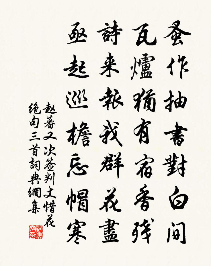詩詞名句歷史字典書法欣賞書法字典國語詞典說文解字康熙字典古漢語字典標 題 作 者 詩 句 又次簽判丈惜花絕句三首作者:趙蕃 朝代:宋代又次簽判丈惜花絕句三首原文蚤作抽書對白間,瓦爐猶有宿香殘。詩來報我群花盡,亟起巡檐忘帽寒。詩詞問答問:又次簽判丈惜花絕句三首的作者是誰?答:趙蕃問:又次簽判丈惜花絕句三首寫於哪個朝代?答:宋代趙蕃又次簽判丈惜花絕句三首書法欣賞又次簽判丈惜花絕句三首書法作品詩詞推薦送永昌蕭贊府宋之問〔唐代〕柳變曲江頭,送君函谷游。弄琴寬別意,酌醴醉春愁。戀本亦何極,贈言微所求。莫令金谷水,不入故園流。沁園春(壽許貳車)危稹〔宋代〕籍甚聲名,門闌相種,文章世科。算當年瑞世,正當夏五,仙家毓德,全是春和。底事屏星,著之海嶠,奈此騰驤杪秋夕吟懷寄宋維先輩李中〔唐代〕江島窮秋木葉稀,月高何處搗寒衣。苦嗟不見登龍客,此夜悠悠一夢飛。孔教授張法曹以曾論薦特示長箋曾鞏〔宋代〕綠髮朱顏兩少年,出倫清譽每相無。壁中字為時人圪,圯上書從老父傳。泮水笑談邀法飲,高齋閒燕屬佳篇。衰翁赤日楊億〔宋代〕赤日亭亭晝正賒,長風萬里憶星槎。銅盤瓊蕊三危露,素綆寒漿五色瓜。蘭室冷光浮玉簟,柳營清吹逐金笳。翠微三月十二日晚雨因取淵明詩微雨洗高林清飈矯滕岑〔宋代〕久雨愛晴色,久晴欣雨聲。下人自分別,上天了無情。人喜春色麗,又悲秋氣清。是皆妄心耳,四序奚虧成。臨江仙劉秉忠〔元代〕滿路紅塵飛不去,春風弄我華顛。故園桃李酒尊前。賞心逢美景,此事古難全。若智若痴人總笑,夕陽空裊吟鞭。踏莎行無題鄭燮〔清代〕中表姻親,詩文情愫,十年幼小嬌相護。不須燕子引人行,畫堂到得重重戶。顛倒思量,朦朧劫數,藕絲不斷蓮心臨蛻遺詩晏潁〔宋代〕江外三千里,人間十八年。此行誰復見,一鶴上遼天。送曾子固蘇軾梅堯臣〔宋代〕屈宋出於楚,王馬出於蜀。荀楊亦二國,自接大儒躅。各去百數年,高下非近局。鉤陳豹尾科,登俊何炳縟。楚蜀又和單丞詠梅陳宓〔宋代〕樹杪風來玉佩驚,仙香遠勝市廛清。細看一段孤高趣,恰似幽人避世情。四明越添監連日惠詩不能盡繼匠手次唐律韻以曹彥約〔宋代〕馬口為銜不自寧,轍環唯筆可深耕。門迎滄海襟期闊,地帶天潢句法清。吾道本無青白眼,世情休歡短長檠。珠璣和單令九日二絕胡寅〔宋代〕行樂從來貴及辰,況逢節物一番新。病夫久矣捐杯酌,悵望臨風落帽人。和耘老弟木犀詩韻且督漢老弟同賦虞儔〔宋代〕團餅秋光入好枝,一天風露最清時。管窺豹霧岩前隱,杯泛鵝黃月下宜。子落誰賡滄海詠,叢生應有小山知。惠連感舊絕句陸游〔宋代〕鵝黃酒邊綠荔枝,摩訶池上納涼時。冰紈不畫驂鸞女,卻寫江南白紵辭。戲題贈二小男劉長卿〔唐代〕異鄉流落頻生子,幾許悲歡並在身。欲並老容羞白髮,每看兒戲憶青春。未知門戶誰堪主,且免琴書別與人。何幸奉使常山,早次太原,呈副使吳郎中韓愈〔唐代〕朗朗聞街鼓,晨起似朝時。翻翻走驛馬,春儘是歸期。地失嘉禾處,風存蟋蟀辭。暮齒良多感,無事涕垂頤。寒菊 / 畫菊鄭思肖〔宋代〕花開不並百花叢,獨立疏籬趣未窮。寧可枝頭抱香死,何曾吹墮北風中。陳情上李景讓大夫劉得仁〔唐代〕一被浮名誤,旋遭白髮侵。裴回戀明主,夢寐在秋岑。遇物唯多感,居常只是吟。待時鉗定口,經事壓低心。辛苦天意吟邵雍〔宋代〕人能言語自能窺,天意無言人莫欺。莫道無言便無事,殆非流俗所能知。名句推薦我寄愁心與明月,隨君直到夜郎西。李白《聞王昌齡左遷龍標遙有此寄》 廉者常樂無求,貪者常憂不足。王通《中說·卷一·王道篇》 君子不以言舉人,不以人廢言。孔子弟子《論語·衛靈公篇》 依舊,依舊,人與綠楊俱瘦。秦觀《如夢令·春景》 霓裳片片晚妝新,束素亭亭玉殿春睦石《玉蘭》 江皋樓觀前朝寺,秋色入秦淮。徐再思《人月圓·甘露懷古》 雖萬被戮,豈有悔哉!班固《漢書·傳·司馬遷傳》 夜深知雪重,時聞折竹聲。白居易《夜雪》 野鴉無意緒,鳴噪自紛紛。杜甫《孤雁 / 後飛雁》 急來抱佛腳,閒時不燒香。施耐庵《水滸傳·第十七回》