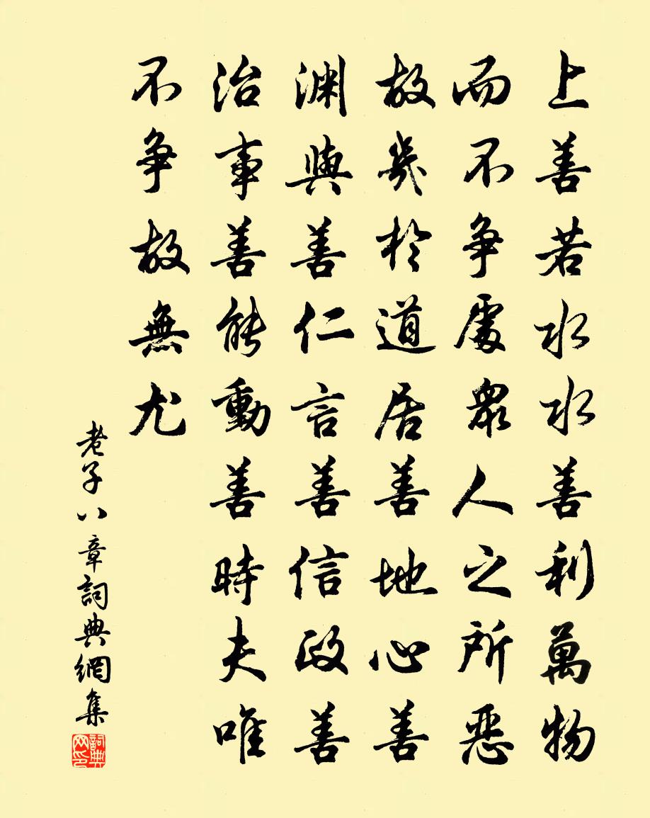 最高境界的善行就好像水一樣。水善於滋潤萬物而不與萬物相爭,停留在眾人都不喜歡的地方,所以最接近於“道”。