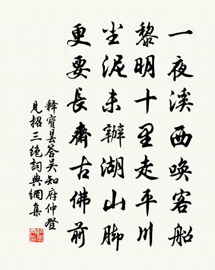 詩詞名句歷史字典書法欣賞書法字典國語詞典說文解字康熙字典古漢語字典標 題 作 者 詩 句 答吳知府仲登見招三絕作者:釋寶曇 朝代:宋代答吳知府仲登見招三絕原文一夜溪西喚客船,黎明十里走平川。塵泥未辦湖山腳,更要長齋古佛前。詩詞問答問:答吳知府仲登見招三絕的作者是誰?答:釋寶曇問:答吳知府仲登見招三絕寫於哪個朝代?答:宋代釋寶曇答吳知府仲登見招三絕書法欣賞答吳知府仲登見招三絕書法作品詩詞推薦懷素友子西韋應物〔唐代〕廣陌並游騎,公堂接華襟。方歡遽見別,永日獨沉吟。階暝流暗駛,氣疏露已侵。層城湛深夜,片月生幽林。往款感恩多牛嶠〔唐代〕兩條紅粉淚,多少香閨意。強攀桃李枝,斂愁眉。陌上鶯啼蝶舞,柳花飛。柳花飛,願得郎心,憶家還早歸。自從偈傾一百六十九首釋智朋〔宋代〕伶俐衲僧,討甚巴鼻。著腳處寸草不生,著眼時佛祖掃地。且道以何為扭,不愛南山愛鱉鼻。新婚別杜甫〔唐代〕兔絲附蓬麻,引蔓故不長。嫁女與征夫,不如棄路旁。結髮為君妻,席不暖君床。暮婚晨告別,無乃太匆忙。君行孫莘老寄墨四首蘇軾〔宋代〕吾窮本坐詩,久服朋友戒。五年江湖上,閉口洗殘債。今來復稍稍,快癢如爬疥。]先生不譏訶,又復寄詩械。幽浣溪沙沈端節〔宋代〕燈夜香甘動綺筵。明珠顆顆泛甌圓。佳人巧意底難傳。喜見翻溪流細滑,卻思信手弄輕纖。不知辛苦為誰甜。謁金門(題扇)趙彥端〔宋代〕朱檻曲。妝淺鬢雲吹綠。半尺鵝溪涼意足。手香沾柄玉。午夢已驚難續。說與翠梧修竹。蓬海路遙天六六。乘鸞何題趙繼孫拙齋方回〔宋代〕曾顏得聖傳,何謂魯與愚。外察若不足,內朗實有餘。擇樹鵲巢高,罥蟲蛛網虛。曲士挾小智,豈不雄里閭。之子春晚感情晁說之〔宋代〕春來誰挽去難援,中有悲歡萬古痕。飛絮無家凌紫極,落英不聘恨黃昏。半塗未肯擊鳴缶,百感何因招些魂。海內訴衷情(濡溪悼舊)黎廷瑞〔宋代〕曲屏深院赴幽期。心事夢雲知。佩環零亂何處,江上草離離。日平西,天似幕,月如眉。依稀還記,兩岸楊花,送紅梅 十九王冕〔元代〕昔醉西湖處士家,酒痕吹上水邊花。東風蛺蝶 * 夢,一樹珊瑚月影斜。登慈恩絕頂有感許月卿〔宋代〕為學平生不究源,未妨絕頂上慈恩。塔高俯視群山小,江闊能容巨浪喧。人每中登難腳力,誰於高處領天根。須信游雲門詹騤〔宋代〕輕裘肥馬春三月,到此經游花正紅。欲覓上方幽隱處,老僧笑指白雲中。嚴提舉輓詩戴表元〔宋代〕判得身煨爐,歌銘尚爾為。可憐蟬脫蛻,還許豹留皮。剡水歸來棹,柯山看斷棋。平生獨心處,臨卷費相思。青城山汪元量〔宋代〕敕使穿雲破濕苔,水邊坐石更行杯。翩翩野鶴飛如舞,冉冉岩花笑不來。亂木交柯盤聖井,數峰削玉並仙台。平明將赴湖州留題亭菊杜牧〔唐代〕陶菊手自種,楚蘭心有期。遙知渡江日,正是擷芳時。【雙調】殿前歡_春晚怨春遲張可久〔元代〕春晚怨春遲,夜來風雨妒芳菲。西湖雲錦吳山翠,正好傳杯。蘭舟畫槳催,柳外鶯聲碎,花底佳人醉。攜將酒去,畬田行劉禹錫〔唐代〕何處好畬田,團團縵山腹。鑽龜得雨卦,上山燒臥木。驚麏走且顧,群雉聲咿喔。紅焰遠成霞,輕煤飛入郭。風引城南縣尉水亭得長字蘇軾〔宋代〕兩尉郁相望,東西百步場。插旗蒲柳市,伐鼓水雲鄉。已作觀魚檻,仍開射鴨堂。瀲瀲波頭細,疏疏雨腳長。全家游東禪院郭之義〔宋代〕地去關城遠,無人伴訪尋。泉流溪路窄,石聳洞門深。紫翠煙嵐懋,清涼竹樹陰。重來應更□,□日解塵襟。名句推薦喚起一天明月,照我滿懷冰雪,浩蕩百川流。辛棄疾《水調歌頭·和馬叔度游月波樓》 治強生於法,弱亂生於阿。韓非及後人《韓非子·外儲說右下》 夜來南風起,小麥覆隴黃。白居易《觀刈麥》 冰雪林中著此身,不同桃李混芳塵;王冕《白梅》 吳興才人怨春風,桃花滿陌千里紅。李賀《送沈亞之歌·並序》 短長亭子短長橋,橋外垂楊一萬條。錢枚《憶王孫·短長亭子短長橋》 黃花深巷,紅葉低窗,淒涼一片秋聲。蔣捷《聲聲慢·秋聲》 雁行緣石徑,魚貫度飛梁。鮑照《代出自薊北門行》 善為吏者樹德,不善為吏者樹怨。韓非及後人《韓非子·外儲說左下》 形影忽不見,翩翩傷我心。曹植《雜詩六首·其一》