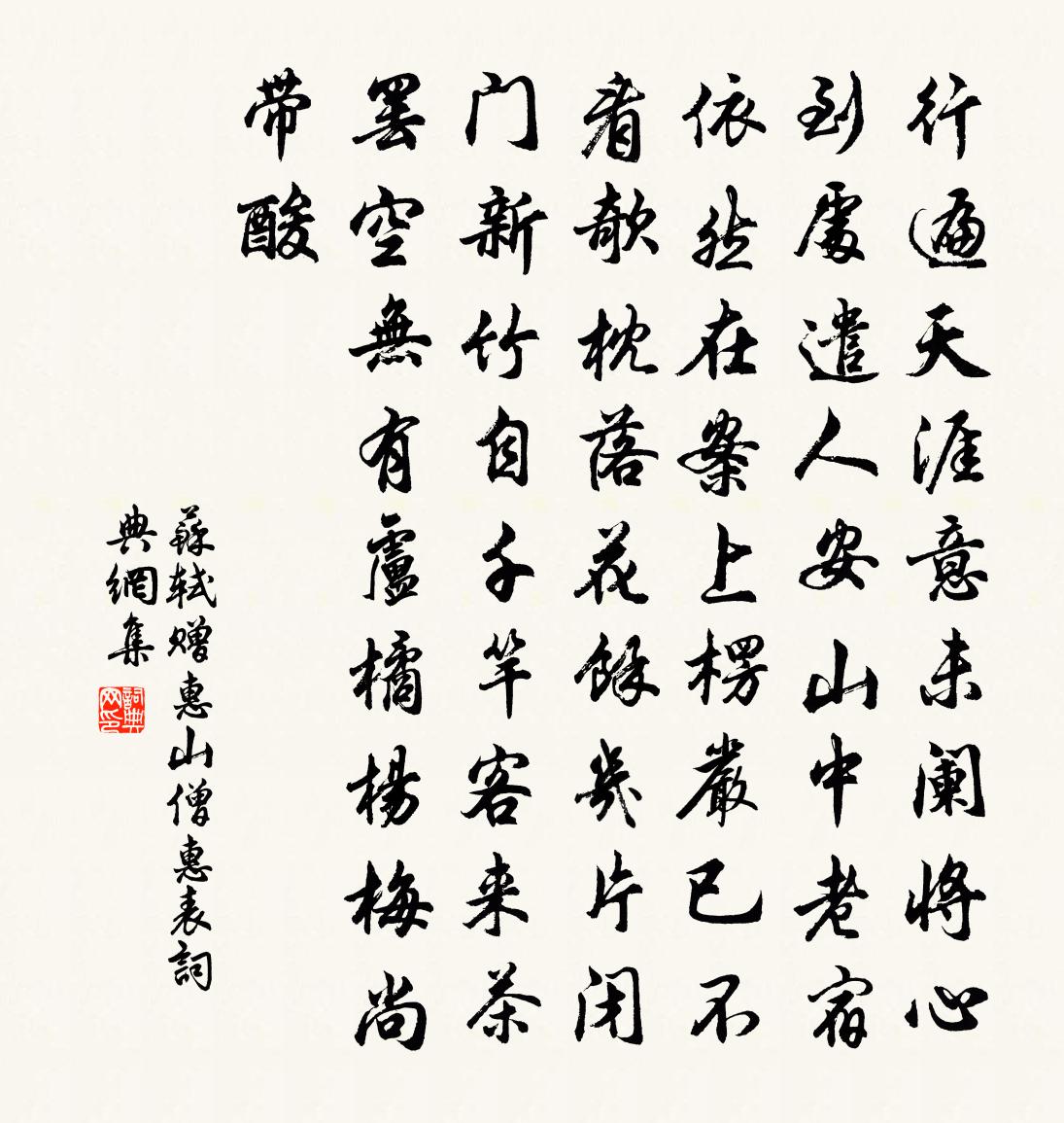 詩詞名句歷史字典書法欣賞書法字典國語詞典說文解字康熙字典古漢語字典標 題 作 者 詩 句 贈惠山僧惠表作者:蘇軾 朝代:宋代贈惠山僧惠表原文行遍天涯意未闌,將心到處遣人安。山中老宿依然在,案上《楞嚴》已不看。欹枕落花餘幾片,閉門新竹自千竿。客來茶罷空無有,盧橘楊梅尚帶酸。詩詞問答問:贈惠山僧惠表的作者是誰?答:蘇軾問:贈惠山僧惠表寫於哪個朝代?答:宋代問:蘇軾的名句有哪些?答:蘇軾名句大全蘇軾贈惠山僧惠表書法欣賞贈惠山僧惠表書法作品注釋蘇軾詩集 卷十詩詞推薦題天長阮少府湖上客歸法振〔唐代〕孤棹移官舍,新農寄楚田。晴林渡海日,春草長湖煙。臥對閒鷗戲,談經稚子賢。佳期更何許,應向嘯台前。用坡仙梅花十韻愛梅劉黻〔宋代〕被酒閒憑茗主和,惱人風動不消多。月高片影橫窗上,夜半無眠客奈何。春日與裴迪過新昌里訪呂逸人不遇王維〔唐代〕桃源一向絕風塵,柳市南頭訪隱淪。到門不敢題凡鳥,看竹何須問主人。城上青山如屋裡,東家流水入西鄰。閉戶偈頌一百五十首釋心月〔宋代〕混不得,類不齊,六爻宛轉見重離。夜深下視千山白,不是其中人不知。焦山寺林景熙〔宋代〕山裹中流小梵林,寶蓮鰲背翠沈沈。半空但覺煙嵐合,三面不知風浪深。仙井浴丹開曉日,海門浮玉澹秋陰。洞深和得故人書張耒〔宋代〕來書才一紙,離別意何長。應為相思苦,還能細作行。水浮新恨闊,花想舊容芳。欲問人何處,青樓在帝鄉。題六一東坡像晁說之〔宋代〕眉山凝間氣,渤海識茲人。一代執鞭士,千秋折角巾。高趨周室輔,平處漢廷臣。白首齊明易,鴻鈞異撫辰。參差山中李鹹用〔唐代〕一簇煙霞榮辱外,秋山留得傍檐楹。朝鐘暮鼓不到耳,明月孤雲長掛情。世上路岐何繚繞,水邊蓑笠稱平生。尋思餞唐永昌赴任東郡自尚書郎為令李適適〔唐代〕聞道飛鳧向洛陽,翩翩矯翮度文昌。因聲寄意三花樹,少室岩前幾過香。游朝陽洞次孫機宜韻張自明〔宋代〕綠野年來喜有秋,行春到處小淹留。朝陽亭上初披霧,水月冉中更枕漢。竹徑不容周俗駕,桃蹊還泊晉漁舟。遨頭西湖舊夢汪元量〔宋代〕帝城官妓出湖邊,盡作軍裝斗畫船。奪得錦標權遺喜,金銀關會賞嬋娟。述懷華岳〔宋代〕我生胸次不塵埃,不學兒遭遇旬自媒。詩料雖憑風月制,宦途還聽鬼神開。十年教養猷初壯,半世功名念已灰。安雜曲歌辭。太和第一佚名〔唐代〕國門卿相舊山莊,聖主移來宴綠芳。簾外輾為車馬路,花間踏出舞人場。和伯父仲球立春即事二首王之道〔宋代〕對雪酬春付酒杯,兵余真似復然灰。路通千里傳書去,人喜三軍破賊回。梅萼封檀香未徹,湖聲撞玉凍初開。疏籬讀漢史劉應時〔宋代〕彭蠡萬頃波,胥江八月濤。所蓄蓋有素,末流故滔滔。君子貴養源,毋事駕說勞。漢祖過百人,心動疑貫高。田孟和吳九王二十八雪詩韓維〔宋代〕方冬氣潛溫,得晚陰始重。狂隨風力翻,怒若雲面涌。中微玉霏屑,後盛毛紛氄。寒光動城闕,甘滋入田壟。鵬騫陪王仙卿登樓白玉蟾〔宋代〕身在煙霞縹緲間,此心已學白雲閒。遣懷把酒自酌月,無事捲簾常看山。老去棋冤休死戰,年來詩債逐時還。於今贈九華李丹士翁卷〔宋代〕行遍東南地,曾看江水源。袖藏勾漏藥,身是老君孫。去住雲相似,枯榮事不論。九華峰最碧,相對舊柴門。九江北岸遇風雨白居易〔唐代〕黃梅縣邊黃梅雨,白頭浪裏白頭翁。九江闊處不見岸,五月盡時多惡風。人間隱路應無限,何事拋身在此中?病後晨興食粥戲書陸游〔宋代〕蝴蝶莊周安在哉!達人聊借作嘲詼。不知自此隨緣住,更把晨窗粥幾杯?名句推薦當年志氣俱消盡,白髮新添四五莖。薛逢《長安夜雨》 麋鹿成群,虎豹避之;飛鳥成列,鷹鷲不擊劉向《說苑·雜言》 清愁滿眼共誰論。卻應台下草,不解憶王孫。李之儀《臨江仙·登凌歊台感懷》 東武望餘杭,雲海天涯兩渺茫。蘇軾《南鄉子·和楊元素時移守密州》 有兼聽之明,而無矜奮之容;有兼覆之厚,而無伐德之色。荀子《荀子·正名》 撥雲尋古道,倚石聽流泉。李白《尋雍尊師隱居》 天之生民,非為君也;天之立君,以為民也。荀子《荀子·大略》 黃鶯不語東風起,深閉朱門伴舞腰。溫庭筠《楊柳八首·其三》 君安游兮西入秦,願為影兮隨君身。傅玄《車遙遙篇》 惱他香閣濃睡,撩亂有啼鶯。晏殊《訴衷情·東風楊柳欲青青》