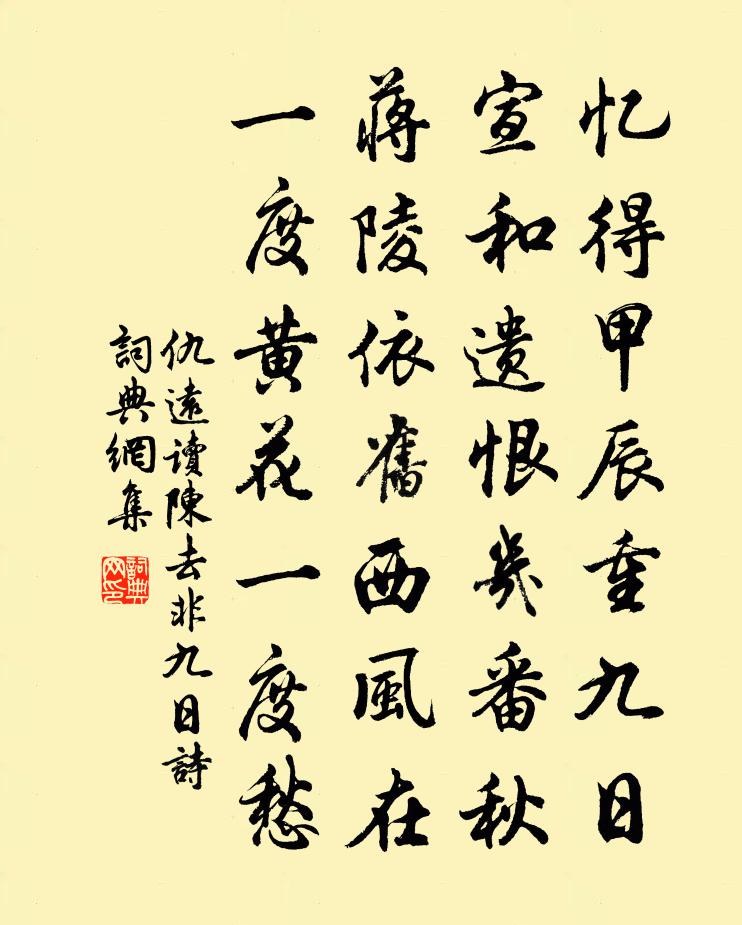 詩詞名句歷史字典書法欣賞書法字典國語詞典說文解字康熙字典古漢語字典標 題 作 者 詩 句 讀陳去非九日詩作者:仇遠 朝代:宋代讀陳去非九日詩原文憶得甲辰重九日,宣和遺恨幾番秋。蔣陵依舊西風在,一度黃花一度愁。詩詞問答問:讀陳去非九日詩的作者是誰?答:仇遠問:讀陳去非九日詩寫於哪個朝代?答:宋代仇遠讀陳去非九日詩書法欣賞讀陳去非九日詩書法作品詩詞推薦謁金門(昔游)毛滂〔宋代〕燈霧裡。老去昔游不記。月似舊時人不似。小樓何處是。歸臥晚香翠被。玉酒著人小醉。欲睡先來都不睡。此情那登四徹亭蔡襄〔宋代〕偶爾尋幽上翠微,遊人啼鳥似前期。花間行印露沾紙,山下放衙雲滿旗。艷 * 衣朝日處,飄飄商櫓落潮時。傳杯題四畫清湖驟雨胡寅〔宋代〕銀竹森空映,湖樂隊莽中。不因風捲去,那得見沖融。端午內中帖子詞皇后閣王珪〔唐代〕金屋風光別,仍逢令節新。爭傳九子粽,皇祚續千春。疇甫叔輓詩二首洪咨夔〔宋代〕南渡幾年裹,深山誰力書。獨君酣百戰,許我丐三餘。參斗明燈爐,湖江渴硯蜍。斯人猶不第,天理竟何如。詠安仁宰搗蒜蔣貽恭〔唐代〕安仁縣令好誅求,百姓脂膏滿面流。半破磁缸成醋酒,死牛腸肚作饅頭。帳生歲取餐三頓,鄉老盤庚犯五甌。半醉送春白玉蟾〔宋代〕草木從交代,溪山無故新。更斟些子酒,尚是霎時春。雨止鶯如怨,花飛柳亦顰。東皇催上印,生怕子規嗔。越調 鬥鵪鶉王實甫〔元代〕玉宇無塵,銀河瀉影。月色橫空,花陰滿庭。羅袂生寒,芳心自警。側著耳朵兒聽,躡著腳步兒行。悄悄冥冥,潛內直奉寄聖俞博士歐陽修〔宋代〕千門鑰入斷人聲,樓閣沉沉夜氣生。獨直偏知宮漏永,稍寒尤覺玉堂清。霜雲映月鱗鱗色,風葉飛空摵摵鳴。犬馬振鷺佚名〔先秦〕振鷺于飛,於彼西雍。我客戾止,亦有斯容。在彼無惡,在此無斁。庶幾夙夜,以永終譽。赴李少府莊失路皇甫冉〔唐代〕君家南郭白雲連,正待情人弄石泉。月照煙花迷客路,蒼蒼何處是伊川。扇蘇軾〔宋代〕團扇經秋似敗荷,丹青彷佛舊松蘿。一時用舍非吾事,舉世炎時奈爾何。寄高恥堂趙汝騰〔宋代〕江西格了使湖南,又似當年朱晦庵。問學如公真少輩,請將大道講氈談。中秋夜隴州徐常侍座中詠月無可〔唐代〕隴城秋月滿,太守待停歌。與鶴來松杪,開煙出海波。氣籠星欲盡,光滿露初多。若遣山僧說,高明不可過。嘉禾百詠竹橋張堯同〔宋代〕腰枕政亭北,橫斜古渡頭。風吹雙淚落,恨逐水東流。桃花坑山釋鑒〔宋代〕地僻人居少,林深路轉迷。桃花流水細,不異武陵溪。寄周文清賀鑄〔宋代〕節物驚心不我留,故人相望海邊州。苦荷老盡池台晚,鴻雁來多雲漢秋。誰共清樽尋樂事,獨將長幅寫離憂。明年和襲美重題薔薇陸龜蒙〔唐代〕穠華自古不得久,況是倚春春已空。更被夜來風雨惡,滿階狼藉沒多紅。四月望再游西湖十首陳造〔宋代〕十字街頭托缽盂,雁鵝食口待朝脯。我來欲序睽違意,要問揚州米價無。雜詩三首黎廷瑞〔宋代〕后稷播百穀,粒茲阻飢人。新苗化為舊,舊種還為新。萬代一粒傳,何嘗失其真。君看田中秋,穗穗上古春。太極名句推薦會桃花之芳園,序天倫之樂事李白《春夜宴桃李園序/春夜宴從弟桃花園序》 春心莫共花爭發,一寸相思一寸灰!李商隱《無題·颯颯東風細雨來》 疏籬下、試覓重陽,醉擘青露菊。吳文英《一寸金·秋感》 妾身悔作商人婦,妾命當逢薄倖夫。徐再思《陽春曲·閨怨》 天長地久有時盡,此恨綿綿無絕期。白居易《長恨歌》 兼聽之明,而無矜奮之容;有兼覆之厚,而無伐德之色。荀子《荀子·正名》 明月照積雪,朔風勁且哀。謝靈運《歲暮》 處世不退一步處,如飛蛾投燭、羝羊觸藩,如何安樂?洪應明《菜根譚·概論》 君看石芒碭,掩淚悲千古李白《丁督護歌》 烏絲闌紙嬌紅篆,歷歷春星。納蘭性德《紅窗月·燕歸花謝》