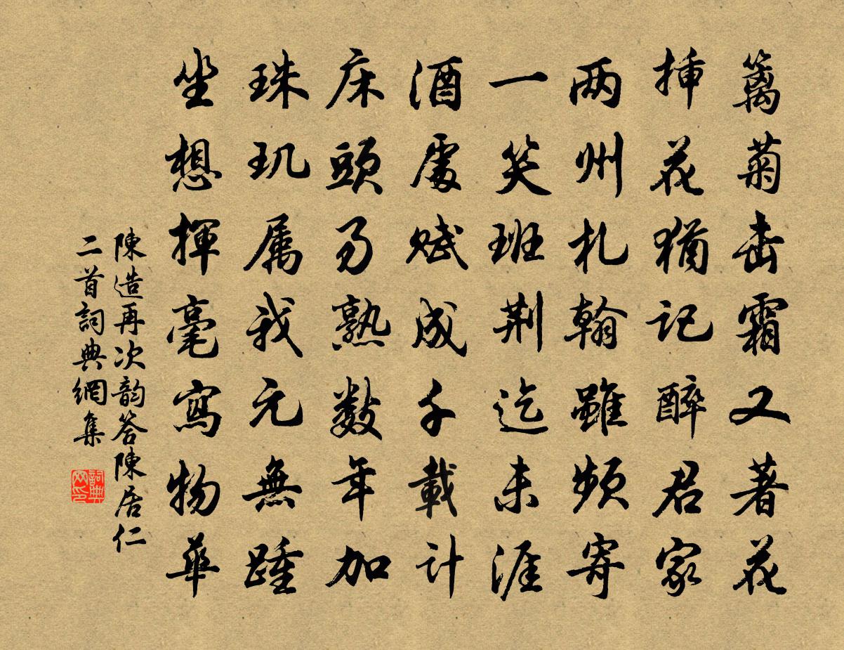 詩詞名句歷史字典書法欣賞書法字典國語詞典說文解字康熙字典古漢語字典標 題 作 者 詩 句 再次韻答陳居仁二首作者:陳造 朝代:宋代再次韻答陳居仁二首原文籬菊擊霜又著花,插花猶記醉君家。兩州札翰雖頻寄,一笑班荊迄未涯。酒處賦成千載計,床頭易熟數年加。珠璣屬我元無踵,坐想揮毫寫物華。詩詞問答問:再次韻答陳居仁二首的作者是誰?答:陳造問:再次韻答陳居仁二首寫於哪個朝代?答:宋代陳造再次韻答陳居仁二首書法欣賞再次韻答陳居仁二首書法作品詩詞推薦歸建溪鄢玉庭〔宋代〕歸去寒溪覓舊盟,相逢詩酒足娛情。閒雲不礙青山好,物外風高夢自清。將築南屋借功田家蘇轍〔宋代〕先人敞廬寄西南,不歸三紀今何堪。卜營菟裘閱歲三,西成黍豆余石甔。借功田家並钁杴,農事未起來不嫌。並遣夢峽蘇泂〔宋代〕未定還家樂,仍思去國情。猿枝樓閣影,龍府佩環聲。水漩欹斜碧,山搖突兀晴。分明昨夜夢,百丈峽中行。句李良臣〔宋代〕勿貽麟楦笑,千古愧公卿。簡雪窗重寺丞周端臣〔宋代〕聖賢事業在心槃,禹稷顏回豈異觀。世故波潤同起減,姓名千古要清寒。山村經行因施藥陸游〔宋代〕兒扶一老侯溪邊,來告頭風久未痊。不用更求芎芷輩,吾詩讀罷自醒然。大衍易吟四十首方回〔宋代〕謂今三畫卦,不自偶奇生。便指三為八,徒功口舌爭。浣溪沙·淡盪春光寒食天李清照〔宋代〕淡盪春光寒食天。玉爐瀋水裊殘煙。夢回山枕隱花鈿。海燕未來人鬥草,江海已過柳生綿。黃昏疏雨濕鞦韆。讀《陰符經》齊己〔唐代〕繞窗風竹骨輕安,閒借陰符仰臥看。絕利一源真有謂,空勞萬卷是無端。清虛可保升雲易,嗜欲終知入聖難。三要翰林將指下學峽賓聲叟為諸友先雨雪載途民亦方逢振〔宋代〕空山雪片大如盤,有客遠在孤館眠。翰林喝馬不到地,白帝叱馭親行鞭。疾驅滕六笞飛廉,六花急舞狂且顛。玉皇和虞使君賦山茶花二首程公許〔宋代〕梅花蘸碧江當,似怪高人金玉音。詠絮可憐清寡伴,冠霞來與共論心。定知名迫瓊瑤響,莫情杯浮琥珀深。姑射清偈傾一百三十三首釋法薰〔宋代〕雲門一棒,高峰三拜。一家不如一家,各自保守疆界。浪淘沙令(祝壽)史浩〔宋代〕祝壽祝壽。筵開錦繡。拈起香來玉也似手。拈起盞來金也似酒。祝壽祝壽。命比乾坤久。長壽長壽。松椿自此碧森謁烏龍廟陳允平〔宋代〕斷碑猶紀唐時事,山氣陰沉暗綠苔。松木已逾千歲壽,香菸知化幾爐灰。廊深無月鬼神過,殿古有雲風雨來。曲曲寄朱樂仲黃庭堅〔宋代〕故人昔在國北門,鄰舍杖藜對樽酒。十五年余乃一逢,黃塵急流語馬首。懶書愧見南飛鴻,君居三十六峰東。我心山泉煎茶有懷白居易〔唐代〕坐酌泠泠水,看煎瑟瑟塵。無由持一碗,寄與愛茶人。青玉案 喝馬譚處端〔元代〕師真引入修行路。默默無言句。慢慢持修歸真素。般般返照盡成空,馬兒悟。證內外無塵慮。真清真淨投真處。細素梅 四七王冕〔元代〕地老天荒盡可花,不同桃李競繁華。要知鼎鼐調羹味,須問舊時丞相家。寄題魯郎中遂隱堂吳芾〔宋代〕老向江頭強剖符,夢魂長是繞吾廬。正慚我未成歸計,卻羨君先遂隱居。湖上煙雲常縹緲,園中花木總扶疏。他時觸事虞儔〔宋代〕綠匣何煩至,黃衣尚有雲。催科寧是拙,稼穡亦良勤。當念溝中瘠,難專柱後文。誰令公喜怒,雁鶩政紛紛。名句推薦無一語,對芳尊。安排腸斷到黃昏。秦觀《鷓鴣天·枝上流鶯和淚聞》 博學之,審問之,慎思之,明辨之,篤行之。子思《中庸·第二十章》 城上高樓接大荒,海天愁思正茫茫。柳宗元《登柳州城樓寄漳汀封連四州》 營州少年厭原野,狐裘蒙茸獵城下。高適《營州歌》 悵望千秋一灑淚,蕭條異代不同時。杜甫《詠懷古蹟五首·其二》 黃河遠上白雲間,一片孤城萬仞山。王之渙《涼州詞二首·其一》 示上以足,示下以惠,怨自削減。來俊臣《羅織經·固榮卷第六》 人生有情淚沾臆,江水江花豈終極!杜甫《哀江頭》 借問江潮與海水,何似君情與妾心?白居易《浪淘沙·借問江潮與海水》 長安一片月,萬戶搗衣聲。李白《子夜吳歌·秋歌》
