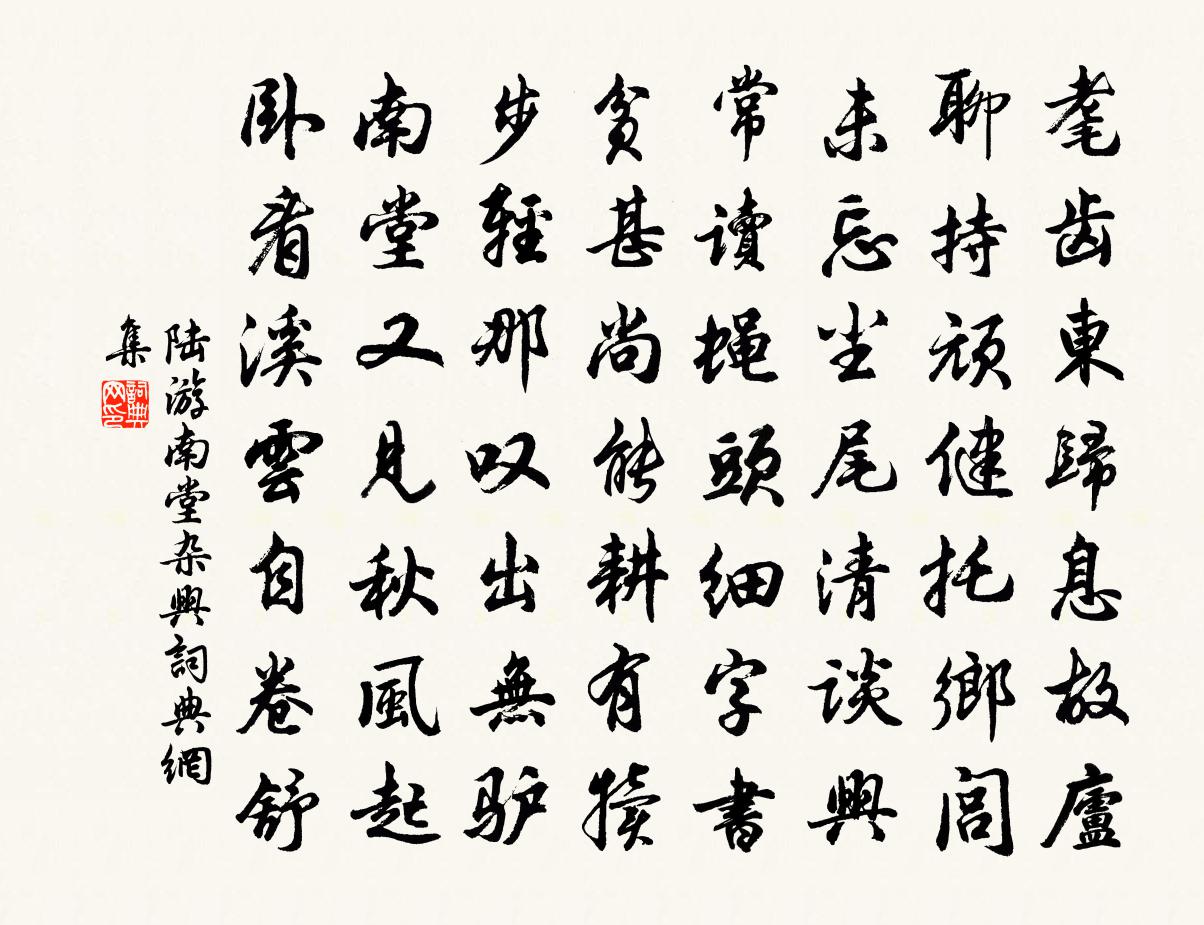 詩詞名句歷史字典書法欣賞書法字典國語詞典說文解字康熙字典古漢語字典標 題 作 者 詩 句 南堂雜興作者:陸游 朝代:宋代南堂雜興原文耄齒東歸息故廬,聊持頑健托鄉閭。未忘塵尾清談興,常讀蠅頭細字書。貧甚尚能耕有犢,步輕那嘆出無驢?南堂又見秋風起,臥看溪雲自卷舒。詩詞問答問:南堂雜興的作者是誰?答:陸游問:南堂雜興寫於哪個朝代?答:宋代問:陸游的名句有哪些?答:陸游名句大全陸游南堂雜興書法欣賞南堂雜興書法作品詩詞推薦秋賦有期因寄襲美(時將主試貢士)陸龜蒙〔唐代〕雲似無心水似閒,忽思名在貢書間。煙霞鹿弁聊懸著,鄰里漁舠暫解還。文草病來猶滿篋,藥苗衰後即離山。廣寒壟穴遺詩沈廷瑞〔唐代〕虛勞營殯玉山前,殯後那知已脫蟬。應是元神歸洞府,更與遺魄在黃泉。靈台已得修真訣,塵世空留悟道篇。堪嘆句劉卞〔宋代〕木圍三寺影,川合兩江波。香林四首陳與義〔宋代〕絕愛公家花氣新,一林清露百般春。是中宴坐應容我,只恐微風喚起人。和宋太史北樓新亭孟浩然〔唐代〕返耕意未遂,日夕登城隅。誰道山林近,坐為符竹拘。麗譙非改作,軒檻是新圖。遠水自嶓冢,長雲吞具區。願隨壺中天(懷霅·友)張炎〔宋代〕異鄉倦旅,問扁舟東下,歸期何日。琴劍空隨身萬里,天地誰非行客。李杜飄零,羊曇悲感,回首俱陳跡。羈懷難西江月徐儼夫〔宋代〕曲折迷春院宇,參差近水樓台。 * 人去燕歸來。空有落梅香在。花底三更過雨,酒闌一枕驚雷。明朝飛夢隔天涯何太博知晉州楊億〔宋代〕平明東省發魚書,便擁彤襜出上都。別酒金英泛籬菊,去程黃葉墮關榆。叔孫舊禮妨綿蕝,廉范新歌待袴襦。滿腹秋日焚香讀書戲作陸游〔宋代〕世事無端自糾紛,放翁隱几對爐熏。好官何恨輸玄保,奇字猶須屬子云。婆律一銖能敵國,水沉盈握有兼斤。閉門情詩其十倉央嘉措〔清代〕掌上明珠價幾何,無心未曾思量著。一朝歸攜他人袖,那時傷情淚痕多。逍遙詠宋太宗〔宋代〕乾坤之內隱長生,藥變還丹道已成。救世神方堪自秘,樂耶語話勿相輕。眠雲臥水通玄識,點石為金誰辯明。黃老晚坐和韻仲並〔宋代〕醉眠全醒病亦醒,虛齋危坐聽無聲。錦囊欲報清新句,自笑常談只老生。蝶戀花·初捻霜紈生悵望晏幾道〔宋代〕初捻霜紈生悵望,隔葉鶯聲,似學秦娥唱。午睡醒來慵—晌,雙紋翠簟鋪寒浪。雨罷蘋風吹碧漲,脈脈荷花,淚臉晚投大雲峰二首李彌遜〔宋代〕高樹風生晚徑秋,平沙無日下鳧鷗。野航邀月渡溪北,古寺僧歸鍾殷樓。嘲清德堂前紫薇花仍代答程公許〔宋代〕文章不辨演絲綸,失腳塵勞勿更論。茵壤飛花適然耳,一觴聊復伴黃昏。無夢令馬鈺〔元代〕信步如同雲水。看遍秦川入水。不似棟樑間,萬派逆留神水。神水。神水。便是山侗真水。水龍吟姬翼〔元代〕萬塵諸累重重,一時穎脫如懸解。青鞋拄杖,鶉衣百衲,沿身輕快。南北東西,浪萍風梗,去留何礙。許昂簪笑傲曲玉管·隴首雲飛柳永〔宋代〕隴首雲飛,江邊日晚,煙波滿目憑闌久。一望關河蕭索,千里清秋,忍凝眸?杳杳神京,盈盈仙子,別來錦字終難枕上聞杜宇曹勛〔宋代〕催曉鍾殘景氣清,杜鵑聲里夢魂驚。山林廣袤不知樂,猶作不如歸去聲。夜坐觀星戴良齊〔宋代〕中夜不能旦,浩蕩思無期。茫茫宇宙間,俯仰伊何時。起坐憑前欄,粲粲天南垂。寒芒燭辰尾,歲德何所司。耿耿名句推薦寧我負人,毋人負我。陳壽《三國志·魏書·武帝紀》 冬宜密雪,有碎玉聲。王禹偁《黃岡竹樓記》 竹徑通幽處,禪房花木深。常建《題破山寺後禪院》 柳庭風靜人眠晝,晝眠人靜風庭柳。蘇軾《菩薩蠻·回文夏閨怨》 金谷園中柳,春來似舞腰。李益《上洛橋》 屈盤戲白馬,大笑上青山。李白《登敬亭北二小山余時送客逢崔侍御並登此地》 橫眉冷對千夫指,俯首甘為孺子牛。魯迅《自嘲》 過雨西風,數葉井梧愁舞。吳文英《荔枝香近·七夕》 久廢山行疲犖确,尚能村醉舞淋浪。蘇軾《捕蝗至浮雲嶺山行疲苶有懷子由弟二首·其二》 酒醒人靜奈愁濃。殘燈孤枕夢,輕浪五更風。徐昌圖《臨江仙·飲散離亭西去》