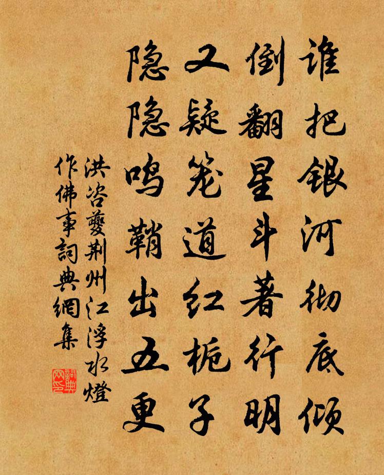 詩詞名句歷史字典書法欣賞書法字典國語詞典說文解字康熙字典古漢語字典標 題 作 者 詩 句 荊州江浮水燈作佛事作者:洪咨夔 朝代:宋代荊州江浮水燈作佛事原文誰把銀河徹底傾,倒翻星斗著行明。又疑籠道紅梔子,隱隱鳴鞘出五更。詩詞問答問:荊州江浮水燈作佛事的作者是誰?答:洪咨夔問:荊州江浮水燈作佛事寫於哪個朝代?答:宋代洪咨夔荊州江浮水燈作佛事書法欣賞荊州江浮水燈作佛事書法作品詩詞推薦題披雲閣金君卿〔宋代〕仕路無如衣彩榮,喜聞弦誦日趨庭。欲光子道兼三樂,須念家傅重一經。已敞高齋臨水鏡,更張層構倚山屏。佳名晏起韋莊〔唐代〕爾來中酒起常遲,臥看南山改舊詩。開戶日高春寂寂,數聲啼鳥上花枝。憶舍弟王翥〔宋代〕藥物吾仍病,花時汝未歸。不眠愁月落,獨立看雲飛。詩禮自持律,饑寒誰解圍。遙知理舟楫,西望涕沾衣。六月望錢時〔宋代〕一窗虛白貯嬋娟,木葉無風自颯然。誰道家山孤負月,從初看到十分圓。清平樂歐陽修〔宋代〕小庭春老。碧砌紅萱草。長憶小闌閒共繞。攜手綠叢含笑。別來音信全乖。舊期前事堪猜。門掩日斜人靜,落花愁林塘懷友王勃〔唐代〕芳屏畫春草,仙杼織朝霞。何如山水路,對面即飛花。寒中偶題胡仲參〔宋代〕酒對紅爐暖,香凝繡被溫。老天有私意,寒不到朱門。碧牡丹(王晉卿都尉宅觀舞)晁補之〔宋代〕院宇簾垂地。銀箏雁、低春水。送出燈前,婀娜腰枝柳細。步蹙香裀,紅浪隨鴛履。梁州緊鳳翹墜。悚輕體。繡帶白露為霜徐敞〔唐代〕早寒青女至,零露結為霜。入夜飛清景,凌晨積素光。駟星初皙皙,葭菼復蒼蒼。色冒沙灘白,威加木葉黃。鮮輝托人求田李復〔宋代〕綠繞隨城潏水流,百年那免問菟裘。泉甘易汲能蠲疾,土沃翻耕每報秋。欲托高人論地券,共期他日老漁舟。歸身句殷文圭〔唐代〕龍舒太守人中傑,風韻堂中心似月。眾口聲光夸漢將,築頭勳業佐淮王。古詩十九首·青青陵上柏佚名〔兩漢〕青青陵上柏,磊磊澗中石。人生天地間,忽如遠行客。斗酒相娛樂,聊厚不為保驅車策駑馬,遊戲宛與洛。洛中何偶書范成大〔宋代〕太行巫峽費車舟,休向滄溟認一漚。日下冰山難把玩,雨中土偶任漂流。元無刻木牽絲技,但合收繩卷索休。惟有溪居寓言齊己〔唐代〕秋蔬數壟傍潺湲,頗覺生涯異俗緣。詩興難窮花草外,野情何限水雲邊。蟲聲繞屋無人語,月影當松有鶴眠。寄向和存子侄長吟鄧都韻陽枋〔宋代〕江肥石沒浪壯激,水瘦石露灘無聲。叢深鹿來平都重,林槁鹿去平都輕。訊息盛衰有如此,是理見處須分明。孟叟雙闕胡融〔宋代〕朝游雙闕下,遂登雙闕上。峻壁束清溪,石扇闔奔嶂。旁通風雲氣,下蓄關鍵狀。高踰劍閣竦,狹過彭門壯。我行枕上得句寄潛君升胡仲參〔宋代〕無奈蓬窗雪打聲,夢魂才穩又還驚。枕食如許猶嫌冷,多少閻閭睡不成。永昭陵輓詞三首歐陽修〔宋代〕行殿沉沉畫翣重,淒涼挽鐸出深宮。攀號不悟龍胡遠,侍從猶穿豹尾中。日薄山川長起霧,天寒松◇自生風。斯民和人雜詠六首衛宗武〔宋代〕鐵研窮鑽研,知君用心苦。撐腸書五車,何異群玉府。粲然以成章,雲錦工織組。逸氣劘屈賈,餘子何足數。祝英台近葛長庚〔宋代〕月如酥,天似玉,長嘯弄孤影。十二樓台,昨夢暗尋省。自憐露滿衣襟,風吹毛髮,渾無寐、寒宵漏永。捧香鼎。名句推薦分明久旱逢甘雨,賽過他鄉遇故知。馮夢龍《醒世恆言·卷二十》 二月湖水清,家家春鳥鳴。孟浩然《春中喜王九相尋 / 晚春》 一春不識西湖面。翠羞紅倦。許棐《後庭花·一春不識西湖面》 登高壯觀天地間,大江茫茫去不還。李白《廬山謠寄盧侍御虛舟》 老景蕭條,送君歸去添淒斷。毛滂《燭影搖紅·送會宗》 博學篤志,切問近思,此八字是收放心的工夫王永彬《圍爐夜話·第一七六則》 柳庭風靜人眠晝,晝眠人靜風庭柳。蘇軾《菩薩蠻·回文夏閨怨》 橫看成嶺側成峰,遠近高低各不同。蘇軾《題西林壁》 何人解賞西湖好,佳景無時。歐陽修《採桑子·何人解賞西湖好》 法不阿貴,繩不撓曲。韓非及後人《韓非子·有度》