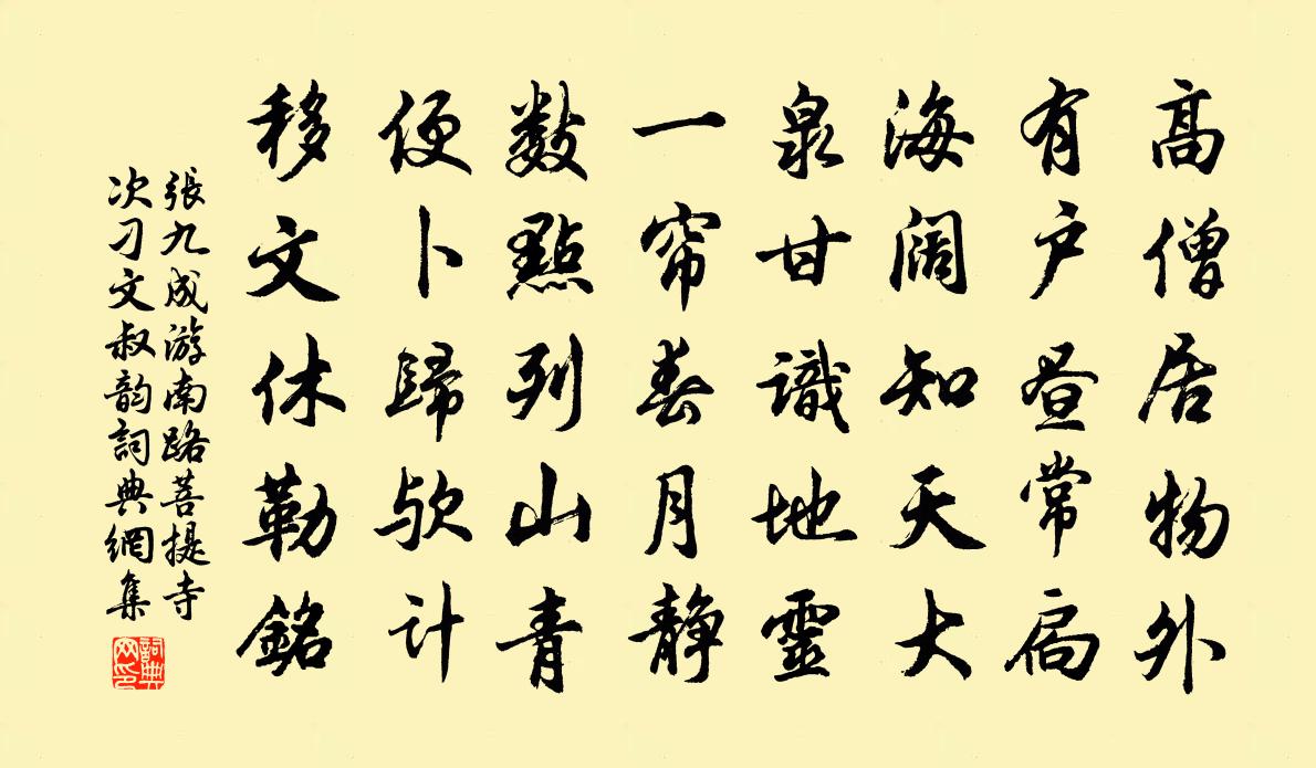 詩詞名句歷史字典書法欣賞書法字典國語詞典說文解字康熙字典古漢語字典標 題 作 者 詩 句 游南路菩提寺次刁文叔韻作者:張九成 朝代:宋代游南路菩提寺次刁文叔韻原文高僧居物外,有戶晝常扃。海闊知天大,泉甘識地靈。一簾春月靜,數點列山青。便卜歸歟計,移文休勒銘。詩詞問答問:游南路菩提寺次刁文叔韻的作者是誰?答:張九成問:游南路菩提寺次刁文叔韻寫於哪個朝代?答:宋代張九成游南路菩提寺次刁文叔韻書法欣賞游南路菩提寺次刁文叔韻書法作品詩詞推薦挽知府趙開國劉宰〔宋代〕青衫試據憶當年,傾蓋欣逢令尹賢。一遠朋從忘歲月,相思客路渺山川。政成郡國君何憾,病臥閭閻我自憐。誤喜和謝石湖先生寄二詩韻二首楊萬里〔宋代〕一張五色石湖雲,天上吹來墮小軒。化作虹橋倚鍾阜,渡將老子到吳門。黃鍾路鼓鳴清廟,玉親金支舞秦尊。乃是和先師宏智和尚五轉位頌秦宮照膽寒釋慧暉〔宋代〕岩房闐寂冷如冰,妙得冥符處處靈。轉側依忘功就位,回頭失卻楚王城。趙園飲三首陳造〔宋代〕收藏春色駐年華,珍重王孫好事家。肯挽歸驂共良夜,一天風露一林花。翠碧陸龜蒙〔唐代〕紅襟翠翰兩參差,徑拂煙華上細枝。春水漸生魚易得,莫辭風雨坐多時。臘日晚過楊村寫望汪莘〔宋代〕萬里溪光一望穿,潛魚世界白鷗天。若為移得溪光去,落日茅齋相對眠。次韻梅守著作喜守粹冬杪祈雪春初獲應之什強至〔宋代〕郡境時雖泰,江鄉臘已深。群情憂雪晚,精意喜天忱。夙駕才分禱,春空倏變陰。銀成佛氏界,瓊掩帝家林。始向題畫卷後六言二首之二鳴琴召鶴圖賀鑄〔宋代〕結茅百尺荒台,杖藜一徑莓苔。謝絕雞群老鶴,不應端為琴來。齊俗劉克莊〔宋代〕柏寢才休又雪宮,殺麋罪與 * 同。徂丘稷下人多詐,誰肯投身入阱中。呂祿廟司馬光〔宋代〕赤帝祚四百,徒然諸呂謀。山游逢友賣,未返見家收。蔽冢昔無記,遺祠今幸留。士心俱左袒,何怨曲周侯。宿山中僧顧況〔唐代〕不爇香爐煙, * 坐如鐵。嘗想同夜禪,風墮松頂雪。代人上明龍圖鄭獬〔宋代〕兇徒盜覆甘陵城,白日堂堂梟呼鳴。生靈十萬陷死地,長刀大戟交縱橫。留都丞相統河北。雷霆四馳諸侯兵。鐵林葛嶺賈似道園池湯仲友〔宋代〕檀板歌殘陌上花,過牆荊棘刺檐牙。指揮已失鐵如意,賜予寧存玉辟邪。敗屋春歸無主燕,廢池雨產在官蛙。木棉寄題趙化州清白亭胡寅〔宋代〕聞話維城刺史尊,關西夫子是師門。太清不取班超論,堅白寧同惠子言。棐幾蕭然心似寄,銀鉤精甚勢如騫。政成風月堂二首曾幾〔宋代〕青羅熨鏡正揩磨,上有虛堂發興多。大熱端能排酷吏,廣寒只合在嫦娥。又成畫舫珠簾去,可奈紅妝翠蓋何。縱使海棠花董嗣杲〔宋代〕鸚柔猩艷勝西川,有色無香意態妍。吟令美招名友聚,眠春羞並醉妃傳。錦莊紅濯垂絲雨,繡幄青籠秉燭煙。莫待劉子澄約游漢陽郎官湖子澄風雨中絕江先去余李壁〔宋代〕沔水悠悠下武昌,向來風物未淒涼。江樓還對遼天月,湖草猶分漢署香。信筆題詩輸李白,開樽一笑後劉郎。蹇余點絳唇張孝祥〔宋代〕秩秩賓筵,玉潭春漲玻璃滿。旆霞風卷。可但長安遠。夏木成陰,路裊薰風轉。空留戀。細吹銀管。別意隨聲緩。金溪道中楊萬里〔宋代〕野花垂路止人行,田水偏尋缺處鳴。近浦人家隨曲折,插秧天氣半陰晴。十絕句呈章茂深安撫陳造〔宋代〕密受眉山一印傳,斯文千載石林仙。使君酷似牢之舅,更喜鸞膠續此弦。名句推薦千里萬里,二月三月,行色苦愁人。歐陽修《少年游·欄乾十二獨憑春》 與朋友交遊,須將他們好處留心學來,方能受益王永彬《圍爐夜話·第二則》 平生不會相思,才會相思,便害相思。徐再思《折桂令·春情》 蓼岸荻花中,隱映竹籬茅舍。張昪《離亭燕·一帶江山如畫》 災人者,人必反 災之。莊子《莊子·內篇·人間世》 元宵佳節,融和天氣,次第豈無風雨。李清照《永遇樂·落日熔金》 江山如有待,花柳自無私。杜甫《後游》 今人不見古時月,今月曾經照古人。李白《把酒問月·故人賈淳令予問之》 親朋無一字,老病有孤舟。杜甫《登岳陽樓》 甚荒唐,到頭來都是為他人作嫁衣裳!曹雪芹《紅樓夢·第一回》