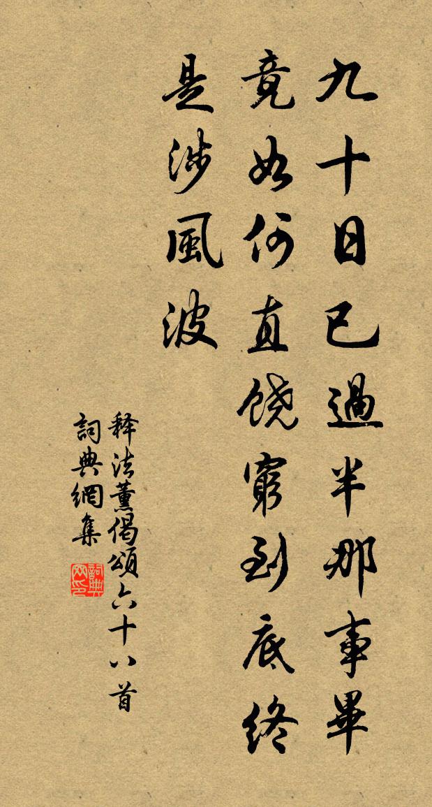 詩詞名句歷史字典書法欣賞書法字典國語詞典說文解字康熙字典古漢語字典標 題 作 者 詩 句 偈頌六十八首作者:釋法薰 朝代:宋代偈頌六十八首原文九十日已過半,那事畢竟如何。直饒窮到底,終是涉風波。詩詞問答問:偈頌六十八首的作者是誰?答:釋法薰問:偈頌六十八首寫於哪個朝代?答:宋代釋法薰偈頌六十八首書法欣賞偈頌六十八首書法作品詩詞推薦紹興甲子予待試廬陵辭曹廳是秋失解後六年乃周必大〔宋代〕未冠來隨舉子忙,當時已似失林獐。而今年貌那堪畫,手種堂前樹亦蒼。東軒長老二絕〈並序〉蘇轍〔宋代〕始余於官舍營東軒,彭城曹君煥子文,自浮光訪余於高安,道過黃岡,家兄子瞻以詩送之曰:“君到高安幾日回,蟬李劉〔宋代〕露滿枯腸蛻頓輕,山林那有不平鳴。薰弦寂寞無人續,故揖清風作頌聲。故鄉杏花司空圖〔唐代〕寄花寄酒喜新開,左把花枝右把杯。欲問花枝與杯酒,故人何得不同來?喜雨八韻呈明叔司馬光〔宋代〕蘊隆亦太甚,薈蔚不朝隮。直可憂秋廩,非徒病夏畦。民心或能徹,天造固難稽。黯淡雲纏簇,滂沱日未西。衣襟別王泰之華岳〔宋代〕黃塵漫漫小峰路,白石齒齒茗坑渡。相亭南來第一程,人煙蕭條歲雲暮。故人小隱三家村,約我旗亭聊一樽。相逢踏莎行 江上阻風梁寅〔元代〕疊浪堆瓊,橫煙織素。停橈避險灣頭住。汀洲連水水連雲,何曾迷卻歸人路。今夕聊淹,明朝須去。休愁休怨休嗔清江曲內一絕(折腰體)崔峒〔唐代〕八月長江去浪平,片帆一道帶風輕。極目不分天水色,南山南是岳陽城。從軍行明餘慶〔隋代〕三邊烽亂驚,十萬且橫行。風卷常山陣,笳喧細柳營。劍花寒不落,弓月曉逾明。會取淮南地,持作朔方城。次韻無極以道寄金山寺佛監五絕五晁補之〔宋代〕鼓角聲 * 地傳,只今鼻孔已撩天。不應常作裴休諾,揜口何妨也默然。行邁雜篇六首黃庭堅〔宋代〕滿院青楊吐白綿,未多柳絮解漫天。野人豈會斷優劣,只問床頭沽酒錢。春蔬張耒〔宋代〕新春書劍滯江城,又見南蔬入旅羹。關心太昊祠前路,小甲連畦帶雪晴。洞仙歌 石山姚燧〔元代〕伊誰斧鑿,此玲瓏岩岫。至巧先天化工手。又不知何地,夜壑深藏,今留待、白髮詩人攜走。向宣和廢苑,睥睨高偈頌一百零九首釋可湘〔宋代〕東去西去,南來北來。銅頭鐵額,馬面驢腮。毫端上打{左足右孛}跳,燈影里舞三台。演福且搭個樣子,耍得好和邵不疑校理蒲州十詩冰□司馬光〔宋代〕□□□□□,□□□□□。清風滿四境,豈獨華榱下。不若楚台人,披襟獨蕭灑。寄寧海詩社諸友顧逢〔宋代〕舊有詩筒在,讀來醒睡魂。綠林多事後,白社幾家存。明月人千里,無山雲一痕。書成無便寄,心事若為論。夏日草堂作齊己〔唐代〕沙泉帶草堂,紙帳卷空床。靜是真訊息,吟非俗肺腸。園林坐清影,梅杏嚼紅香。誰住原西寺,鐘聲送夕陽。十一月十二夜夢南冠舊友感泣有賦馬廷鸞〔宋代〕麥秀漸漸禾黍新,清宵夢斷泣遺民。只憐肝腦輸宗社,不負當年第一人。浣溪沙·樓倚春江百尺高張先〔宋代〕樓倚春江百尺高。煙中還未見歸橈。幾時期信似江潮。花片片飛風弄蝶,柳陰陰下水平橋。日長才過又今宵。七月十二日偶成張九成〔宋代〕今夕起鄉心,何日歸漁釣。俗歸定何所,無言獨無嘯。君意復何如,老少不同調。此生吾自斷,天道自難料。名句推薦十里青山遠,潮平路帶沙。數聲啼鳥怨年華。仲殊《南柯子·十里青山遠》 飲酒莫辭醉,醉多適不愁。高適《淇上送韋司倉往滑台》 綠淨春深好染衣。際柴扉。賀鑄《釣船歸·綠淨春深好染衣》 旦別河橋楊柳風,夕臥伊川桃李月。宋之問《寒食還陸渾別業》 蘇小門前柳萬條,毿毿金線拂平橋。溫庭筠《楊柳八首·其三》 非懷北歸興,何用勝羈愁韓愈《洞庭湖阻風贈張十一署·時自陽山徙掾江陵》 看似尋常最奇崛,成如容易卻艱辛。王安石《題張司業詩》 言則稱於湯文,行則譬於狗豨。墨子《墨子·46章 耕柱》 恃人不如自恃也,明於人之為己者不如己之自為也。韓非及後人《韓非子·外儲說右下》 有情不管別離久。情在相逢終有。晏幾道《秋蕊香·池苑清陰欲就》
