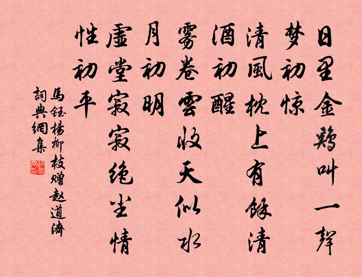 詩詞名句歷史字典書法欣賞書法字典國語詞典說文解字康熙字典古漢語字典標 題 作 者 詩 句 楊柳枝 贈趙道濟作者:馬鈺 朝代:元代楊柳枝 贈趙道濟原文日裡金雞叫一聲。夢初驚。清風枕上有餘清。酒初醒。霧捲雲收天似水,月初明。虛堂寂寂絕塵情。性初平。詩詞問答問:楊柳枝 贈趙道濟的作者是誰?答:馬鈺問:楊柳枝 贈趙道濟寫於哪個朝代?答:元代問:楊柳枝 贈趙道濟是什麼體裁?答:詞馬鈺楊柳枝 贈趙道濟書法欣賞楊柳枝 贈趙道濟書法作品詩詞推薦禪人並化主寫真求贊釋正覺〔宋代〕神定氣平,心空智明。其機靜而自應,其用虛而不盈。寒潭月落,霽夜河橫。紹了亡祖位,借功成佛名。建立因緣僧問四賓主因而有頌頌之釋重顯〔宋代〕如何是賓中賓。雲滿面埃塵,又曰噫。〔頌〕賓中之賓,少喜多瞋。丈夫壯志,當付何人。廬山瀑布孫魴〔唐代〕有山來便有,萬丈落雲端。霧噴千岩濕,雷傾九夏寒。圖中僧寫去,湖上客回看。卻羨為猿鶴,飛鳴近碧湍。聞杜宇貫休〔唐代〕咽雨哀風更不停,春光於爾豈無情。宜須喚得謝豹出,方始年年無此聲。曉雨張耒〔宋代〕輕陰江上千峰秀,小雨牆邊百草生。惟有春禽慰孤客,曉啼渾似故園聲。詩陳琳〔魏晉〕仲尼以聖德。行聘徧周流。遭斥厄陳蔡。歸之命也夫。酬孫發方乾〔唐代〕錦價轉高花更巧,能將舊手弄新梭。從來一字為褒貶,二十八言猶太多。寄子山待制二絕歐陽修〔宋代〕留滯西山獨可嗟,殘春過盡始還家。落花縱有那堪醉,何況歸時無落花。五泄山寺廖虞弼〔宋代〕招提深鎖綠苔幽,故遣高人向此留。萬疊雲山從地涌,雙源瀑布自天流。風翻象宇松聲碎,雨過禪房竹翠浮。試問華亭百詠彌陀閣許尚〔宋代〕拄策徐徐上,迴環佛頂游。九山俱在望,目斷暮煙浮。柳梢青(范系尉美任)龔日升〔宋代〕二十年前。君家桃李,種滿螺川。凜凜英風,真如小范,不數梅仙。薰風吹送朝天。指何物、裝添去船。千首新詩賣柑者言劉基〔明代〕杭有賣果者,善藏柑,涉寒暑不潰。出之燁然,玉質而金色。置於市,賈十倍,人爭鬻之。 予貿得其一,剖之平甫見招不欲往姜夔〔宋代〕樓閣萬重秋雨里,峰巒四合暮潮邊。鳳城今夕涼如水,多少人家度管紡。夔州竇員外使君見示悼妓詩顧余嘗識之因命同作劉禹錫〔唐代〕前年曾見兩鬟時,今日驚吟悼妓詩。鳳管學成知有籍,龍媒欲換嘆無期。空廊月照常行地,後院花開舊折枝。寂寞歲晚幽興陸游〔宋代〕萬里風波行路難,君恩尚許綴祠官。中庭鬱郁藥苗長,絕壁颼颼松吹寒。泥巷有人尋杜甫,雪廬無吏問袁安。清晨偈頌七十六首釋師範〔宋代〕竿頭絲線放還收,時有金鱗上直鉤。風月滿船雖不惡,爭如峰頂冷湫湫。緣識宋太宗〔宋代〕善惡由人作,修心勿亂為。邪求無實事,如影定相隨。妄想終成偽,行貪未可知。天生分異等,道德立尊卑。日月遣興·把盞非憐酒高駢〔唐代〕把盞非憐酒,持竿不為魚。唯應嵇叔夜,似我性慵疏。安樂公主移入新宅沈佺期〔唐代〕初聞衡漢來,移住斗城隈。錦帳迎風轉,瓊筵拂霧開。馬香遺舊埒,風吹繞新台。為問沈冥子,仙槎何處回。宮詞張公庠〔宋代〕鬧紫繁紅裹綠枝,一翻風雨盡離披。瑞香旬占深蘭暖,簾外春寒都不知。名句推薦琴瑟在御,莫不靜好。佚名《女曰雞鳴》 奉勸世間夫婦,固不可彼此相仇,亦不可過於情篤。沈復《浮生六記·坎坷記愁》 翻空白鳥時時見,照水紅蕖細細香。蘇軾《鷓鴣天·林斷山明竹隱牆》 長於春夢幾多時,散似秋雲無覓處。晏殊《木蘭花·燕鴻過後鶯歸去》 繞池閒步看魚游,正值兒童弄釣舟。白居易《觀游魚》 吳洲如見月,千里幸相思。李白《送張舍人之江東》 穠艷一枝細看取,芳心千重似束。蘇軾《賀新郎·夏景》 山寺月中尋桂子,郡亭枕上看潮頭。白居易《憶江南·江南憶》 節用儲蓄,以備凶災范曄《後漢書·本紀·肅宗孝章帝紀》 銅壺漏報天將曉,惆悵佳期又一年。羅隱《七夕》