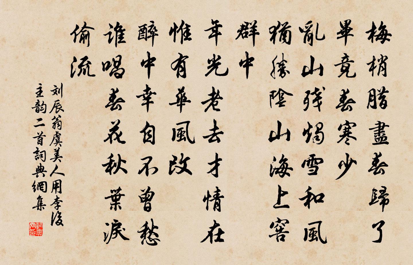 “年光老去才情在 。唯有華風改。”此二句,由江郎才盡點化而來。但另有新意。“淹少以文章顯,晚年才思微退”,其後“文章躓矣”,以至“爾後為詩,絕無美句。時人謂之才盡。”年光老去才情仍在,詞人頗具自信之心。此二句忽然寫至自己之詞作,並非偶然。詞人言老來才情未改,只是改變了過去絢麗的風格,寄寓了深沉的亡國之悲。才情仍在,隱約透露出自己不改初衷之意。華風變盡 ,寓示亡國之後,心靈懷有萬千悲痛。詞風為之大變。寓亡國之悲於詞風之變,與李後主詞之“雕欄玉砌應猶在,只是朱顏改”,可謂異曲同工“醉中幸自不曾愁。誰唱春花秋葉淚偷流。”醉中本想可逃愁。卻忽聽得有人唱起了李後主詞“春花秋月何時了”,不禁讓詞人潸然垂淚。只希望醉中能解千愁,逃脫憂愁,誰料得醉中也無可逃愁 ,反觸起無限傷心,則遺民生涯之,憂傷愁恨,牢不可破,不言而喻。