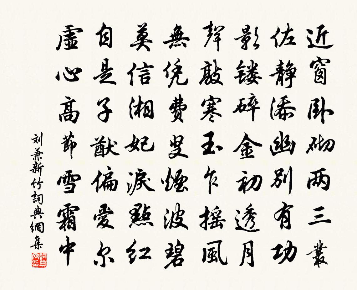 詩詞名句歷史字典書法欣賞書法字典國語詞典說文解字康熙字典古漢語字典標 題 作 者 詩 句 新竹作者:劉兼 朝代:唐代新竹原文近窗臥砌兩三叢,佐靜添幽別有功。影鏤碎金初透月,聲敲寒玉乍搖風。無憑費叟煙波碧,莫信湘妃淚點紅。自是子猷偏愛爾,虛心高節雪霜中。詩詞問答問:新竹的作者是誰?答:劉兼問:新竹寫於哪個朝代?答:唐代問:新竹是什麼體裁?答:七律劉兼新竹書法欣賞新竹書法作品注釋全唐詩:卷766-59詩詞推薦文相生日金君卿〔宋代〕聖賢不世出,會合未可知。朝廷余百年,天將右重熙。經綸須得人,公為生斯時。維時秋九月,爽氣橫海涯。三葉挽水心先生二首劉克莊〔宋代〕所學如山海,吁嗟不一施。未聞訪箕子,但見誄宣尼。空郡來陪哭,無人敢撰碑。紛紛門弟子,若個解稱師。簡陸務觀史君編修二首楊萬里〔宋代〕員外治中高帝孫,幕中何幸有詩人。主人不減西湖長,青眼無妨顧德麟。李仁甫將至郭下以詩迎之晁公溯〔宋代〕公館可休會,良宵宜對床。肯污白雲屨,來過碧瀾堂。置饌同三飯,開筵累十觴。涼秋當泛菊,小住擷微芳。重遊雁山分得六題天聰洞薛嵎〔宋代〕天聽本非耳,形容獨費吟。豈伊空鑿團,能探杳冥心。混沌開中竅,空虛納眾音。下臨千仞險,當暑骨毛森。句劉巨〔宋代〕漁人忽驚起,雪片逐風斜。和孟堅二月晦同出城鄭俠〔宋代〕花柳接重堙,三分破二春。江梅初弄雪,壟麥旋收新。纓紼嗟塵事,農桑羨野民。暫陪遊樂乘,此日是何辰。春感陸游〔宋代〕老厭紛紛嬾入城,長亭小市近清明。隴頭下漏初芸草,陌上 * 正賣餳。多病更知生是贅,九原那恨死無名?但余小雪前三日鍾冠之約余侍老人行山舟發後洪入洪咨夔〔宋代〕聽雨客無寐,放晴山有靈。禪關深紫翠,勛廟肅丹青。鰲負摩雲碣,龍扶拱日屏。真如無盡意,石澗水泠泠。浣溪沙劉過〔宋代〕著意尋芳已自遲。可堪容易送春歸。酒闌無奈思依依。楊柳小橋人遠別,梨花深巷月斜輝,此情惟我與君知。壬午雜詩楊冠卿〔宋代〕已分依人老,猶期振袂不。有愁供白髮,無力買青山。北駕方傳蹕,西師已度關。孤臣憂國淚,東首落余潸。送陳善世趙汝騰〔宋代〕不須遠遠苦求師,恭敬淵源可細推。歸路瑞安逢二戴,為予再四說相思。次韻國村送游黃山之作二首李彌遜〔宋代〕雅道於今久寂寥,規橅君肯到祈如。鯨牙浪闊傾三峽,鵬背雲高負九霄。但覓圖書供閉戶,不憂勳業誤題橋。七言贈梁彌仙張煒〔宋代〕笑側華陽一幅巾,碧眸蒼鬢貌如春。羅浮洞裡通勾曲,疑怪相逢似故人。四用韻方岳〔宋代〕花愁牽勝游,禽哢破佳睡。點爾春何如,妙在夫子喟。宇宙一瑟間,誰知道之至。而彼章句儒,心為六經醉。送洪州通判何太博先歸新淦梅堯臣〔宋代〕拜官江上客,乘馬不乘船。獨畏蛟龍浪,將歸風雨天。葛花侵野徑,源水入腴田。君住巴丘下,西山道路連。瑞鶴仙·梅陸叡〔宋代〕濕雲粘雁影。望征路愁迷,離緒難整。千金買光景。但疏鍾催曉,亂鴉啼暝。花悰暗省。許多情、相逢夢境。便行木蘭花/玉樓春佚名〔宋代〕花間棠棣。匹似人間兄與弟。一種花枝。底事當年卻盛衰。中臧蜾蠃。忽遇暝蛉真類我。換葉移根。要與相輝映一贈來鵬李鹹用〔唐代〕默坐非關悶,凝情只在詩。庭閒花落後,山靜月明時。答客言多簡,尋僧步稍遲。既同和氏璧,終有玉人知。京兆公池上作溫庭筠〔唐代〕稻香山色疊,平野接荒陂。蓮折舟行遠,萍多釣下遲。壞堤泉落處,涼簟雨來時。京口兵堪用,何因入夢思。名句推薦他年我若為青帝,報與桃花一處開。黃巢《題菊花》 黃河怒浪連天來,大響谹谹如殷雷。溫庭筠《拂舞詞 / 公無渡河》 龜靈未免刳腸患,馬失應無折足憂。白居易《放言五首·其二》 山高月小,水落石出。蘇軾《後赤壁賦》 細雨魚兒出,微風燕子斜。杜甫《水檻遣心二首》 此時瞻白兔,直欲數秋毫。杜甫《八月十五夜月二首》 池邊釣女日相隨,妝成照影竟來窺孟浩然《高陽池送朱二》 氣軟來風易,枝繁度鳥遲。李爽《芳樹》 菡萏香銷翠葉殘,西風愁起綠波間。李璟《攤破浣溪沙·菡萏香銷翠葉殘》 強自取柱,柔自取束。荀子《荀子·勸學》