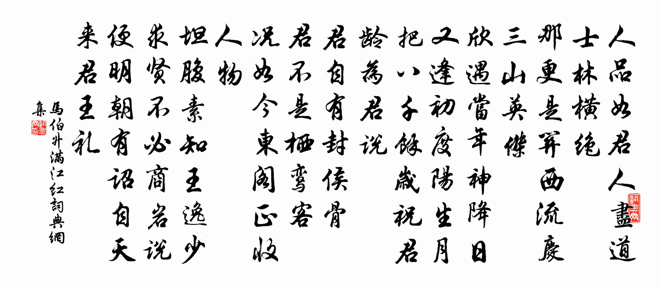 詩詞名句歷史字典書法欣賞書法字典國語詞典說文解字康熙字典古漢語字典標 題 作 者 詩 句 滿江紅作者:馬伯升 朝代:宋代滿江紅原文人品如君,人盡道,士林橫絕。那更是、關西流慶,三山英傑。欣遇當年神降日,又逢初度陽生月。把八千餘歲祝君齡,為君說。君自有,封侯骨。君不是,棲鸞客。況如今東閣,正收人物。坦腹素知王逸少,求賢不必商岩說。便明朝、有詔自天來,君王禮。詩詞問答問:滿江紅的作者是誰?答:馬伯升問:滿江紅寫於哪個朝代?答:宋代問:滿江紅是什麼體裁?答:詞馬伯升滿江紅書法欣賞滿江紅書法作品詩詞推薦花前勸酒邵雍〔宋代〕春在對花飲,春歸花亦殘。對花不飲酒,歡意遂闌珊。酒向花前飲,花宜醉後看,花前不飲酒,終負一年歡。感古十首胡仲弓〔宋代〕范蠡泛五湖,子房從赤松。功成乞身退,明哲保令終。彼美二丈夫,世異轍則同。此道久不作,利慾塵相蒙。急流秧馬蘇軾〔宋代〕春雲蒙蒙雨淒淒,春秧欲老翠剡齊。嗟我婦子行水泥,朝分一壟暮千畦。腰如箜篌首啄雞,筋煩骨殆聲酸嘶。我有悼止齋王先生 其三王冕〔元代〕三月燕山聽子規,追思令我淚垂垂。雖然事業能經世,可惜文章未際時。霜慘晴窗琴獨冷,月明秋水劍雙悲。山河送徐秀才之吳齊己〔唐代〕吳都霸道昌,才子去觀光。望闕雲天近,朝宗水路長。海門收片雨,建業泊殘陽。欲問淮王信,仙都即帝鄉。和遲田舍雜詩九首蘇轍〔宋代〕老佛同一源,出山便異流。少小本好道,意在三神洲。子房見黃石,願封小國留。終老預人事,斷谷為呂憂。余給事輓詞樓鑰〔宋代〕桂籍兄聯弟,蘭階子克家。上恩嘉踵式,京秩為增華。朝著蒙傾蓋,綸闈睹判花。遽成千古別,南望相悲笳。答司馬承禎上劍鏡李隆基〔唐代〕寶照含天地,神劍合陰陽。日月麗光景,星斗裁文章。寫鑒表容質,佩服為身防。從茲一賞玩,永德保齡長。示趙與檳趙汝騰〔宋代〕今年至日有喜色,四方士友來請益。德場宗英質大學,上饒諸賢問太極。草廬一紙隃寄音,徑坂七言大書帛。衰予同水部張員外籍曲江春遊,寄白二十二舍人韓愈〔唐代〕漠漠輕陰晚自開, * 映樓台。曲江水滿花千樹,有底忙時不肯來。六月四日飯石六風雷大作而雨不成滴戲以詩趣李彌遜〔宋代〕疾風卷落葉,六月秋欲變。雲生澗底松,雷走岩下電。雨花如芬絲,熟視乃不見。借令軍軸飛,未救龜兆偏。常暘送遷客周弼〔宋代〕自謂別離難會面,如何此地又相尋。往來雲物他鄉意,輕薄風塵久客心。夜雨泥塗三里郭,夕陽煙火數家林。送君題孤山圖錢選〔宋代〕一童一鶴兩相隨,閒步梅邊賦小詩。疏影暗香真絕句,至今誰復繼新辭。武陽渡裘萬頃〔宋代〕一舟小如葉,橫在波濤中。紛紛川上人,欲渡愁北風。有帆天際來,漸近葭葦叢。寄聲與問訊,恐是陶朱公。游西山同項可立宿靈隱西庵黃溍〔元代〕薄游厭人境,振策窮幽躅。理公所開鑿,遺蹟在岩麓。秋杪霜葉丹,石面寒泉綠。仰窺條上猿,攀蘿去相逐。物情胡搗練杜安世〔宋代〕數枝半斂半開時,洞閣曉妝新注。寶香格艷姿天賦。甘被群芳妒。狂風橫雨且相饒,又恐有彩雲迎去。牽破少年心又題牡丹上主人司空孫魴〔唐代〕一年芳勝一年芳,愛重賢侯意異常。手辟紅房看闊狹,自張青幄蓋馨香。白疑美玉無多潤,紫覺靈芝不是祥。只恐花飛引高似孫〔宋代〕花少思兮離離,企佳人兮不來。風嫋嫋兮吹愁,綠滿樹兮香在苔。鴃哀兮今歇。杳新知兮誰悅,期佳人兮柰何別。夏安居日過實上人東軒時新竹浴雨因作句歌之釋正覺〔宋代〕籜龍出叢林,脫錦露新綠。昂藏引頭角,密密均節目。娟然塵外姿,雲霧膩寒玉。翠滿東窗陰,心眼掃惡俗。虛靜湖州歌九十八首 其九十一汪元量〔宋代〕江南郡守列金階,內里華筵日日排。文武官僚多二品,還鄉盡帶虎頭牌。名句推薦用仁義以治天下,行禮樂以變海內,公賞罰以定干戈。施耐庵《水滸傳·第八十二回》 乃幽武置大窖中,絕不飲食。天雨雪。班固《蘇武傳(節選)》 禍患常積於忽微,而智勇多困於所溺歐陽修《伶官傳序》 一去無訊息,那能惜馬蹄。薛道衡《昔昔鹽》 東風動百物,草木盡欲言。李白《長歌行》 君子敬其在己者,而不慕其在天者,是以日進也。荀子《荀子·天論》 蕪然蕙草暮,颯爾涼風吹。李白《秋思》 人學始知道,不學非自然。孟郊《勸學》 小池寒綠欲生漪,雨晴還日西。秦觀《阮郎歸·春風吹雨繞殘枝》 一身猶在,亂山深處,寂寞溪橋畔。黃公紹《青玉案·年年社日停針線》