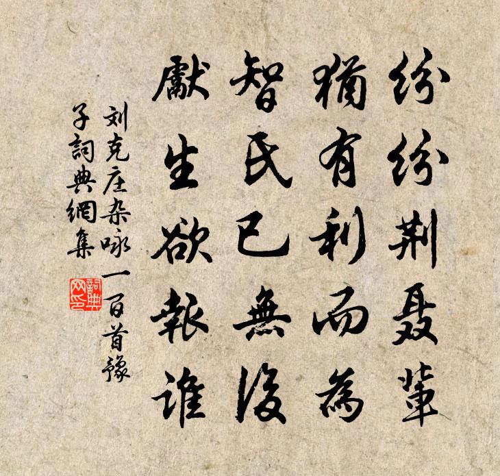 詩詞名句歷史字典書法欣賞書法字典國語詞典說文解字康熙字典古漢語字典標 題 作 者 詩 句 雜詠一百首豫子作者:劉克莊 朝代:宋代雜詠一百首豫子原文紛紛荊聶輩,猶有利而為。智氏已無後,先生欲報誰。詩詞問答問:雜詠一百首豫子的作者是誰?答:劉克莊問:雜詠一百首豫子寫於哪個朝代?答:宋代問:劉克莊的名句有哪些?答:劉克莊名句大全劉克莊雜詠一百首豫子書法欣賞雜詠一百首豫子書法作品詩詞推薦大能仁寺劉學箕〔宋代〕規模應甲剎,殿閣擁金仙。歲歉炊煙絕,城低野色連。客僧皆散去,主者獨安眠。成毀難逃數,山門八百年。送宋慎言姚合〔唐代〕童稚便知聞,如今只有君。百篇詩盡和,一盞酒須分。驛路多連水,州城半在雲。離情同落葉,向晚更紛紛。金陵懷古六首周文璞〔宋代〕杳杳舊蹤尋不得,茫茫遺恨有誰窮。長安敗績誰憐汝,灞上收聲未到公。有感宋祁〔宋代〕力守高皇約,祈還司隸章。翻身去殿檻,忍死出縑囊。豕突埋輪路。豺驕擇肉場。霜毫墨猶濕,迢遞竄遐方。次韻古梅蘇泂〔宋代〕獨立枝南萬事非,歲寒引去合知幾。伯夷自信西山餓,公望何須東海歸。笛外數聲空入夢,江頭一樹忽斜暉。相看環翠台陸九淵〔宋代〕直從平地矗崔嵬,南向群山斗次來。盡此半春留客醉,莫愁一日不花開。水從綠野前頭繞,竹向芳菲缺處栽。目前梅釋行海〔宋代〕上外無花耐歲寒,花魁今古品題難。清香合讓梅為最,陽艷叢中許牡丹。游冷泉亭宿四聖觀姚勉〔宋代〕晝日追涼到冷泉,晚風呼酒醉湖邊。醉中興懶休歸去,試叩丹舟借榻眠。次趙帥韻三首陳造〔宋代〕眼眩如看九色霞,女膚側理字棲鴉。挽回春事憑詩力,留住風林欲褪花。題新昌蔡尉比春園四進載酒亭陳元晉〔宋代〕蔡家亭子錦江涯,長約春風作歲華。拚卻百年渾是醉,莫教一日不開花。稱觴隨獲慈顏悅,問字時容客喧譁。我若挽林煥章二首劉克莊〔宋代〕束帛徵諸老,深衣立一儒。鄉人偕獵較,童子共鳳雩。屑屑羞來往,兢兢迨舉扶。自慚衰竭久,書墓覺詞蕪。西江月 長安運同惠道袍馬鈺〔元代〕昨日道袍破敝。今朝便著新衣。有人問我這因依。且顯同知厚惠。又恐著他華麗。棄之更不生疑。道家蓑笠最相宜閨怨韋莊〔唐代〕戚戚彼何人,明眸利於月。啼妝曉不乾,素麵凝香雪。良人去淄右,鏡破金簪折。空藏蘭蕙心,不忍琴中說。獻臣學士與余通書因成感詠宋庠〔宋代〕夫君班揚儔,抱槧群玉府。久讀未見書,躬抽擊年譜。墜緒獲先秦,亡篇出東魯。上泝三皇墳,旁探百家語。怪牒再賦五雜范成大〔宋代〕五雜俎,侯門戟。往復來,道上檄。不得已,天涯客。示長安君王安石〔宋代〕少年離別意非輕,老去相逢亦愴情。草草杯盤供笑語,昏昏燈火話平生。自憐湖海三年隔,又作塵沙萬里行。欲問夜泊永樂有懷許渾〔唐代〕蓮渚愁紅盪碧波,吳娃齊唱採蓮歌。橫塘一別已千里,蘆葦蕭蕭風雨多。晚春書懷簡陳巽叔二首王炎〔宋代〕花片已零落,綠陰遮短牆。園蔬春筍長,官酒臘醅香。揮麈故人少,杜門閒日長。不妨時過我,談笑倚繩床。送杜子問歸明州連文鳳〔宋代〕未酬行道志,抱道復東歸。老入江湖鬢,寒深雨雪衣。客程煙樹晚,鄉夢海魚肥。所恨交情淺,臨岐別語稀。寄令狐賓客張籍〔唐代〕勛名盡得國家傳,退狎琴僧與酒仙。還帶郡符經幾處,暫辭台座已三年。留司未到龍樓下,拜表長懷玉案前。秋日名句推薦野雲萬里無城郭,雨雪紛紛連大漠。李頎《古從軍行》 酒已都醒,如何消夜永!周邦彥《關河令·秋陰時晴漸向暝》 台榭空濛煙柳暗,白鳥銜魚欲舞。納蘭性德《摸魚兒·午日雨眺》 溪上桃花無數,花上有黃鸝。黃庭堅《水調歌頭·遊覽》 望家思獻壽,算甲恨長年。歐陽詹《除夜長安客舍》 長條短葉翠濛濛,才過西風,又過東風。夏完淳《一剪梅·詠柳》 通則驕而偏,窮則棄而儑。荀子《荀子·不苟》 君子之心事,天青日白,不可使人不知洪應明《菜根譚·概論》 一溪煙柳萬絲垂,無因系得蘭舟住。周紫芝《踏莎行·情似遊絲》 金谷園中柳,春來似舞腰。李益《上洛橋》