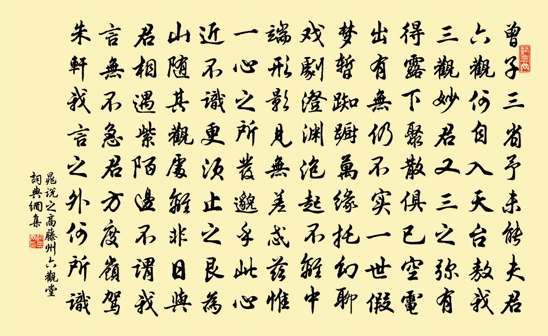 詩詞名句歷史字典書法欣賞書法字典國語詞典說文解字康熙字典古漢語字典標 題 作 者 詩 句 高藤州六觀堂作者:晁說之 朝代:宋代高藤州六觀堂原文曾子三省予未能,夫君六觀何自入。天台敖我三觀妙,君又三之彌有得。露下聚散俱已空,電出有無仍不實。一世假夢暫踟躕,萬緣托幻聊戲劇。澄淵泡起不離中,端形影見無差忒。茲惟一心之所發,邈乎此心近不識。更須止之艮為山,隨其觀處離非日。與君相遇紫陌邊,不謂我言無不急。君方度嶺駕朱軒,我言之外何所識。詩詞問答問:高藤州六觀堂的作者是誰?答:晁說之問:高藤州六觀堂寫於哪個朝代?答:宋代晁說之高藤州六觀堂書法欣賞高藤州六觀堂書法作品詩詞推薦古漁父詞十二首王銍〔宋代〕曾見三閭屈大夫,強將清濁較賢愚。如今更覺前言拙,醒醉由來本不殊。溪庵種蓻六言八首劉克莊〔宋代〕功名胡蝶夢裡,心功橐駝傳中。環合千林蒼翠,參差數株白紅。寄杜先生詩孫偓〔唐代〕蜀國信難遇,楚鄉心更愁。我行同范蠡,師舉效浮丘。他日相逢處,多應在十洲。南唐伶人獻先主詞佚名〔宋代〕惟願普天多瑞慶,柳條結絮鵝雙生。和夏南麓繡斧曾驅當道狼及答尹存吾喻仁山攜陳杰〔宋代〕金石論交半化狼,竹桐吾味暫棲鳳。陶籬三畝新荒逕,孔壁千秋未壞堂。彩鳳題門人灑落,驪珠照夜筆淋浪。惜無太平吟邵雍〔宋代〕太平時世園亭內,豐稔歲年村落間。情味一般難狀處,風菸草木盡閒閒。予往來秦熙汧隴間不啻十數年時聞下里之歌遠李復〔宋代〕垂白東西幾田父,林間偶坐忘巾履。共說乾餱付遠人,六月長丁猶築戍。聽董大彈胡笳聲兼寄語弄房給事李頎〔唐代〕蔡女昔造胡笳聲,一彈一十有八拍。胡人落淚沾邊草,漢使斷腸對歸客。古戍蒼蒼烽火寒,大荒沈沈飛雪白。(沈鷓鴣天(與魯卿晚雨泛舟出西郭,用煙波定韻)葉夢得〔宋代〕天末殘霞卷暮紅。波間時見沒鳧翁。斜風細雨家何在,老矣生涯盡箇中。惟此意,與公同。未須持酒祝牛宮。旁人送僧歸護國寺錢易〔宋代〕拂衣台嶺舊林泉,命服蘭芽奪目鮮。一念不居常在定,十分無悶盡安禪。霜含庭柏依稀老,月到經窗暗澹圓。蠛枕張平甫哀輓姜夔〔宋代〕將軍家世出臞儒,合上青雲作計疏。吳下宅成花未種,湖邊地吉草新鋤。空嗟過隙催人世,賴有提孩讀父書。它日曲江二首杜甫〔唐代〕一片段預告飛減卻春,風飄萬點正愁人。且看欲盡花經眼,莫厭傷多酒入唇。江上小堂巢翡翠,花邊高冢臥麒麟。細推頌古五首釋守仁〔宋代〕如舍利弗與么去,千人萬人攔不住。優遊自在涅盤城,步步蓮華隨足舉。扇子詩李石〔宋代〕芙蓉香泛白苹洲,楊柳吹花玉雪浮。且喜兩邊無一事,五更鼓角月當樓。次廉布書事三首呈郎中機宜韻鄧仁憲〔宋代〕狎鷗東海上,結友竹林賢。國難知推救,途窮只自憐。空花迷眼界,秋月契心禪。未起歸歟興,重尋載酒船。好事近(翠圓枝)韓淲〔宋代〕一澗水南山,臘盡春生梅雪。行過小橋深處,帶疏鍾橫月。征衫閒著指東吳,休怕與人別。吟到翠圓枝上,是歸來冬至日銅壺閣落成范成大〔宋代〕走偏人間行路難,異鄉風物雜悲歡。三年北戶梅邊暖,萬里西樓雪外寒。已辦鬢霜供歲龠,仍拚髀肉了征鞍。故園同李洗馬入餘不溪經辛將軍故城皎然〔唐代〕慘慘寒城望,將軍下世時。高墉暮草遍,大樹野風悲。壁壘今惟在,勛庸近可思。蒼然古溪上,川逝共淒其。臨江仙趙長卿〔宋代〕遠岫螺頭濕翠,流霞赬尾疏明。斷虹斜界雨新晴。煙村燈火晚,江浦畫難成。我向其間泛葉,終朝露渚風汀。老來箕山操曹勛〔宋代〕草可以為衣兮,木可以為廬。水清石白兮,渴飲有時而飢食有餘。止不知其吾之有影兮,而行不知其吾之有軀。彼名句推薦足不強則跡不遠,鋒不銛,則割不深。王充《論衡·卷十三·超奇篇》 燕歸花謝,早因循、又過清明。納蘭性德《紅窗月·燕歸花謝》 莫失莫忘,仙壽恆昌。曹雪芹《紅樓夢·第八回》 思君若汶水,浩蕩寄南征。李白《沙丘城下寄杜甫》 孫郎微笑,坐來聲噴霜竹黃庭堅《念奴嬌·斷虹霽雨》 裊裊城邊柳,青青陌上桑。張仲素《春閨思》 人生有情淚沾臆,江水江花豈終極!杜甫《哀江頭》 共說春來春去事,多時。一點愁心入翠眉。晏幾道《南鄉子·花落未須悲》 故目者,心之浮也;言者,行之指也;作於中,則播於外也。戴聖《大戴禮記·曾子立事第四十九》 孝當竭力,忠則盡命。周興嗣《千字文·全文》