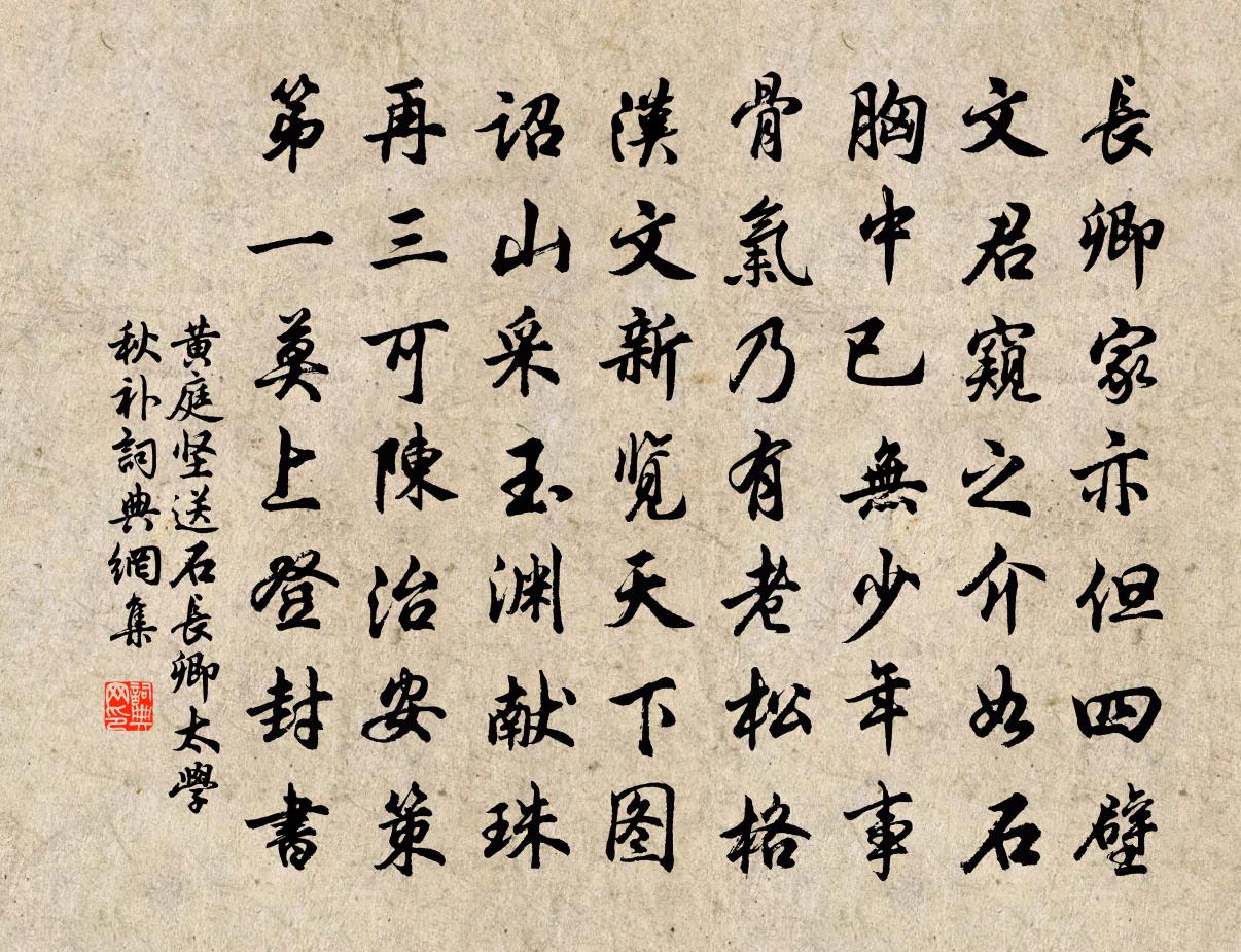 詩詞名句歷史字典書法欣賞書法字典國語詞典說文解字康熙字典古漢語字典標 題 作 者 詩 句 送石長卿太學秋補作者:黃庭堅 朝代:宋代送石長卿太學秋補原文長卿家亦但四壁,文君窺之介如石。胸中已無少年事,骨氣乃有老松格。漢文新覽天下圖,詔山采玉淵獻珠。再三可陳治安策,第一莫上登封書。詩詞問答問:送石長卿太學秋補的作者是誰?答:黃庭堅問:送石長卿太學秋補寫於哪個朝代?答:宋代問:黃庭堅的名句有哪些?答:黃庭堅名句大全黃庭堅送石長卿太學秋補書法欣賞送石長卿太學秋補書法作品詩詞推薦送周承勛赴荊南幕韓元吉〔宋代〕周南留滯幾年余,笑力追還兩流初。無地寘君群玉府,因人貽我萬金書。未嗟王粲依油幕,聊喜安仁奉板輿。夢想懷智體道人貫休〔唐代〕棲碧思吾友,庭鶯百囀時。唯應一處住,方得不相思。雲水淹門閫,春雷在樹枝。平生無限事,不獨白雲知。謝判府王宣徽惠酒邵雍〔宋代〕自得花枝向遠鄰,只憂輕負一番春。無何寵貺酒雙榼,少室山人遂不貧。三清閣吳愈〔宋代〕廬山之勝,秀出斗旁。參于衡岳,鎮東南方。民人所瞻,神天攸宅。齎夢之祥,乃興自昔。惟天聰明,矜此下民。憶強甫劉克莊〔宋代〕臨歧約共屠蘇酒,及飲屠蘇汝未歸。縱使舉頭瞻日近,可堪返顧見雲飛。索長安米難淹久,回剡溪船果是非。別後遇流民有感一首王阮〔宋代〕行盡江南處處山,無錢歸去買山閒。自憐不在施為地,空對流民數汗顏。水龍吟(中秋)李之儀〔宋代〕晚來輕拂,游雲盡卷,霽色寒相射。銀潢半掩,秋毫欲數,分明不夜。玉琯傳聲,羽衣催舞,此歡難借。凜清輝,潘別駕寄牡丹歌次韻汪莘〔宋代〕別駕寄我新時章,賞花須賞花中王。我誦此詩欲大叫,山川靈氣未始亡。憶昔少年健如虎,兩腳不住尋奇芳。何曾碁山院董淵〔宋代〕風際有雲多世態,海中無底是人心。可堪更問碁山話,一局閒爭古到今。【雙調】水仙子 相思劉庭信〔元代〕秋風颯颯撼蒼梧,秋雨瀟瀟響翠竹,秋雲黯黯 * 樹。三般兒一樣苦,苦的人魂魄全無。雲結就心間愁悶。雨少似夏五月方閔雨忽大風雨三日未止陸游〔宋代〕海風一夕狂拔木,山雨三朝猛穿屋。向來望雲眼欲枯,雨甚還憂敗嘉穀。今年旱勢連吳中,吾州乃獨勞神龍。稽首夏日作白居易〔唐代〕葛衣疏且單,紗帽輕復寬。一衣與一帽,可以過炎天。止於便吾體,何必被羅紈。宿雨林筍嫩,晨露園葵鮮。烹葵揠苗助長佚名〔先秦〕宋人有閔其苗之不長而揠之者,芒芒然歸,謂其人曰:“今日病矣!予助苗長矣!”其子趨而往視之,苗則槁矣。西江月朱熹〔宋代〕堂下水浮新綠,門前樹長交枝。晚涼快寫一篇詩。不說人間憂喜。身老心閒益壯,形癯道勝還肥。軟輪加璧未應遲燕脂菊史鑄〔宋代〕天汝染花情若狂,鮮妍直欲媚秋光。忍將陶徑黃金色,也學秦宮朱臉妝。奉和山夜臨秋上官儀〔唐代〕殿帳清炎氣,輦道含秋陰。淒風移漢築,流水入虞琴。雲飛送斷雁,月上淨疏林。滴瀝露枝響,空濛煙壑深。三高祠鴟夷子皮孫銳〔宋代〕苧蘿仙子總無雙,一棹煙波氣未降。如何鑄像勞臣節,卻是吳江非越江。裴迪南門秋夜對月(一作裴迪書齋玩月之作)錢起〔唐代〕夜來詩酒興,月滿謝公樓。影閉重門靜,寒生獨樹秋。鵲驚隨葉散,螢遠入煙流。今夕遙天末,清光幾處愁。謁孺子祠後由南昌還艤舟之地趙蕃〔宋代〕南昌假傳欲上書,孺子乃復辭聘車。東都已顛不可救,莽篡未露猶枝梧。福為市卒終潛吳,稚乃懸榻太守居。吁哉贈崔溫詩盧諶〔魏晉〕逍遙步城隅。暇日聊游豫。北眺沙漠垂。南望舊京路。平陸引長流。岡巒挺茂樹。中原厲迅飆。山阿起雲霧。遊子名句推薦以言取士,士飾其言,以行取人,人竭其行。姚察、姚思廉《梁書·本紀·卷一》 今年歡笑復明年,秋月春風等閒度。白居易《琵琶行 / 琵琶引》 微暈嬌花濕欲流,簟紋燈影一生愁。納蘭性德《浣溪沙·詠五更和湘真韻》 文之英蕤,有秀有隱。隱也者,文外之重旨者也;秀也者,篇中之獨拔者也。劉勰《文心雕龍·隱秀》 又莫是東風逐君來,便吹散眉間一點春皺蘇軾《洞仙歌·詠柳》 白鳥悠悠自去,汀洲外、無限蒹葭。王國維《滿庭芳·水抱孤城》 獨抱影兒眠,背看燈花落。汪懋麟《誤佳期·閨怨》 入春才七日,離家已二年。薛道衡《人日思歸》 客里相逢,籬角黃昏,無言自倚修竹。姜夔《暗香疏影》 還作一段相思,冷波葉舞愁紅,送人雙槳。吳文英《解蹀躞·醉雲又兼醒雨》