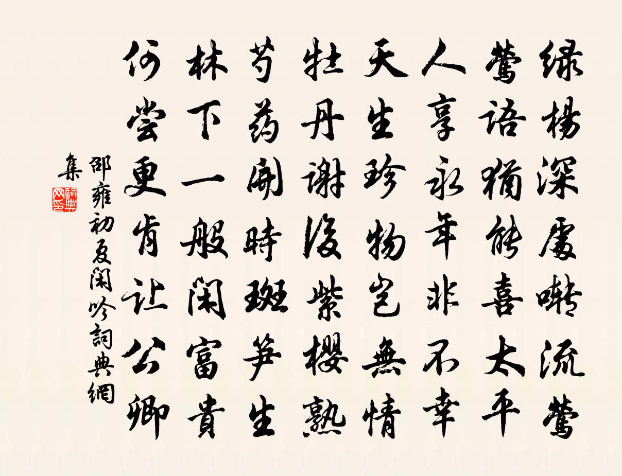 詩詞名句歷史字典書法欣賞書法字典國語詞典說文解字康熙字典古漢語字典標 題 作 者 詩 句 初夏閒吟作者:邵雍 朝代:宋代初夏閒吟原文綠楊深處囀流鶯,鶯語猶能喜太平。人享永年非不幸,天生珍物豈無情。牡丹謝後紫櫻熟,芍藥開時斑筍生。林下一般閒富貴,何嘗更肯讓公卿。詩詞問答問:初夏閒吟的作者是誰?答:邵雍問:初夏閒吟寫於哪個朝代?答:宋代邵雍初夏閒吟書法欣賞初夏閒吟書法作品詩詞推薦陶者梅堯臣〔宋代〕陶盡門前土,屋上無片瓦。寸指不沾泥,鱗鱗居大廈。經故明靜師支離堂強至〔宋代〕支公昔講支離學,堂上無容坐客氈。往日衣冠今尚否,經春幾席自蕭然。談間精義門人記,身後清風嗣子傳。一紀相和歌辭。放歌行王昌齡〔唐代〕南渡洛陽津,西望十二樓。明堂坐天子,月朔朝諸侯。清樂動千門,皇風被九州。慶雲從東來,泱漭抱日流。昇平次韻唐立夫永川五柳堂堂李齊年所建十年間三李石〔宋代〕我與李侯初不熟,但聞弦歌政聲速。永川雞犬數山外,迄今語言猶可錄。向來官舍卜清疏,把酒橫琴僅容足。眼前九月望徙坐冬窩錢時〔宋代〕滿窗融日育天和,個裹還來著到麽。多少世間閒落索,老夫情緒只冬窩。詩寄趙九新娶陳著〔宋代〕風擺柳梢雲未乾,痴雲妒日正嬌寒。儇香公子新鴛侶,那肯興心客路難。送麻田吳子野還山張耒〔宋代〕麻田老仙身馭風,萬里一息如飛蓬。行窮山川出天外,閱盡世界歸壺中。經過賣藥勾漏客,鄉里高年南極翁。我亦明道元年章獻明肅皇太后朝會十五首佚名〔宋代〕長光居尊,盛容有燈。文王事親,萬國歸美。朝會之則,邦家之紀。受福於天,克昭隆禮。自遣三首釋智圓〔宋代〕講退時時學苦吟,人間聲利已無心。水邊占得清閒景,雨霽遙峰夜月深。享廟禋郊詩禋郊十韻宋祁〔宋代〕大駕峨千乘,長塗過百廛。塵清屬車地,雪盡幔城天。步輦黎明降,華燈艾夜燃。升琮奠黃粹,薦璧捧蒼圓。牲俎景靈宮孟享陳郁〔宋代〕幸驂恭謝睹繁華,馬上歸來戴御花。老婦椎和相顧問,也頒春色到詩家。禪人並化主寫真求贊釋正覺〔宋代〕白雲無根,青山有棱。自得一句,妙出三乘。和氣而春回百草,光明而焰續千燈。淵默心傳諸佛體,家風獨許少林句陳亞〔宋代〕馬嘶曾到寺,犬吠乍行村。武擔東台晚望陸游〔宋代〕憔悴西窗已一翁,登高意氣尚豪雄。關河霸國興亡後,風月詩人醉醒中。病起頓驚雙鬢改,春歸一掃萬花空。欄邊漁家傲梵琦〔元代〕聽說娑婆無量苦。如今業債前來負。賊劫貨財身被虜。逢狼虎。挑生咒死兼巫蠱。奴婢辛勤依惡主。黑瘡白癩聾和旅次朔方 / 渡桑乾劉皂〔唐代〕客舍并州已十霜,歸心日夜憶鹹陽。無端更渡桑乾水,卻望并州是故鄉。送明甫初筮十首劉克莊〔宋代〕記取元城語,南州熱異常。別無衛生訣,止酒是丹方。過真定曹勛〔宋代〕南北東西本一家,從來河朔富桑麻。棗梨陰翳忽如雪,漠漠一種蕎麥花。{左氵右壑}耕雲敬得方丈顧逢〔宋代〕耕雲老子久相期,同賦山中鶯燕詩。可惜我來遲數日,牡丹過了有花時。頌古十一首釋鹹傑〔宋代〕狗子無佛性, * 便償命。楚痛百千般,因邪卻打正。名句推薦蟬鳴空桑林,八月蕭關道。王昌齡《塞下曲四首》 白馬誰家子,黃龍邊塞兒。李白《獨不見》 天外黑風吹海立,浙東飛雨過江來。蘇軾《有美堂暴雨》 木謂之華,草謂之榮。佚名《爾雅·釋草》 瘦葉幾經雪,淡花應少春。於武陵《贈賣松人》 風雨送春歸,飛雪迎春到。 * 《卜運算元·詠梅》 只言啼鳥堪求侶,無那春風欲送行。高適《夜別韋司士》 君子以行言,小人以舌言佚名《孔子家語·顏回》 漠漠輕寒上小樓,曉陰無賴似窮秋。淡煙流水畫屏幽秦觀《浣溪沙·漠漠輕寒上小樓》 斬草除根,萌芽不發馮夢龍《警世通言·卷三十七》