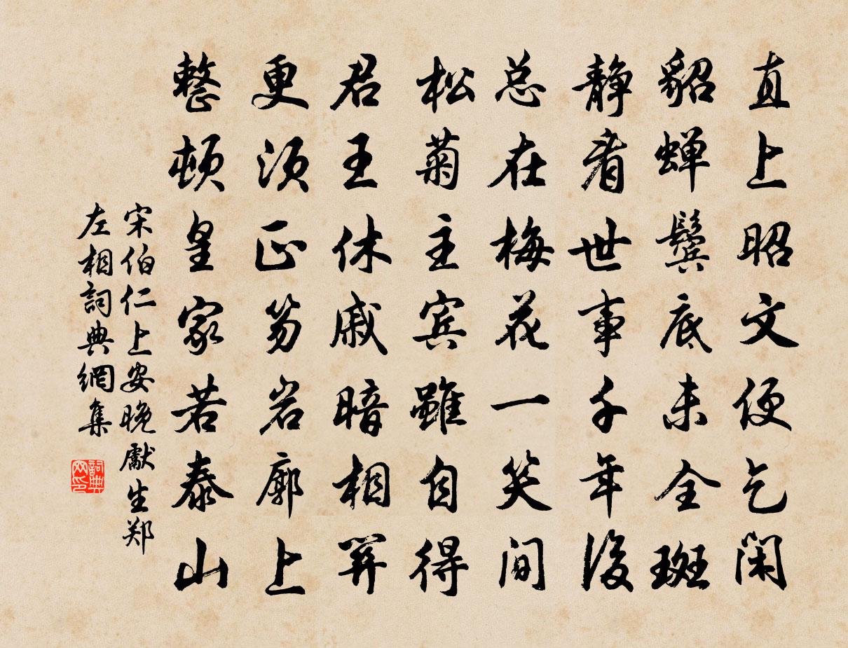詩詞名句歷史字典書法欣賞書法字典國語詞典說文解字康熙字典古漢語字典標 題 作 者 詩 句 上安晚先生鄭左相作者:宋伯仁 朝代:宋代上安晚先生鄭左相原文直上昭文便乞閒,貂蟬鬢底未全斑。靜看世事千年後,總在梅花一笑間。松菊主賓雖自得,君王休戚暗相關。更須正笏岩廓上,整頓皇家若泰山。詩詞問答問:上安晚先生鄭左相的作者是誰?答:宋伯仁問:上安晚先生鄭左相寫於哪個朝代?答:宋代宋伯仁上安晚先生鄭左相書法欣賞上安晚先生鄭左相書法作品詩詞推薦題緱山王子晉廟鄭畋〔唐代〕有昔靈王子,吹笙溯泬 。六宮攀不住,三島去相招。亡國原陵古,賓天歲月遙。無蹊窺海曲,有廟訪山椒。石帳為彭積甫題熙春堂王之道〔宋代〕似聞伐石旋誅茅,已見高堂蔭樂郊。百里湖山供眼界,滿城桃李動春梢。寒梅過盡看成實,乳燕飛來欲定巢。何日挽徐居士二首金履祥〔宋代〕昔年澇旱苦頻仍,南北郊關自越秦。東浙於時猶道殣,嚴邦此地況山民。能回涸轍西江水,頓起翳桑寒谷春。神理游山七絕龍隱洞張釜〔宋代〕何年此事蟄飛龍,石壁蜿蜒尚有蹤。為報龍公莫貪睡,郡人於爾卜豐凶。送吳秀才曾鞏〔宋代〕一年過臘已十日,余日到春能有幾。春來遠近不可問,冷碧先歸在流水。梅花向今獨已繁,玉艷都占春風間。草萌上牡丹瓶范成大〔宋代〕春晚娑羅百葉開,仙翁精舍長蓬萊。朝元未罷門深閉,不管人間有客來。上大面上亭驛楊子方〔宋代〕時平總忽忠臣語,世亂仍遭弄臣侮。至今說到忒郎當,行路猶能痛千古。過冷泉張鎡〔宋代〕未喜亭陰坐,先貪樹畔行。豀渾因雨瀑,岩近得風清。一飯幽人福,三杯太古情。尚須冰月掛,來放雪濤傾。題鄭中丞東溪劉滄〔唐代〕一境新開雉堞西,綠苔微徑露淒淒。高軒夜靜竹聲遠,曲岸春深楊柳低。山霽月明常此醉,草芳花暗省曾迷。即隨過秦淮楊萬里〔宋代〕曉過新橋啟轎窗,要看春水弄春光。東風作意驚詩眼,攪亂垂楊兩岸黃。與諸客空腹飲白居易〔唐代〕隔宿書招客,平明飲暖寒。麴神寅日合,酒聖卯時歡。促膝才飛白,酡顏已渥丹。碧籌攢米碗,紅袖拂骰盤。醉後九日對菊顧逢〔宋代〕秋滿南山菊滿籬,捲簾相對坐多時。琴中自得無弦趣,蝶與西風總不知。江村晚眺戴復古〔宋代〕江頭落日照平沙,潮退漁船擱岸斜。白鳥一雙臨水立,見人驚起入蘆花。聽琴白玉蟾〔宋代〕心造虛無外,弦鳴指甲間。夜來宮調罷,明月滿空山。挽顧監丞劉克莊〔宋代〕呷州鼓吹迓前茅,幾載瘡痍變樂郊。黎母盜清民有犢,佽飛士勇海無蛟。安排循吏添新傳,檢點耆英少故交。欲發跋徐蜚英四世祖神童事方回〔宋代〕句圓字穩削陳言,詩律吾曹合細論。五藁端能壓南嶽,後村死後有前村。菩薩蠻李處全〔宋代〕晦庵老子修行久。問禪金粟曾回首。截竹是禪機。吹破粟玉枝。西湖秋好處。承得昭陽露。香透月輪低。來薰打坐和韋使君秋夜見寄丘丹〔唐代〕露滴梧葉鳴,秋風桂花發。中有學仙侶, * 弄山月。南禪長老和詩不已故作六蟲篇答之蘇軾〔宋代〕鳳凰覽德輝,遠引不待遣。鷾鴯戀庭宇,倏忽來千轉。那將坐井蛙,而比談天衍。蠹魚著文字,槁死猶遭卷。老牛新正恭奉皇太后幸御園之作乾隆〔清代〕撰辰曉出鳳城垣,煙市燈棚景物繁。甲午今年新甲子,春輿此日駐春園。璇霄瑞氣霏銀粟,姬室徽音奉壽萱。吉旦名句推薦聽君一席話,勝讀十年書。佚名《增廣賢文·上集》 歌中醉倒誰能恨,唱罷歸來酒未消。晏幾道《鷓鴣天·小令尊前見玉簫》 醉翁之意不在酒,在乎山水之間也。歐陽修《醉翁亭記》 半死梧桐老病身,重泉一念一傷神。白居易《為薛台悼亡》 上者驕,安其心以順。來俊臣《羅織經·事上卷第二》 而今識盡愁滋味,欲說還休。辛棄疾《醜奴兒·書博山道中壁》 竹塢無塵水檻清,相思迢遞隔重城。李商隱《宿駱氏亭寄懷崔雍崔袞》 向來吟秀句,不覺已鳴鴉。韓翃《酬程延秋夜即事見贈》 檳榔無柯,椰葉無陰。左思《三都賦》 關關雎鳩,在河之洲。窈窕淑女,君子好逑。佚名《關雎》