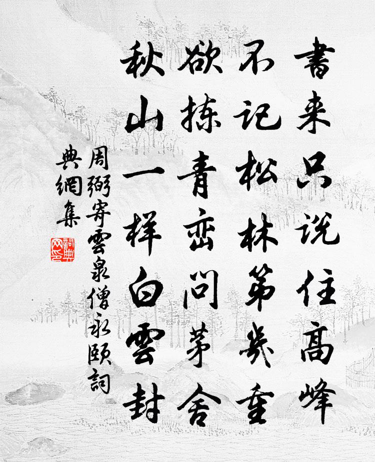 詩詞名句歷史字典書法欣賞書法字典國語詞典說文解字康熙字典古漢語字典標 題 作 者 詩 句 寄雲泉僧永頤作者:周弼 朝代:宋代寄雲泉僧永頤原文書來只說住高峰,不記松林第幾重。欲揀青巒問茅舍,秋山一樣白雲封。詩詞問答問:寄雲泉僧永頤的作者是誰?答:周弼問:寄雲泉僧永頤寫於哪個朝代?答:宋代周弼寄雲泉僧永頤書法欣賞寄雲泉僧永頤書法作品詩詞推薦登冠山次瞻叔兄壁間舊韻魏了翁〔宋代〕又到黃昏別有天,落霞明水月銜山。亂煙遠樹供詩卷,濁酒狂歌伴醉顏。送林子中知成都孔武仲〔宋代〕鞍馬覆山黑,旌旗垂野紅。問遠誰當行,太守臨蜀中。太守時之豪,學博文章工。人事未稱遂,崎嶇已巴東。公年甲子秋八月偶思出遊往往累日不能歸或遠至傍陸游〔宋代〕蓍囊藥芨每隨身,問病求占日日新。向道不能渠豈信,隨宜酬答免違人。和丘師悅二首白菊卷剛中〔宋代〕先放恐輪梅,籬邊趁早開。素心甘冷澹,秀色肯塵埃。眼老書慵看,官閒吏不催。煩君助幽勝,小鍤為移來。久過重陽菊英粲然即事十首方回〔宋代〕江南菊花差晚開,把酒前蘭復後梅。天公何嘗負此老,天下腐儒臣方回。醉蓬萊王吉昌〔元代〕混元形一氣,位析乾坤,朴分呈瑞。曠劫難逃,被陰陽相累。頓悟回、光合和金,木簇坎離精粹。瘴海風高,雲行登安仁雲錦驛後挹仙亭三首趙蕃〔宋代〕未解桃源果有無,樹林樓閣世行圖。此亭縱說空無物,猶有仙山來坐隅。天神二首釋師範〔宋代〕天下梅花主,扶桑文字祖。這個 * 眼,雲門答道普。菅君本不假凡胎,直自靈山會上來。五百年間無識者,扶桑官軍行汪琬〔清代〕亂飛沙禽吠村狗,官軍夜逾谷城口。大船小船爭避行,長年吞聲復搖手。錦袍繡箙月中明,牛肉粗肥挏乳清。胡琴戀繡衾趙時奚〔宋代〕江南煙水幾萬重。記玉人、花底舊容。待欲寄、飛鴻信,望前山、夕照冷紅。塞笳月下聲淒楚,怨百花、春事夢空雨陸游〔宋代〕秋冬久不雨,氣濁喜雲生。麥壟崇朝潤,茆檐徹夜聲。初來斷幽徑,漸密雜疏更。賴有牆陰薺,離離已可烹。鷓鴣天佚名〔宋代〕新月光寒昨夜霜。三年不一奉瑤觴。朱顏大藥知能駐,白日仙家豈計長。楓漸赤,橘初黃。五湖煙水動歸航。且傾曾公卷育陳子南昭亭詩因次韻吳則禮〔宋代〕君不見唐時畫馬曹將軍,肯道江都也絕倫。又不見即今陳郎論句法,頭頭未背少陵人。往時屢費曾郎酒,作意澆潑句厲文翁〔宋代〕且喜臥龍常自在,新詩特地報平安。代家君答聞老詩三首唐仲友〔宋代〕江山天借使詩昌,太守風流似沈郎。莫作推敲沖導其,好攜佳句過黃堂。重陽文天祥〔宋代〕江南秋色滿梧桐,回首青山萬事空。怕見鏡中新白髮,長將破帽裹西風。梅花孫應時〔宋代〕眼明那得許精神,為問凡花隔幾塵。雪月故為三益友,乾坤又付一番春。詩情消得吟成瘦,畫手終應苦未真。於我黃守不飲茶朱翌〔宋代〕賓客相傳無水厄,欣然脫屐上公堂。滌煩療渴名雖著,瘠氣侵精暗有妨。夢寐無憂眠可熟,清虛自積體尤強。樵青醉題齋壁真山民〔宋代〕此是閒中安樂窩,從渠忙處為奔波。人心少似秋胡婦,世事多參春夢婆。但把功名齊蟻蛭,定無榮辱到漁蓑。醉鄉窗下仇遠〔宋代〕黃昏忽上雲,西窗竟無月。燭花自盈枝,可玩不可折。天風吹鐘聲,急急吹燭滅。可惜窗下書,少讀三四葉。名句推薦凡有血氣,皆有爭心左丘明《左傳·昭公·昭公十年》 親戚不附,無務外交。墨子《墨子·02章 修身》 歡宴良宵好月,佳人修竹清風。吳文英《風入松·麓翁園堂宴客》 黃雞白酒,君去村社一番秋。辛棄疾《水調歌頭·送楊民瞻》 辛勤三十日,母瘦雛漸肥。白居易《燕詩示劉叟》 正不容邪,邪復妒正。曹雪芹《紅樓夢·第二回》 男兒何不帶吳鉤,收取關山五十州。李賀《南園十三首·其五》 尊前只恐傷郎意,閣淚汪汪不敢垂。夏竦《鷓鴣天·鎮日無心掃黛眉》 去年今日此門中,人面桃花相映紅。崔護《題都城南莊》 生而不有,為而不恃,長而不宰。是謂玄德。老子《老子·道經·第十章》