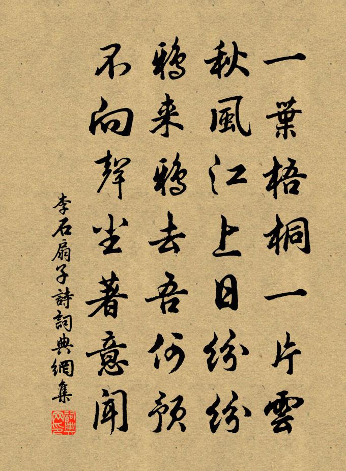 詩詞名句歷史字典書法欣賞書法字典國語詞典說文解字康熙字典古漢語字典標 題 作 者 詩 句 扇子詩作者:李石 朝代:宋代扇子詩原文一葉梧桐一片雲,秋風江上日紛紛。鴉來鴉去吾何預,不向聲塵著意聞。詩詞問答問:扇子詩的作者是誰?答:李石問:扇子詩寫於哪個朝代?答:宋代李石扇子詩書法欣賞扇子詩書法作品詩詞推薦頌古五十五首釋紹曇〔宋代〕美如西子離金闕,嬌似楊妃倚玉樓。猶把琵琶半遮面,不令人見轉風流。登嶺潘牥〔宋代〕黃茅連遠近,不見一人行。信步未知險,回頭方可驚。路由高頂過,雲在半腰生。落日無棲止,飄飄自問程。無題錢時〔宋代〕臨池綠樹陰陰合,入竹黃花顆顆新。世外別無安樂國,寰中真有太平人。從北流入鬱林望月岩曾豐〔宋代〕青山罅外見青天,翡翠屏間一鏡懸。表里集虛生至白,初終持滿得長圓。光明照處人心足,混沌開時物理全。它義慶一上人釋祖欽〔宋代〕識得一,萬事畢,慶快平生是今日。佛祖單傳無二心,生死洞然空四壁。匆匆聞訃來歸,不礙獨行特立。群峰疊亂滿江紅黃人傑〔宋代〕小隊旌旗,又催送、元戎領客。政十頃、荷香微度,草煙橫碧。楊柳參差新合翠,水天上下俱齊色。傍野橋、容與葛氏鼎歐陽修〔宋代〕大河昔決東南流,蕭條東郡今止湫。我從故老問其由,雲古五鼎藏高丘。地靈川秀草木稠,鬱郁佳氣蒸常浮。惟物生查子洪适〔宋代〕七月到盤洲,枕簟新涼早。岸曲側黃葵,沙際排紅蓼。團團歌扇疏,整整爐煙裊。環坐待橫參,要乞珠絲巧。閒居雜詠三十二首信陳淳〔宋代〕信以實諸言,於外無妄宣。要須循爾物,何可背其然。過達磨泉緬懷東坡曾豐〔宋代〕分野秦南海,城池漢尉佗。功名徒自苦,寒暑暗相磨。破寺容僧少,枯松閱士多。我來空想像,百世一東坡。奉和魯望薔薇次韻皮日休〔唐代〕誰繡連延滿戶陳,暫應遮得陸郎貧。紅芳掩斂將迷蝶,翠蔓飄颻欲掛人。低拂地時如墮馬,高臨牆處似窺鄰。只應游寺醉歸卻寄同坐李覯〔宋代〕江村古寺偶閒行,一飲全疑酒有靈。水底屈原應大笑,我今獨醉眾人醒。湖景施清臣〔宋代〕一曲新腔紫玉簫,護晴檐幙窣蘭橈。柳迷遠近花張錦,小泊危紅第六橋。醉臥至夜半半醒中若有所愧者聞空庭石渠流水史堯弼〔宋代〕吾生少懽娛,遇酒增慨慷。殷床惟一眠,萬慮幾消亡。半夜還有覺,惕然喟中腸。世故何足道,誠恐此志荒。人生詠史詩昆明池胡曾〔唐代〕欲出昆明萬里師,漢皇習戰此穿池。如何一面圖攻取,不念生靈氣力疲。對花方乾〔唐代〕清曉入花如步障,戀花行步步遲遲。含風欲綻中心朵,似火應燒外面枝。野客須拚終日醉,流鶯自有隔年期。使君題涪江石魚次何憲韻盛辛〔宋代〕巨浸浮空無咱通,雙鱗紀瑞杳難窮。昔人刻石留山趾,今日呈祥表歲豐。眾喜有年歌善政,獨慚無補助成功。須知仙巢李石〔宋代〕仙人九天上,驂鸞紲飛虬。飄飄紫霄御,下作人間游。二十四洞天,海上橫十洲。乾門鑿井絡,丹梯雲氣浮。中有白居易有望闕雲遮眼思鄉雨滴心之句用其韻為鄭剛中〔宋代〕老松成偃蓋,瘦竹抱虛心。清風度其中,瑟瑟韶濩音。聽這遂熟寐,飄然歸故林。三洞既生款,赤松亦幽尋。高樓蔡仲謀遺鯽魚十六尾余憶在襄城時獲此魚留以梅堯臣〔宋代〕昔嘗得圓鯽,留待故人食。今君遠贈之,故人大河北。欲膾無庖人,欲寄無鳥翼。放之已不活,烹煮費薪棘。名句推薦漢家君臣歡宴終,高議雲台論戰功。王維《少年行四首》 秋夜訪秋士,先聞水上音。袁枚《夜過借園見主人坐月下吹笛》 常記溪亭日暮,沉醉不知歸路。李清照《如夢令·常記溪亭日暮》 浮生長恨歡娛少。宋祁《玉樓春·春景》 天生我材必有用,千金散盡還復來。李白《將進酒》 隋堤三月水溶溶。背歸鴻,去吳中。蘇軾《江神子·恨別》 心生,種種魔生;心滅,種種魔滅。吳承恩《西遊記·第十三回》 愛而知其惡,憎而知其善。戴聖《禮記·曲禮上》 念往昔,繁華競逐,嘆門外樓頭,悲恨相續。王安石《桂枝香·登臨送目》 雨雪雰雰,益之以霢霂。佚名《信南山》