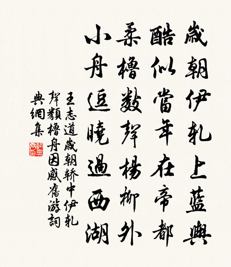 詩詞名句歷史字典書法欣賞書法字典國語詞典說文解字康熙字典古漢語字典標 題 作 者 詩 句 歲朝轎中伊軋聲類櫓舟因感舊遊作者:王志道 朝代:宋代原文歲朝伊軋上藍輿,酷似當年在帝都。柔櫓數聲楊柳外,小舟逗曉過西湖。詩詞問答問:《歲朝轎中伊軋聲類櫓舟因感舊遊》的作者是誰?答:王志道問:該詩寫於哪個朝代?答:宋代書法欣賞歲朝轎中伊軋聲類櫓舟因感舊遊書法作品詩詞推薦送何白節推宰晉原二首范仲淹〔宋代〕此行深惜別,所喜是寧親。祖帳千門曉,鄉關錦國春。鳥歌疑勸酒,山態似迎人。我絕南陔望,因兄淚滿巾。扇子詩李石〔宋代〕積雨莓苔色,秋風松桂林。莫隨蓬鬢改,黃落見真心。小檥袁家窯竹居買酒樂雷發〔宋代〕江繞衡門接旅津,鯉魚風曷水粼粼。湘醨三盞澆吟思,瀟碧千竿對老身。題筆未能行客醉,典琴不用主人貧。隔江宴坐之地籧篨覆之名曰蓬齋陳與義〔宋代〕不須杯勺了三冬,旋作蓬齋待朔風。會有打窗風雪夜,地爐孤坐策奇功。宛陵道院陳允平〔宋代〕闕角溪城下,千年黑蟒蟠。雲深仙宅窅,竹密醮壇寒。漢量銅花綠,隋鍾火籀凡。天風步虛靜,微月聽鳴鑾。醉題埭西酒家陸游〔宋代〕桑麻蒙翳不通鄰,耽酒頹然一老民。遣客方眠那是醉?有衣可典未為貧。曬翎斜日鷗來熟,印跡平沙雁到新。君看王氏松齋詩張舜民〔宋代〕人傳半隱在龍門,天啟松齋遇遠孫。水石蔽虧包廢寺,版圖磨滅指鄰村。如將綠野還裴度,不見潛溪付李藩。壁土泛舟鑑湖同程致道趙來叔聯句題宗蘭館圃趙子書〔宋代〕疏食深山謝擊鮮,瓠肥那得此枵然。祗應久絕紛華念,變笑臞儒不是仙。無題陳杰〔宋代〕聞道江邊起柁樓,欲將吾道付滄洲。三年惡瞰盧仝屋,一日輕裝范蠡舟。蹈海高懷欣獨往,濟川好手蹇難留。檣陰自吉水乘月放舟至玄潭趙蕃〔宋代〕木葉未盡脫,水光真接天。蒼然江上石,兀爾渡頭船。酒有三杯飽,詩無萬斛泉。冥冥鴻鵠舉,渺渺鷺鷗眠。霅溪夜宴詩(命曹娥唱怨江波三疊)水神〔唐代〕悲風淅淅兮波綿綿,蘆花萬里兮凝蒼煙。虬螭窟宅兮淵且玄,排波疊浪兮沈我天。所覆不全兮身寧全,溢眸恨血兮次諸公詩韻陳造〔宋代〕牆圍護風煙,檐影納紅綠。城西百弓地,論價指和玉。滄浪取具體,輞川儼遺躅。年時得小憩,振衣休汗足。山靈賦示校員及諸生梁啓超〔清代〕在昔吾居夷,希與塵客接,箱根山一月,歸裝稿盈篋。雖匪周世用,乃實與心愜,如何歸乎來?兩載投牢筴。愧傣寒山把蕉葉執筆贊釋子益〔宋代〕吟詩吟未就,執筆且搜枯。欲寫芭蕉上,依前一字無。虞美人(雁門作)王安中〔宋代〕千山青比妝眉淺。卻奈眉峰遠。玉人元自不禁秋。更算惱伊深處、月當樓。分攜不見憑闌際。只料無紅淚。萬千應光華亭魏伯恂〔宋代〕亭高爽塏聳牙檐,萬種森羅共一川。坐使江山歸舊觀,欣年童稚望郵船。柳煙烘日塵迷渚,麥浪降風翠拍天。民物讀史八首陳普〔宋代〕王莽當年似姬旦,煬皇前日肖曾參。擔囊揭篋何須逐,盜賊誰無仁義心。奉寄胡教授岳珂〔宋代〕山中秋風寒刮席,忽憶無氈泮宮客。夜長螢火一燈孤,四壁蛩聲更幽寂。文人自古常獨清,強輓詩人同此盟。飯顆次韻鄧善之書懷七首方回〔宋代〕我聽髯張作,清於月夜笳。曹思先七子,杜老到三巴。有力能推拉,無疵可汰沙。文潛遺論在,霜露老蒹葭。鳳棲梧/蝶戀花高觀國〔宋代〕雲喚陰來鳩喚雨。謝了江梅,可踏江頭路。拚卻一番花信阻。不成日日春寒去。見說東風桃葉渡。岸隔青山,依舊名句推薦大堤欲上誰相伴,馬踏春泥半是花。竇鞏《襄陽寒食寄宇文籍》 暗室虧心,神目如電。徐田臣《戲文·殺狗記》 粉色全無飢色加,豈知人世有榮華。杜荀鶴《蠶婦》 故國三千里,深宮二十年。張祜《宮詞·故國三千里》 君子以行言,小人以舌言佚名《孔子家語·顏回》 話不在多說,有理不在高聲!佚名《增廣賢文·下集》 投宿駸駸征騎,飛雪滿孤村。孔夷《南浦·旅懷》 人之事兄,不可同於事父,何怨愛弟不及愛子乎?顏之推《顏氏家訓·兄弟篇》 深院鎖黃昏,陣陣芭蕉雨。歐陽修《生查子·含羞整翠鬟》 睡起莞然成獨笑,數聲漁笛在滄浪。蔡確《夏日登車蓋亭》