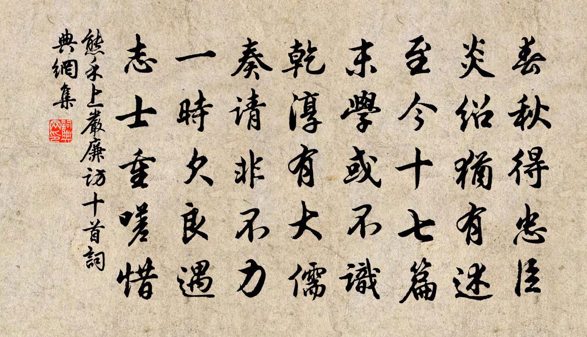詩詞名句歷史字典書法欣賞書法字典國語詞典說文解字康熙字典古漢語字典標 題 作 者 詩 句 上嚴廉訪十首作者:熊禾 朝代:宋代上嚴廉訪十首原文春秋得忠臣,炎紹猶有述。至今十七篇,末學或不識。乾淳有大儒,奏請非不力。一時欠良遇,志士重嗟惜。詩詞問答問:上嚴廉訪十首的作者是誰?答:熊禾問:上嚴廉訪十首寫於哪個朝代?答:宋代熊禾上嚴廉訪十首書法欣賞上嚴廉訪十首書法作品詩詞推薦秋夜對客王邁〔宋代〕旋燒香鴨剔銀缸,風卷銀蟾上矮窗。詩癖苦無廳藥療,睡魔賴有建茶降。迴環蛙部疑成兩,接續蟬笙不計雙。好友下直早出鄭畋〔唐代〕諸司人盡馬蹄稀,紫帕雲竿九釘歸。偏覺石台清貴處,榜懸金字射晴暉。顯禪人求頌釋正覺〔宋代〕顯處機須隱,忙時智自閒。泥牛初出海,玉馬復臨關。寒水澄涵月,流雲靜倚山。回途分化柄,不作舊家慳。謝陳詹山惠蠟梅吳芾〔宋代〕歲晚相逢眼已明,一枝還復見高情。幽香不與江梅共,要與夫君鬭獨清。海康書事十首秦觀〔宋代〕粲粲庵摩勒,作湯美無有。上客賦驪駒,玉奩開素手。那知蒼梧野,棄置同芻狗。荊山玉抵鵲,此事繇來久。樂府曹植〔魏晉〕膠漆至堅。浸之則離。皎皎素絲。溺色染移。君不我棄。讒人所為。夜宿太清悟真成道宮白玉蟾〔宋代〕朱樓紫殿貼晴空,前後千峰更萬峰。蝶殢秋花黃淡佇,猿啼曉樹翠溟濛。斷霞煙重苔粘露,薄暮雲興夜起風。醉倚禽獸昆蟲之孝十首燕雀林同〔宋代〕共母一屋下,寧知屋欲然,不須譏寡智,相哺政堪憐。偈頌一百零九首釋可湘〔宋代〕溈仰兩爺兒,採茶機對機。只知呈體用,不覺露槍旗。正值風和日暖,何妨把手同歸,子規啼破已多時。同韓子東賞牡丹李石〔宋代〕嗚嗚曉角春風送,日日官身隨鳥動。但知敲傍負佳辰,縱有芳菲難入夢。起尋北郭新雨後,愁見西山含雪凍。茅茨小師智寬與國清作丐請語釋正覺〔宋代〕入廛一缽是生涯,來自寒山拾得家。曉影玉鉤蘿戶月,春叢黃粉密房華。午炊佛土香傳鼻,參飽雲門飯打牙。準擬醉花陰(木犀)丘崈〔宋代〕碧玉槎椏金粟小。山路驚秋老。倒倚濕寒煙,似怯秋風,閣淚啼清曉。銅壺冷浸宜深窈。人試新妝巧。雲鬢一枝斜和真長木犀孫應時〔宋代〕香傳萬里到蠶叢,依舊江南林下風。憶著小山招隱句,不堪流落更相逢。秋風蘇泂〔宋代〕秋風荷葉老,秋月桂枝生。萬物四時意,八荒雙眼明。憂虞滋疾病,治亂閱陰晴。秔稻今年少,無勞社酒傾。秋夜五鼓初起坐堂上至旦陸游〔宋代〕蒸郁不可過,開門星滿天。身還倚藤杖,手自酌岩泉。雞唱猶相續,鴉飛忽已翩。事隨朝日出,佳思復茫然。對酒白居易〔唐代〕漫把參同契,難燒伏火砂。有時成白首,無處問黃芽。幻世如泡影,浮生抵眼花。唯將綠醅酒,且替紫河車。鷓鴣天趙長卿〔宋代〕綽約肌膚巧樣妝。風流元自有清香。未應傅粉疑平叔,卻笑荷花似六郎。浮蟻瓮,入詩囊。學人消瘦怯風霜。午窗過中岩渡月出峨眉山程公許〔宋代〕返照中岩流,峨眉分外清。一彎新吐月,共我兩忘形。露下沙逾白,宵寒酒易醒。荻花風索索,擁被不堪聽。定風波(次楊茶使七夕韻)京鏜〔宋代〕何必穿針上彩樓。剖瓜插竹訴窮愁。聞道天孫相會處,銀漢無津,不待泛蘭舟。動是隔年尋素約,何似,每逢清夢題許公寨驛王之道〔宋代〕畏景還迎日,追涼偶溯風。泉聲山上下,松影路西東。遠覽心猶壯,清吟語自工。雨多何所喜,郡國慶年豐。名句推薦鵲辭穿線月,花入曝衣樓。李賀《七夕》 一曲高歌一樽酒,一人獨釣一江秋。王士禎《題秋江獨釣圖》 休問梁園舊賓客,茂陵秋雨病相如。李商隱《寄令狐郎中》 過目成誦,出口成章。馮夢龍《警世通言·卷三》 先淡後濃,先疏後親,先遠後近,交友道也。陳繼儒《小窗幽記·集醒篇》 晚風庭院落梅初。淡雲來往月疏疏。李清照《浣溪沙·髻子傷春慵更梳》 芳菲歇。故園目斷傷心切。向子諲《秦樓月·芳菲歇》 獵人箭底求傷雁,釣戶竿頭乞活魚。王建《寄舊山僧》 奇文共欣賞,疑義相與析。陶淵明《移居二首》 安上治民,莫善於禮。孔子及其弟子《孝經·廣要道》