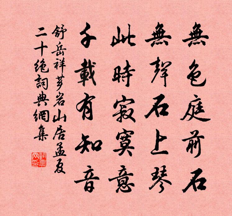詩詞名句歷史字典書法欣賞書法字典國語詞典說文解字康熙字典古漢語字典標 題 作 者 詩 句 薌岩山居孟夏二十絕作者:舒岳祥 朝代:宋代薌岩山居孟夏二十絕原文無色庭前石,無聲石上琴。此時寂寞意,千載有知音。詩詞問答問:薌岩山居孟夏二十絕的作者是誰?答:舒岳祥問:薌岩山居孟夏二十絕寫於哪個朝代?答:宋代舒岳祥薌岩山居孟夏二十絕書法欣賞薌岩山居孟夏二十絕書法作品詩詞推薦東林寺芮燁〔宋代〕修竹長林羅水車,梵王家近葛仙宮。耳聞清磬是非靜,心領菩提名利空。啖棗尚知前世事,拈花還遇上機翁。抽簪與微之同賦梅花得香字三首王安石〔宋代〕淺淺池塘短短牆,年年為爾惜流芳。向人自有無言意,傾國天教抵死香。須裊黃金危欲墮,蒂團紅蠟巧能裝。嬋娟謝王立之送蠟梅五首晁補之〔宋代〕恐是凝酥染得黃,月中清露滴來香。定知何遜牽詩興,借與穿簾一點光。次韻答柳通叟問舍求田之詩黃庭堅〔宋代〕少日心期轉謬悠,蛾眉見妒且障羞。但令有婦如康子,安用生兒似仲謀。橫笛牛羊歸晚徑,捲簾瓜芋熟西疇。功名送金竺虔之官閩中曾國藩〔清代〕朋好翩翩去,君今傷此行。春風一杯酒,舊雨十年情。循吏平生志,神仙薄倖名。海隅氛正惡,看法斫長鯨。醉落魄(用范石湖韻)劉學箕〔宋代〕江頭離席。晚潮雙櫓催行色。往來屬玉雙飛白。笑我多情,猶作未歸客。紅塵奔走何時息。歸心還似投林翼。角巾居厚弟示和詩複課十首劉克莊〔宋代〕近傳鐵馬哨榆關,想見西南殺氣蟠。常恐漏名青史上,不令效命白衣間。本無高論生叢謗,虛過明時死厚顏。春水游徑山蘇軾〔宋代〕眾峰來自天目山,勢若駿馬奔平川。中途勒破千里足,金鞭玉登相迴旋。人言山住水亦住,下有萬古蛟龍淵。道贈僧介然張耒〔宋代〕寒窗寫就白雲篇,客至研茶手自煎。儒佛故應同是道,詩書本是不妨禪。長松千尺巢雲鶴,寒嶠三更嘯月猿。請以湖山堂再修僅有方回〔宋代〕飛鳥穿堂柱半欹,春晴猶不似春時。上樑文記臨邛魏,天目洪家卻立碑。薙草李廌〔宋代〕宿草競春力,階除日青青。何心愿滋茂,薙去輒復生。一氣養萬類。蘭藥盡勾萌。何當紉余佩,采採擷芳英。鷓鴣天晏幾道〔宋代〕小玉樓中月上時,夜來惟許月華知。重簾有意藏私語,雙燭無端惱暗期。傷別易,恨歡遲,歸來何處驗相思。沈郎次韻答黃安中兼簡林子中蘇軾〔宋代〕老去心灰不復然,一麾江海意方堅。那堪黃散付子度,空羨蘇杭養樂天。病肺一春難白酒,別腸三夜繞朱弦。群仙扇子詩李石〔宋代〕達摩一字無法,惠子五車著書。透關九重見虎,離鉤三寸示魚。奉和陳德召游惠山見寄三十韻仲並〔宋代〕飛埃喜污人,餘事忌掛眼。酒浪綠可親,山光翠相挽。折腰素非願,被面有餘赧。從來萬事空,此去百念滿。恰憶依韻和令公大王薔薇詩徐鉉〔唐代〕綠樹成陰後,群芳稍歇時。誰將新濯錦,掛向最長枝。卷箔香先入,憑欄影任移。賞頻嫌酒渴,吟苦怕霜髭。架迥喜雨上項帥陳元晉〔宋代〕業祈三日竟成霖,一瓣心香格帝歆。苗若遂枯無此水,粟將暴貴涌於金。時方多壘農為急,公在三湘澤已深。自愧初冬至近村陸游〔宋代〕南國霜常晚,初冬葉始紅。曠懷牛屋下,美睡雨聲中。沮水憶浮馬,幡山思射熊。何由效唐將,八十下遼東?淮陽張耒〔宋代〕淮陽古帝墟,鄙夫少所游。最愛城西路,槐榆拱高秋。城下古濠水,清澄泓不流。嗟哉始封君,千古留一丘。西風鵲橋仙(三月廿一)梅坡〔宋代〕華桐日永,泛蘭風細,節近朱明十日。玉麟何事吐書來,瑞世應、文章東壁。綠衣戲彩,金樽酌醴,蘭玉階庭森列名句推薦酒能成事,酒能敗事施耐庵《水滸傳·第四回》 聞道梅花坼曉風,雪堆遍滿四山中。陸游《梅花絕句》 萬里歸船弄長笛,此心吾與白鷗盟。黃庭堅《登快閣》 故國山川,故園心眼,還似王粲登樓。周密《一萼紅·登蓬萊閣有感》 倚篷窗無寐,引杯孤酌。張元乾《滿江紅·自豫章阻風吳城山作》 安民之術,在於豐財。豐財者,務本而節用也。陳壽《三國志·魏書·任蘇杜鄭倉傳》 幾硯昔年游,於今成十秋。司馬光《送龔章判官之衛州·新及第》 雨過月華生,冷徹鴛鴦浦。柳永《甘草子·秋暮》 功蓋三分國,名成八陣圖。杜甫《八陣圖》 恃人不如自恃也,明於人之為己者不如己之自為也。韓非及後人《韓非子·外儲說右下》