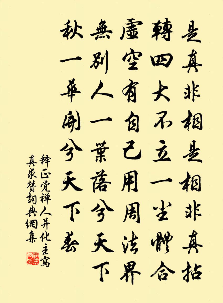 詩詞名句歷史字典書法欣賞書法字典國語詞典說文解字康熙字典古漢語字典標 題 作 者 詩 句 禪人並化主寫真求贊作者:釋正覺 朝代:宋代禪人並化主寫真求贊原文是真非相,是相非真。拈轉四大,不立一塵。體合虛空有自己,用周法界無別人。一葉落兮天下秋,一華開兮天下春。詩詞問答問:禪人並化主寫真求贊的作者是誰?答:釋正覺問:禪人並化主寫真求贊寫於哪個朝代?答:宋代釋正覺禪人並化主寫真求贊書法欣賞禪人並化主寫真求贊書法作品詩詞推薦阮步兵顏延之〔南北朝〕阮公雖淪跡,識密鑒亦洞。沉醉似埋照,寓詞類托諷。長嘯若懷人,越禮自驚眾。物故不可論,途窮能無慟。挽程尚書詞項安世〔宋代〕人間一日履聲藏,天上文昌落在芒。直諒無朋今魏汲,師承有法古韋康。思陵冊府嚴招騁,孝廟經帷盛表章。歲晚寒食雨作楊萬里〔宋代〕雙燕沖簾 * 煙,喚驚晝夢聳詩肩。晚寒政與花為地,曉雨能令水作天。桃李海棠聊病眼,清明寒食又來年。老來清音堂與趙德莊太常小飲,在餘干琵琶洲傍,范成大〔宋代〕曲浦彎環繞縣青,一杯閒客兩飄零。琵琶不語蒼煙暮,山水清音著意聽。次山房岐絲吟韻何夢桂〔宋代〕南北本同歸何人泣異岐。玄黃本同質,何人悲素絲。悲泣不自己,吾故憫翟朱。聖賢急救世,猶或與心違。二子救壽崇節致語口號王義山〔宋代〕東極承顏肅紫宸,恩醲湛露燕群臣。香傳禁柳鳴球瑟,影顫宮花藹縉紳。璀璨祥光三殿曉,怡愉和氣萬年春。明朝句章縡〔宋代〕船尾淮山青未了,馬頭隋柳綠相迎。遠浦歸帆楊公遠〔宋代〕江山勝處簇人家,樓閣重重枕水涯。試倚闌乾凝望眼,帆歸遠浦隔蘆花。題馬侍中燧木香亭邵楚萇〔唐代〕春日遲遲木香閣,窈窕佳人褰繡幕。淋漓玉露滴紫蕤,綿蠻黃鳥窺朱萼。橫漢碧雲歌處斷,滿地花鈿舞時落。樹影吳君送水仙花並二大本黃庭堅〔宋代〕折送南園栗玉花,並移香本到寒家。何時持上玉宸殿,乞與宮梅定等差。經端溪峽中楊衡〔唐代〕陰岸東流水,上有微風生。素羽漾翠澗,碧苔敷丹英。重林宿雨晦,遠岫孤霞明。飛猱相攀牽,白雲亂縱橫。有客次仲舅韻寄拙庵樓鑰〔宋代〕涵秋古澗落珠旒,幾欲相將作勝游。芒屩未穿心已懶,不如莫莫且休休。次韻元發弟秋日德余庵書事二首王之道〔宋代〕飽諳世事轉疏慵,投老猶能向佛宮。危坐遂移桑蔭日,清談仍對菊花風。憑君為我追歡伯,自此游山作醉翁。聞說失性張耒〔宋代〕失性摧頹君子鶴,忘羞跳擲沐猴冠。須知六合梟鸞雜,供與閒人靜處看。送王宣子赴廬陵守曾幾〔宋代〕秋風送遠廬陵守,車騎光華鬢未斑。早歲名高天下士,同時身到海中山。淹回二水分流處,邂逅千岩競秀間。行矣送供奉喻鍊師歸天目山李頻〔唐代〕承恩雖內殿,得道本深山。舉世相看老,孤峰獨自還。溪來青壁里,路在白雲間。絕頂無人住,雙峰是舊關。哭詩六章王令〔宋代〕朝歌憂思多,暮歌無奈何。偶嘆氣亦絕,未慟血先沱。淚落入口少,不如出眼多。安得常病軀,不為瘠且瘥。木蘭花令黃庭堅〔宋代〕風開水面魚紋皺。暖入草心犀點透。乍看晴日弄柔條,憶得章台人姓柳。心情老大痴成就。不復淋漓沾翠袖。早梅武岡李簿回多問蕭判官東夫楊萬里〔宋代〕客有來從天一隅,相逢喜問子何如。橘洲各自分馬首,湘水更曾烹鯉魚。心近人遐長作惡,離多合少可無書。得知清平樂曹勛〔宋代〕秋涼破暑。暑氣遲遲去。最喜連日風和雨。斷送涼生庭戶。晚來燈火迴廊。有人新酒初嘗。且喜薄衾圍暖,卻愁秋名句推薦空對著,山中高士晶瑩雪曹雪芹《終身誤》 黃衫飛白馬,日日青樓下。陳克《菩薩蠻·赤闌橋盡香街直》 人之愛子,罕亦能均;自古及今,此弊多矣。顏之推《顏氏家訓·教子篇》 晴浦晚風寒,青山玉骨瘦。董以寧《卜運算元·雪江晴月(回文,倒讀《巫山一段雲》 願君多採擷,此物最相思。王維《相思》 梨花院落溶溶月,柳絮池塘淡淡風。晏殊《無題·油壁香車不再逢》 君子莫大乎與人為善。孟子《孟子·公孫丑章句上·第八節》 時有官船橋畔過,白鷗飛去落前灘。姜夔《釣雪亭》 鳳林關里水東流,白草黃榆六十秋。張籍《涼州詞三首·其三》 小知不可使謀事,小忠不可使主法。韓非及後人《韓非子·飾邪》