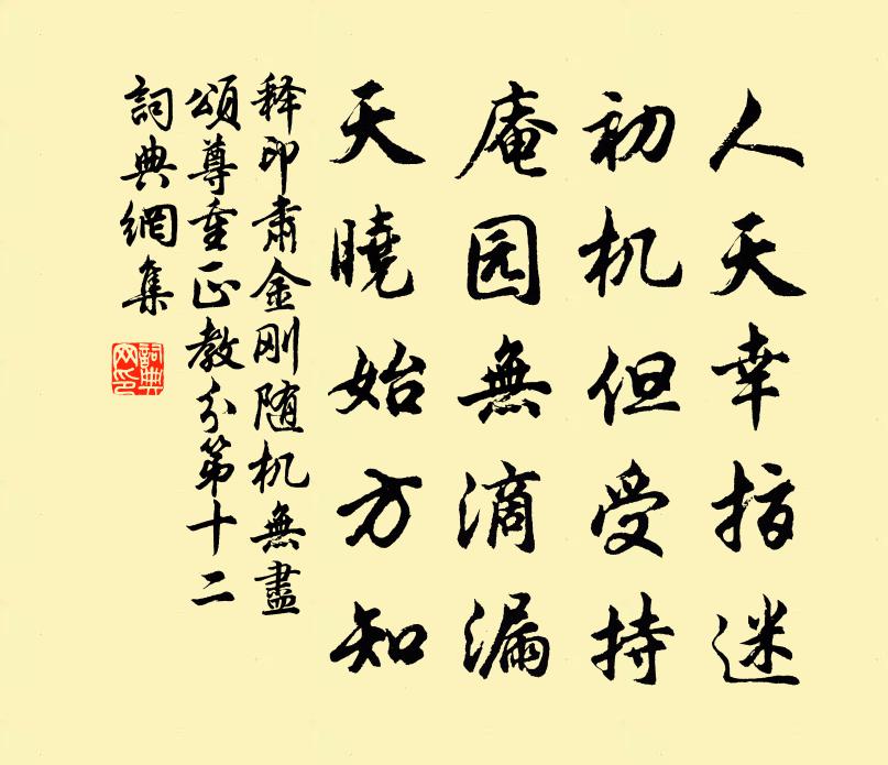 詩詞名句歷史字典書法欣賞書法字典國語詞典說文解字康熙字典古漢語字典標 題 作 者 詩 句 金剛隨機無盡頌尊重正教分第十二作者:釋印肅 朝代:宋代原文人天幸指迷,初機但受持。庵園無滴漏,天曉始方知。詩詞問答問:《金剛隨機無盡頌尊重正教分第十二》的作者是誰?答:釋印肅問:該詩寫於哪個朝代?答:宋代書法欣賞金剛隨機無盡頌尊重正教分第十二書法作品詩詞推薦送故黃文雷〔宋代〕履霜著余悲,送故或古風。幸會草木長,土脈驗隱隆。共惟青鳥仙,倘亦知吾窮。落日起秀色,軍峰在雲中。茶縻許月卿六〔宋代〕玉質清綃愛道裝,不嫌春暮越芬芳。宋□□□□風麝,空使微材恨海棠。聚景園宴集任希夷〔宋代〕晚排閶闔披雲霧,身躡仙蹤游禁宇。始知天上自清涼,不信人間有炎暑。庭前青松笙竽聲,望處紅蕖錦繡雲。月卿雲居寺孤桐白居易〔唐代〕一株青玉立,千葉綠雲委。亭亭五丈余,高意猶未已。山僧年九十,清靜老不死。自雲手種時,一棵青桐子。直從和羅巨濟山居十詠楊萬里〔宋代〕只擁書千卷,何須屋萬間?新堂傍溪水,大字署蓬山。恰有乘風客,來分半日閒。自煎蝦蟹眼,同淪鷓鴣斑。沁園春(寄張仲宗)李彌遜〔宋代〕欹枕深軒,散帙虛堂,畏景屢移。漸披襟臨水,支床就月,蓮香拂面,竹色侵衣。壓玉為醪,折荷當盞,臥看銀潢歸燕詩張九齡〔唐代〕海燕雖微眇, 乘春亦暫來。豈知泥滓賤, 只見玉堂開。繡戶時雙入, 華堂日幾回。無心與物競, 鷹隼莫相首尾吟邵雍〔宋代〕堯夫非是愛吟詩,詩是堯夫不寐時。咀茹蘭薰宜有主,恢張風雅更為誰。三千來首收清月,二十餘年撚白髭。了卻春日盧梅坡〔宋代〕紅芳滿眼鬥風流,誰倍春來有客愁!惆悵不乾桃李事,故山煙雨憶松楸。得昭叔弟書王炎〔宋代〕十年客館出無車,倦跡歸來守敝廬。林下巢傾烏哺斷,天邊風急雁行疏。欲傳訊息苦無便,喜報平安今有書。行李柳葉詞徐照〔宋代〕嫩葉吹風不自持,淺黃微綠映清池。玉人未識分離恨,折向堂前學畫眉。送僧秀游海上諸山王銍〔宋代〕丈室凝塵鎖寂寥,飄然更打衲僧包。春風正滿碧溪水,落口偏宜紅杏梢。身外誰非追日杖,法中我是續弦膠。雲山送趙評事攝御史監軍嶺南孫逖〔唐代〕議獄持邦典,臨戎假憲威。風從閶闔去,霜入洞庭飛。篁竹迎金鼓,樓船引繡衣。明年拜真月,南斗使星歸。畏雨不出簡張端袤昆仲符伯籌諸兄劉宰〔宋代〕我居市北子市南,中間萬口喧春蠶。子來自南我自北,繚繞東西厭匍匐。塊坐不言中有得,谷鳥一聲驚晝息。翻然題蘇公濟所居洪皓〔宋代〕山繞孤村水繞家,傳經載酒有侯芭。眼前十畝無多地,只種桑榆不種花。農謠方岳〔宋代〕問舍求田計未成,一蓑鋤月每含情。春山樹暖鶯相覓,曉隴雨晴人獨耕。別范建康趙蕃〔宋代〕早日學詩才得窮,人窮乃復愧詩工。如公久已獨步外,顧我何堪猥誦中。歲晚人家方墐戶,地長客子尚飄蓬。如聞和鄧友直胡寅〔宋代〕坐看鼓樹溢枯流,快作南江汗漫遊。曉岸林巒光寫鏡,夜客風露冷涵秋。謏聞豈解論三豕,澀思真如曳九牛。但喜上元曾鞏〔宋代〕金鞍馳騁屬兒曹,夜半喧闐意氣豪。明月滿街流水遠,華燈入望眾星高。風吹玉漏穿花急,人近朱闌送目勞。自笑題商山廟段成式〔唐代〕偶出雲泉謁禮闈,篇章曾沐漢皇知。無謀靜國東歸去,羞過商山四老祠。名句推薦想雁空、北落冬深,澹墨晚天雲闊。吳文英《暗香疏影·夾鍾宮賦墨梅》 時見歸村人,沙行渡頭歇。孟浩然《秋登蘭山寄張五》 天之生物必因其材而篤焉。故栽者培之,傾者覆之。子思《中庸·第十七章》 雲壓西村茅舍重,怕他榾柮同燒。陳維崧《臨江仙·寒柳》 清明上巳西湖好,滿目繁華。歐陽修《採桑子·清明上巳西湖好》 生而富者驕,生而貴者傲。范曄《後漢書·列傳·崔駰列傳》 親履艱難者知下情,備經險易者達物偽。范曄《後漢書·列傳·張衡列傳》 積於不涸之倉者,務五穀也管仲《管子·牧民》 榮螈,蜥蜴。佚名《爾雅·釋魚》 遙知獨聽燈前雨,轉憶同看雪後山。納蘭性德《於中好·送梁汾南還為題小影》