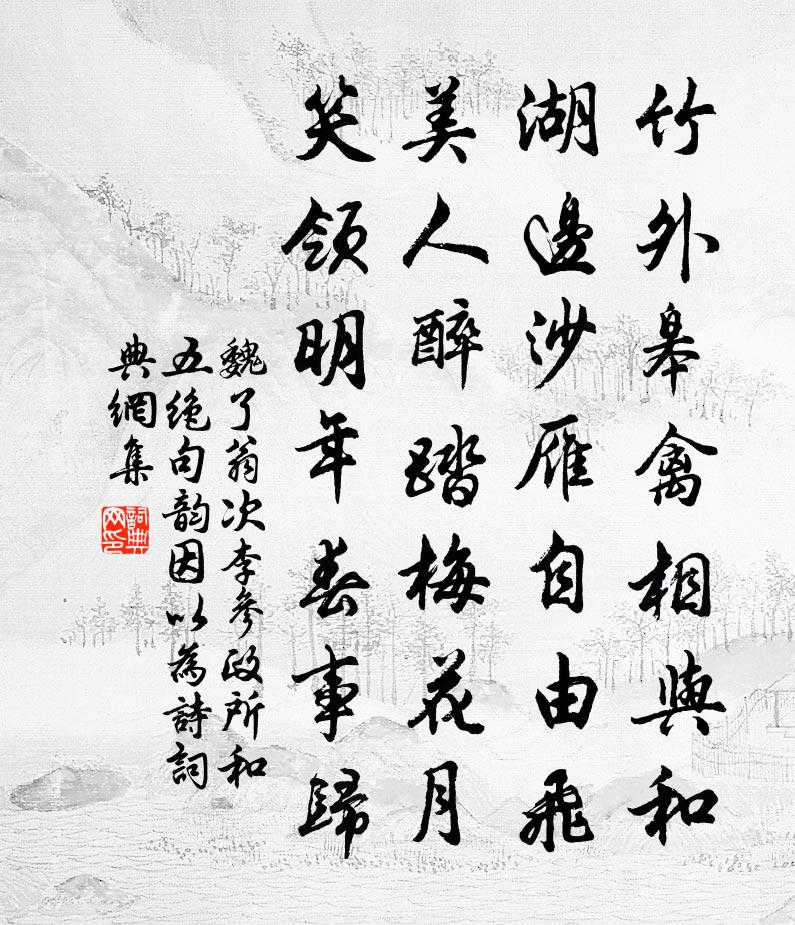 詩詞名句歷史字典書法欣賞書法字典國語詞典說文解字康熙字典古漢語字典標 題 作 者 詩 句 次李參政所和五絕句韻因以為詩作者:魏了翁 朝代:宋代原文竹外皋禽相與和,湖邊沙雁自由飛。美人醉踏梅花月,笑領明年春事歸。詩詞問答問:《次李參政所和五絕句韻因以為詩》的作者是誰?答:魏了翁問:該詩寫於哪個朝代?答:宋代書法欣賞次李參政所和五絕句韻因以為詩書法作品詩詞推薦倦尋芳(林鐘羽花翁遇舊歡吳門老妓李憐,邀分韻同賦此詞)吳文英〔宋代〕墜瓶恨井,分鏡迷樓,空閉孤燕。寄別崔徽,清瘦畫圖春面。不約舟移楊柳系,有緣人映桃花見。敘分攜,悔香瘢贈蘇少府赴任江南余時還京崔湜〔唐代〕丈夫不嘆別,達士自安卑。攬泣固無趣,銜杯空爾為。流雲春窈窕,去水暮逶迤。行舟忽東泛,歸騎亦西馳。秦地五老宋伯仁〔宋代〕髀肉豐腴鬢髮疏,將軍健飯待何旭。七禽不了中原事,羞讀君問勞書。商婦吟楊冠卿〔宋代〕妾本良家子,嫁作商人婦。盪子去不歸,幽閨長獨守。平生松柏心,歲晚柯葉茂。飄絮亂因風,肯若道傍柳。朝來自責元稹〔唐代〕犀帶金魚束紫袍,不能將命報分毫。他時得見牛常侍,為爾君前捧佩刀。山居詩釋延壽〔宋代〕退跡何人繼昔賢,凡途終是事謀先。只知競逐浮雲富,誰解驚嗟逝水年。寒影半疏霜後樹,秋聲千點雨中禪。千般張秘書分符星渚同舍烏別用山谷晚風池蓮香度崔與之〔宋代〕堂堂間世英,大名赫而烜。全才得之天,學力培其本。孤高壁萬仞,清郁蘭九畹。胸中富甲兵,馳聚菁華苑。文武玉川茶吳泳〔宋代〕一旗初試蜀山春,團銙誰論蔡與丁。更出苦言澆諫味,世間醉夢合俱醒。【雙調】清江引_詠笑靨兒一周文質〔元代〕詠笑靨兒一窩粉香堪愛惜,近眼花將墜。添他百媚生,動我千金費。春風小桃初破蕊。送鮑大監赴闕魏野〔宋代〕紫詔徵黃下碧虛,棠郊人送去何如。深宜我後尊三老,未許伊川學二疏。到想煙霞侵幾仗,行愁花雨濕圖書。歸期荊公讀書堂崔復初〔宋代〕一樹秋風啼老烏,鐘山猿鶴近何如。六經不載青苗法,不識當時讀甚書。鑑湖晚望夏竦〔宋代〕新霜脫衰葉,寒日下疏蓬。岸細低疑盡,波平闊似空。橋通越谿水,帆帶剡川風。何處鳴簫鼓,叢祠杳靄中。好事近李之儀〔宋代〕相見兩無言,愁恨又還千疊。別有惱人深處,在懵騰雙睫。七弦雖妙不須彈,惟願醉香頰。只恐近來情緒,似風前九日三首蘇轍〔宋代〕昔忝衣冠舊,今從野老游。籬根菊初綻,瓮面酒新芻。不負重陽節,都無舉世憂。人生定誰是,萬事本悠悠。蝶戀花佚名〔宋代〕月落燈殘人散後。忽到尊前,但覺眉兒皺。數日不來如許瘦。裙腰減盡君知否。公子風流應自有。占斷春光,肯落如夢令朱敦儒〔宋代〕莫恨中秋無月。多點金缸紅蠟。取酒擁絲簧,迎取輕盈桃葉。桃葉。桃葉。唱我新歌白雪。遠煙處默〔唐代〕靄靄前山上,凝光滿薜蘿。高風吹不盡,遠樹得偏多。翠與晴雲合,輕將淑氣和。正堪流野目,朱閣意如何。挽湔江令何公史堯弼〔宋代〕家山岷山第一流,世收科級萬人頭。同時看接才華盛,大夢真成頃刻休。尚憶依蓮王儉逸,空傳治縣次公優。茫茫寓舍偶題潘獻可〔宋代〕習嬾身無用,幽偏性所欣。校書隨馬隊,臨貼愛鵝群。公子悲春草,佳人隔暮雲。此山歸計決,未信有移文。期友人齊己〔唐代〕早晚逐茲來,閒門日為開。亂蛩鳴白草,殘菊藉蒼苔。困臥誰驚起,閒行自欲回。何時此攜手,吾子本多才。名句推薦夭紅過眼隨榮謝,菊秀蘭香自占春。王汝舟《詠歸堂隱鱗洞》 梧桐樹,三更雨,不道離情正苦。溫庭筠《更漏子·玉爐香》 花褪殘紅青杏小。燕子飛時,綠水人家繞。蘇軾《蝶戀花·春景》 何處相逢,登寶釵樓,訪銅雀台。劉克莊《沁園春·夢孚若》 寂寞風蟬至,連翩霜雁來。陰行先《和張燕公湘中九日登高》 明朝望鄉處,應見隴頭梅。宋之問《題大庾嶺北驛》 秋風生渭水,落葉滿長安。賈島《憶江上吳處士》 芳樹無人花自落,春山一路鳥空啼。李華《春行即興》 江深竹靜兩三家,多事紅花映白花。杜甫《江畔獨步尋花七絕句》 山桃紅花滿上頭,蜀江春水拍山流。劉禹錫《竹枝詞·山桃紅花滿上頭》