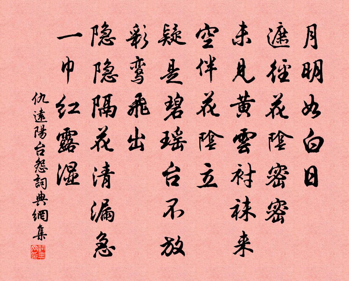 詩詞名句歷史字典書法欣賞書法字典國語詞典說文解字康熙字典古漢語字典標 題 作 者 詩 句 陽台怨作者:仇遠 朝代:宋代陽台怨原文月明如白日。遮徑花陰密密。未見黃雲襯襪來,空伴花陰立。疑是碧瑤台,不放彩鸞飛出。隱隱隔花清漏急。一巾紅露濕。詩詞問答問:陽台怨的作者是誰?答:仇遠問:陽台怨寫於哪個朝代?答:宋代問:陽台怨是什麼體裁?答:詞仇遠陽台怨書法欣賞陽台怨書法作品詩詞推薦詠泉州刺桐丁謂〔宋代〕聞得鄉人說刺桐,葉先花發始年豐。我今到此憂民切,只愛青青不愛紅。雉山黃照〔宋代〕為愛空門息世機,儒衣不著著僧衣。淵魚林鳥已聞法,更待當年瑞雉歸。念奴嬌侯置〔宋代〕競春台榭,媚東風、迤邐繁紅成簇。方霽溪南簾繡卷,和氣充盈華屋。金暖香彝,玉鳴舞佩,春筍調絲竹。烏衣宴題化城寺應物〔唐代〕平高選處創蓮宮,一水縈流處處通。畫閣晝開遲日畔,禪房夜掩碧雲中。平川不見龍行雨,幽谷遙聞虎嘯風。偶與鳳簫閣翫月四首白玉蟾〔宋代〕畫閣巋然百尺危,吹來花片點春衣。黃昏璧月溪心浴,白晝銀盤水面飛。煙雨樓唐天麟〔宋代〕百尺樓高尺賞心,我來猶記舊登臨。四時天色有晴雨,一片湖光無古今。遠塔連雲知寺隱,小舟穿柳覺村深。憑闌問春邵雍〔宋代〕春來愁去只因花,春去愁來翻殢酒。長恨愁多酒力微,為春成病花知否。錢塘寓居陳師道〔宋代〕山水如相識,豪華異昔聞。聲言隨地改,吳越到江分。門閉蕭蕭雨,風催緩緩雲。會隨麋鹿去,長謝犬羊群。偈頌十二首釋道璨〔宋代〕心心急要入岩隈,不合談禪信口開。引得王臣多愛重,遮回又被捉將來。送盧秀才應舉貫休〔唐代〕幾載阻兵荒,一名終不忘。還衝猛風雪,如畫冷朝陽。句好慵將出,囊空卻不忙。明年公道日,去去必穿楊。金陵二首李流謙〔宋代〕龍蟠虎踞帝王州,屢嘆降旗出石頭。不惜家居撞懷了,可因歌舞破除休。露桃滴滴啼宮井,風柳條條絆客舟。春水依韻和永叔內翰酬寄楊州劉原甫舍人梅堯臣〔宋代〕東望淮海間,恨無鴻鵠羽。鴻鵠日已飛,風雪歲將暮。憶聽談老莊,達生無恐懼。我今齒髮疏,何異樹有蠹。離別挽許主簿李處權〔宋代〕攘攘誰逃死,黃泉不獨君。官書載考,五舉擅多文。異日遼東鶴,當年冀北群。承家知有子,翮就看摩雲。上益公十絕為壽寶龜劉過〔宋代〕納錫曾看上九江,又聞詹事奉儲皇。巢成荷上窺仙景,在顧溪中賜印章。四字令·擬花間周密〔宋代〕眉消睡黃。春凝淚妝。玉屏水暖微香。聽蜂兒打窗。 箏塵半妝。綃痕半方。愁心欲訴垂楊。奈飛紅正忙。木蘭花慢 壽陳公望王旭〔元代〕問東原豪傑,先屈指,到元龍。看瀟灑風標,汪洋學海,磊落詞鋒。沂川歲回來往,把乾坤、歌入舞雩風。妙理鳶夜泊黃灣施樞〔宋代〕移近黃灣泊短篷,野雲垂地一溪風。渚香吹散荷花雨,幾點流螢出葦叢。曉雲峰顧岡〔宋代〕一夜乾坤雨乍晴,歸雲無數宿蒼屏。白衣已曬青山曉,茅屋主人猶未醒。奉和章冠之長蘆壁間韻趙善括〔宋代〕征帆來去方旁午,觸我扁舟維荻浦。疏林隱約響鐘魚,一葦可航參佛祖。西風留客意如勤,永日閒消一炷薰。詰朝題杭州南亭姚合〔唐代〕舊隱即雲林,思歸日日深。如今來此地,無復有前心。古石生靈草,長松棲異禽。暮潮檐下過,濺浪濕衣襟。名句推薦長風破浪會有時,直掛雲帆濟滄海。李白《行路難·其一》 見善如不及,見不善如探湯孔子弟子《論語·季氏篇》 知人者智,自知者明。老子《老子·道經·第三十三章》 夢入藍橋,幾點疏星映朱戶。吳文英《荔枝香近·七夕》 至道深微,惟人是弘李大師、李延壽《南史·本紀·卷四》 大丈夫生於亂世,當帶三尺劍立不世之功;今所志未遂,奈何死乎!羅貫中《三國演義·第五十三回》 新帖繡羅襦,雙雙金鷓鴣。溫庭筠《菩薩蠻·小山重疊金明滅》 斜陽獨倚西樓。遙山恰對簾鉤。晏殊《清平樂·紅箋小字》 橫看成嶺側成峰,遠近高低各不同。蘇軾《題西林壁》 寂寞尊前席上,唯愁海角天涯。李清照《轉調滿庭芳·芳草池塘》