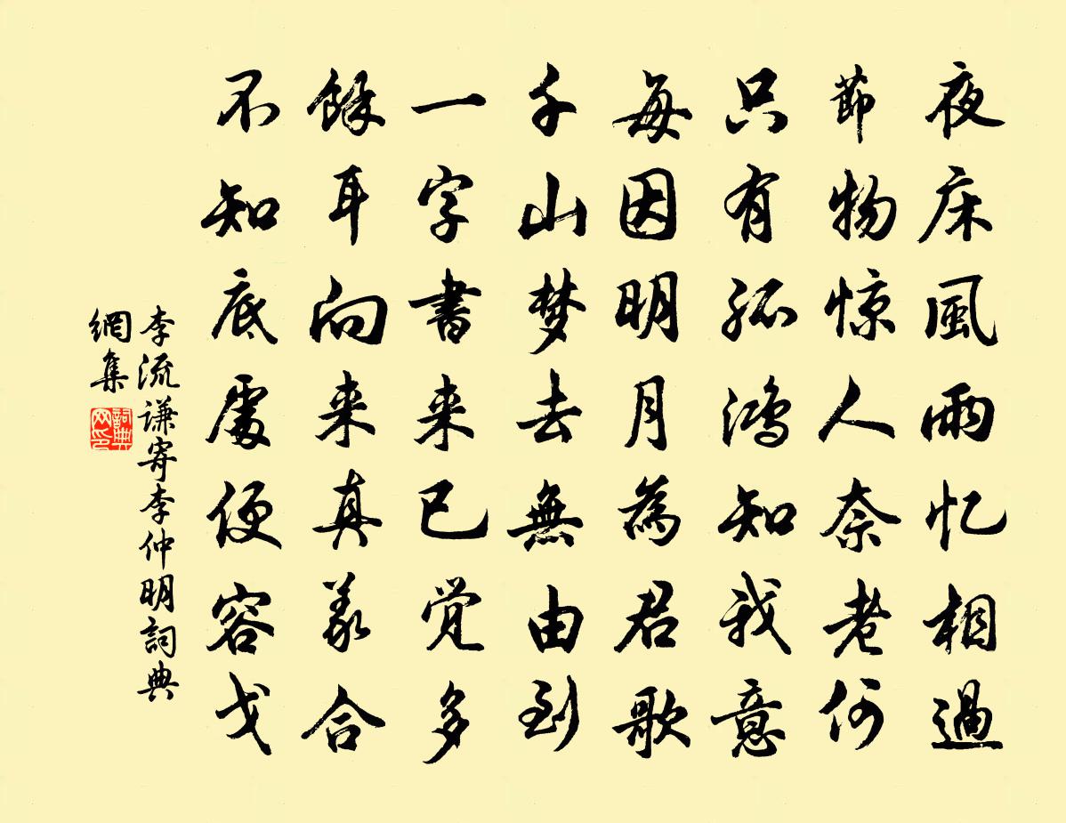 詩詞名句歷史字典書法欣賞書法字典國語詞典說文解字康熙字典古漢語字典標 題 作 者 詩 句 寄李仲明作者:李流謙 朝代:宋代寄李仲明原文夜床風雨憶相過,節物驚人奈老何。只有孤鴻知我意,每因明月為君歌。千山夢去無由到,一字書來已覺多。余耳向來真義合,不知底處便容戈。詩詞問答問:寄李仲明的作者是誰?答:李流謙問:寄李仲明寫於哪個朝代?答:宋代李流謙寄李仲明書法欣賞寄李仲明書法作品詩詞推薦八月十六日過天街懷景仁司馬光〔宋代〕秋潦收四野,晴雲無一斑。忽驚龍六缺,遠見鳴皋山。涼飈入毛髮,顥氣清心顏。悠然念吾友,逍遙城闕間。思陪寄山村仇公徐瑞〔宋代〕山村老子知何似,想見龐眉鶴骨清。千里相望勞遠夢,六年不見耿深情。雲歸山翠沾衣濕,雨過湖光照眼明。最是自武康入京隨即渡越董嗣杲〔宋代〕意杳軒中坐,坐見新竹長。病夫欲尋睡,不禁竹氣涼。昏昏度白日,神倦慵舉觴。偶然探吟處,誰謂醒為狂。扶行嵩山十二首天門泉歐陽修〔宋代〕煙霞天門深,靈泉吐岩側。雲濕顥氣寒,石老林腴碧。長松暫休坐,一酌煩心滌。【中呂】朝天子_湖上癭杯,張可久〔元代〕湖上癭杯,玉醅,夢冷蘆花被。風清月白總相宜,樂在其中矣。壽過顏回。飽似伯夷,閒如越范蠡。問誰,是非,答李道士陳杰〔宋代〕老子廢吟恐妨道,道人學詩如學仟。探藏不惜藏諸密,試換黃庭內景篇。偈頌三十四首釋如淨〔宋代〕大地平沈,此座高廣。千變萬化,無功受賞。紫中貴范成大〔宋代〕沉沉色與露滴,泥泥香隨日烘。滿眼艷妝紅袖,紫綃終是仙風。醉中偶作呈魯望皮日休〔唐代〕谿雲澗鳥本吾儕,剛為浮名事事乖。十里尋山為思役,五更看月是情差。分將吟詠華雙鬢,力以壺觴固百骸。爭得澹岩游五首洪彥華〔宋代〕朝陽岩自次山顯,鈷鉧潭由子厚彰。山不得人名始重,不地不柳□逢黃。句閻伯才〔宋代〕魚貫羸師堪坐縛,爾時可歡蜀無人。木蘭花令黃庭堅〔宋代〕東君未試雷霆手。灑雪開春春鎖透。帝台應點萬年枝,窮巷偏欺三徑柳。峰排群玉森相就。中有摩圍為領袖。凝香賀權郡雨應禱陳宓〔宋代〕衡山開霽雨迴風,正直心期自感通。頓使沾濡千里足,都由精白寸誠中。誰知憂國丹心在,不與農夫喜色同。四海三用韻十首楊公遠〔宋代〕地不喧車馬,蕭然一草廬。曲通樵牧逕,正合野人居。秋老欣禾熟,林寒覺葉疏。高歌仍鼓腹,世事豈關渠。偈傾一百六十九首釋智朋〔宋代〕金剛圈,栗棘蓬。識得衲僧公驗,便是造化爐中。興平縣野中得落星石移置縣齋韓琮〔唐代〕的的墮芊蒼,茫茫不記年。幾逢疑虎將,應逐犯牛仙。擇地依蘭畹,題詩間錦錢。何時成五色,卻上女媧天。滄州道中閻爾梅〔清代〕潞河數百里,家家懸柳枝。言自春至夏,雨澤全未施。燥土既傷禾,短苗不掩陂。轆轤乾以破,井涸園菜萎。舊米三衢道中崔復初〔宋代〕一客在他鄉,行程一月強。雲寒山欲暗,日短道偏長。楓葉嫣如醉,梅花謝亦香。誰家砧杵急,回首感征裳。飯僧王建〔唐代〕別屋炊香飯,薰辛不入家。溫泉調葛面,淨手摘藤花。蒲鮓除青葉,芹齏帶紫芽。願師常伴食,消氣有薑茶。頌古十一首釋有權〔宋代〕我手何似佛手,二八恰恰十九。年尾算開年頭,家內一錢無有。名句推薦夜寒茅店不成眠,殘月照吟鞭。吳激《訴衷情·夜寒茅店不成眠》 水滿有時觀下鷺,草深無處不鳴蛙。陸游《幽居初夏》 深院鎖黃昏,陣陣芭蕉雨。歐陽修《生查子·含羞整翠鬟》 想邊鴻孤唳,砌蛩私語。王沂孫《掃花游·秋聲》 天與短因緣,聚散常容易。晏幾道《生查子·狂花頃刻香》 攻人之惡毋太嚴,要思其堪受;教人以善毋過高,當使其可從。洪應明《菜根譚·概論》 傷心秦漢,生民塗炭,讀書人一聲長嘆。張可久《賣花聲·懷古》 興天下之利,除天下之害。墨子《墨子·12章 尚同(中)》 日歸功未建,時往歲載陰。陸機《猛虎行》 雲物淒涼拂曙流,漢家宮闕動高秋。趙嘏《長安晚秋 / 秋望 / 秋夕》