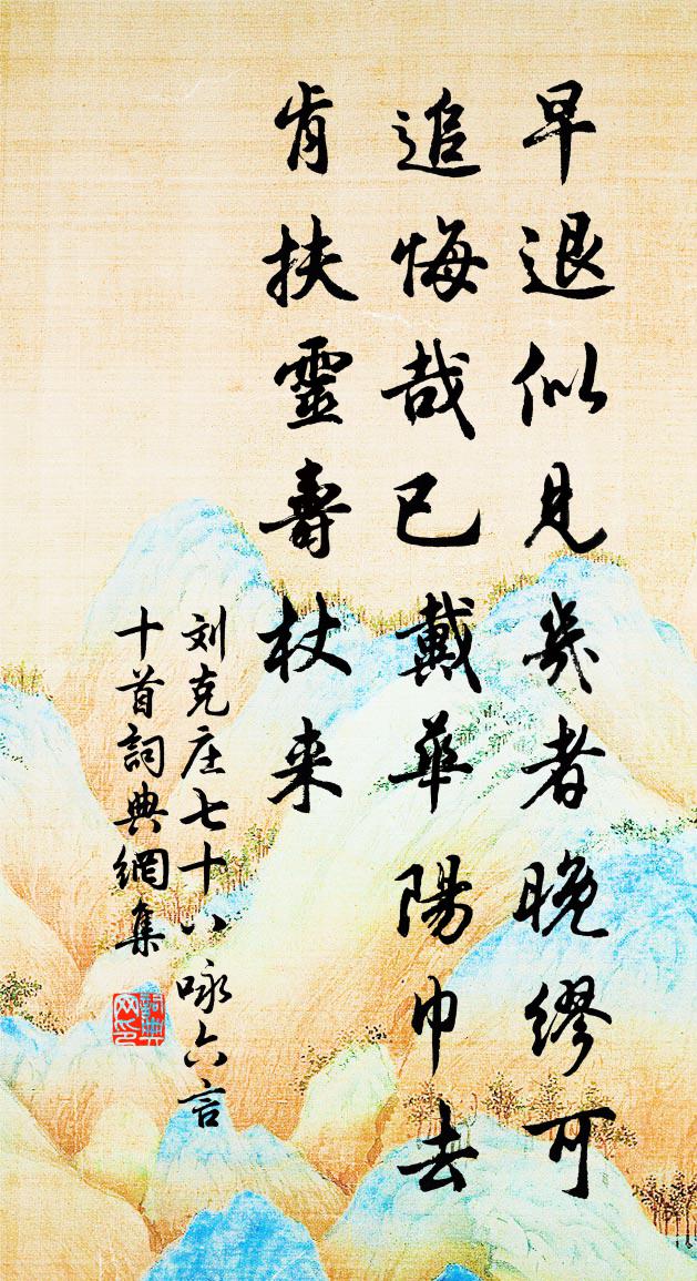詩詞名句歷史字典書法欣賞書法字典國語詞典說文解字康熙字典古漢語字典標 題 作 者 詩 句 七十八詠六言十首作者:劉克莊 朝代:宋代七十八詠六言十首原文早退似見幾者,晚繆可追悔哉。已戴華陽巾去,肯扶靈壽杖來。詩詞問答問:七十八詠六言十首的作者是誰?答:劉克莊問:七十八詠六言十首寫於哪個朝代?答:宋代問:劉克莊的名句有哪些?答:劉克莊名句大全劉克莊七十八詠六言十首書法欣賞七十八詠六言十首書法作品詩詞推薦七夕賦詠成篇許敬宗〔唐代〕一年抱怨嗟長別,七夕含態始言歸。飄飄羅襪光天步,灼灼新妝鑒月輝。情催巧笑開星靨,不惜呈露解雲衣。所嘆考試畢登銓樓梅堯臣〔宋代〕春雲濃淡日微光,雙闕重門聳建章。不上樓來知幾日,滿城無算柳梢黃。江上喜洛中親友繼至許渾〔唐代〕戰馬昔紛紛,風驚嵩少塵。全家南渡遠,舊友北來頻。罷酒松筠晚,賦詩楊柳春。誰言今夜月,同是洛陽人。上陽春/驀山溪佚名〔宋代〕兩日梅開,先占陽春小。鸞鳳偶雁行,飛舞畫堂交繞。稱觴盛旦,二老同年少。夫勸婦,弟酬兄,四喜人希有。靈良月十二日幼望吉甫季雅起淵游上善明日集保錢時〔宋代〕誰道身如不繫舟,吾行非往止非留。霜天未老黃花菊,山北山南兩日游。酹江月/念奴嬌王奕〔宋代〕英雄老矣,對江山、莫遣淚珠成斛。一箑西風休掩面,白浪黃塵迷目。鳳去台空,鷺飛洲冷,幾度斜陽木。欲書往送劉玉田通判歸山羅公升〔宋代〕詩工窮鬼妒,貌古人只譏。達士何榮辱,閒官更是非。面無三已慍,身帶一癯歸。已度囊中法,春田春正肥。大象吟邵雍〔宋代〕大象自中虛,中虛真不渝。施為心事業,應對口功夫。伎倆千般有,憂愁一點無。人能知此理,勝讀五車書。答官仲儒李呂〔宋代〕風俗去古遠,人偽日敗常。故知取士法,時焉立紀綱。設科發自漢,糊名始於唐。前輩務實學,倡道賴歐陽。當世大孤山黃庶〔宋代〕彭蠡百里南國襟,萬頃蒼煙插孤岑。不知天星何時落,春秋不書不可尋。石怪木老鬼所附,茲乃與水同浮沉。鳴鴟鬥雞詩曹植〔魏晉〕游目極妙伎。清聽厭宮商。主人寂無為。眾賓進樂方。長筵坐戲客。鬥雞間觀房。群雄正翕赫。雙翹自飛揚。揮羽閒出白居易〔唐代〕身外無羈束,心中少是非。被花留便住,逢酒醉方歸。人事行時少,官曹入日稀。春寒游正好,穩馬薄綿衣。送琮監寺住院釋法薰〔宋代〕桐江江上一絲風,不釣盲龜只釣龍。浮定有無誰識意,夜涼如水月如弓。長安道中悵然作三首宋祁〔宋代〕興亡作今古,事往始堪悲。宮破黃山在,城空北斗移。走岡寒兔急,啼戍暮鴉飢。灞岸重回首,惟餘王粲詩。題趙葦江雁盪圖柴隨亨〔宋代〕家住溫州雁盪巔,歸帆曾載買山錢。江山寂寂蘆花白,好似今朝紙上船。李牧徐鈞〔宋代〕良將身亡趙亦亡,百年遺恨一馮唐。當時不受讒臣間,呂政何由返故鄉。漁家·賣得鮮魚二百錢鄭燮〔清代〕賣得鮮魚二百錢,米糧炊飯放歸船。 拔來濕葦燒難著,曬在垂楊古岸邊。虞美人利登〔宋代〕當時養士知何許。總把降幡去。漢家王氣塞乾坤。一樹盈盈、不為漢家春。蘇幕遮 別鄉馬鈺〔元代〕棄榮華,披破席。養假崇真,茶飯須求覓。忘了從前親與識。此別鄉關,恣意閒遊歷。主人翁,須愛惜。六賊三屍大人生朝代諸兒五首以春風花草香為韻項安世〔宋代〕何物堪為壽,蟠桃照海涯。栽焙煩阿母,獲守倩神酴。夏果收蕡實,春林炫纈花。等閒開結里,塵世幾河沙。名句推薦美人如花隔雲端。李白《長相思三首》 歸志寧無五畝園,讀書本意在元元。陸游《讀書》 凌余陣兮躐余行,左驂殪兮右刃傷。屈原《國殤》 志士不忘在溝壑,勇士不忘喪其元。孟子《孟子·滕文公章句下·第一節》 閨中少婦不知愁,春日凝妝上翠樓。王昌齡《閨怨》 揚子江頭楊柳春,楊花愁殺渡江人。鄭谷《淮上與友人別》 夔府孤城落日斜,每依北斗望京華。杜甫《秋興八首》 浩蕩離愁白日斜,吟鞭東指即天涯。龔自珍《己亥雜詩·其五》 薊庭蕭瑟故人稀,何處登高且送歸。王之渙《九日送別》 此地一為別,孤蓬萬里征。李白《送友人》