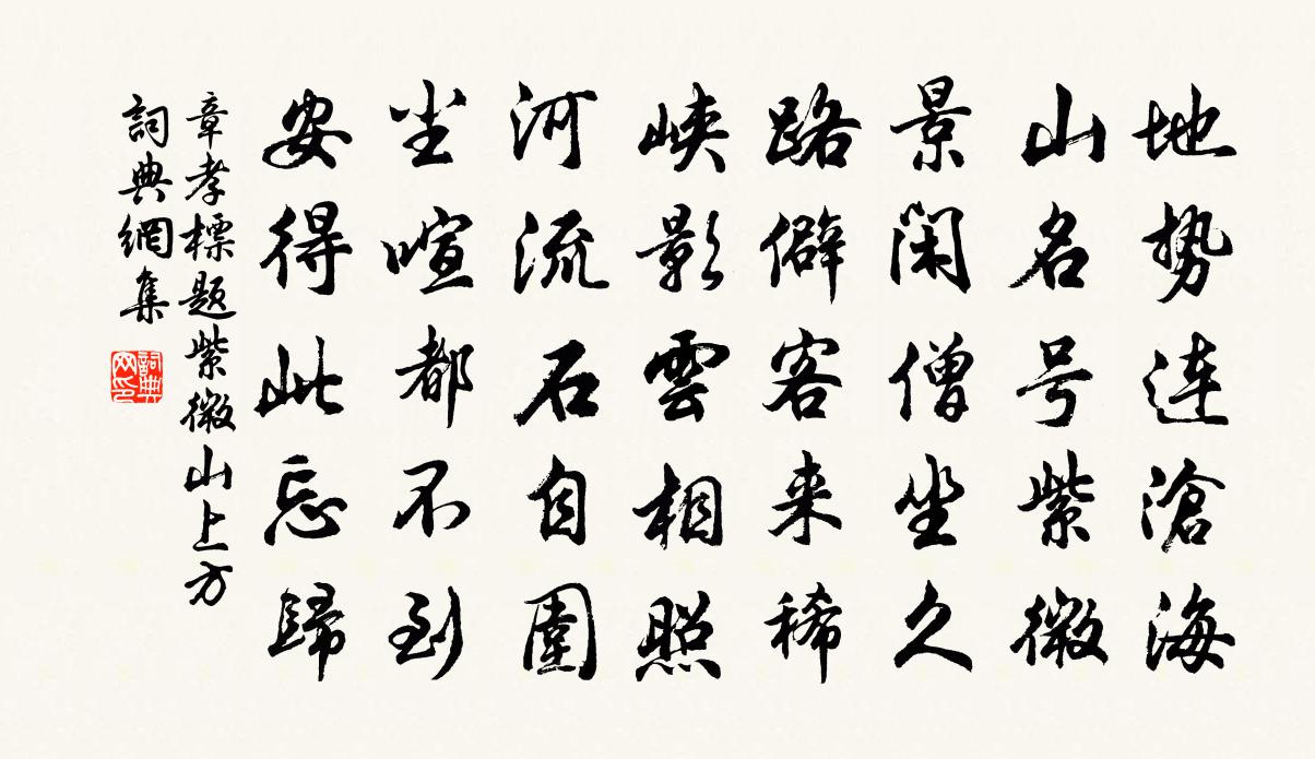 詩詞名句歷史字典書法欣賞書法字典國語詞典說文解字康熙字典古漢語字典標 題 作 者 詩 句 題紫微山上方作者:章孝標 朝代:唐代題紫微山上方原文地勢連滄海,山名號紫微。景閒僧坐久,路僻客來稀。峽影雲相照,河流石自圍。塵喧都不到,安得此忘歸。詩詞問答問:題紫微山上方的作者是誰?答:章孝標問:題紫微山上方寫於哪個朝代?答:唐代問:題紫微山上方是什麼體裁?答:五律章孝標題紫微山上方書法欣賞題紫微山上方書法作品注釋全唐詩:卷506-67詩詞推薦次韻游花洞陳師道〔宋代〕遠洞容徐步,繁英故壓枝。錦衾堆襞積,春事向離披。作意真成誤,尋芳似較遲。預為來歲約,及早共瑤卮。清夏堂張鎡〔宋代〕去歲臨池未蓋堂,暑天來看已多涼。穿花鷺立青為繖,放櫂人眠錦作床。今夏好風簾影動,良宵閒坐月華香。低頭丹陽舍舟登車渡江楊萬里〔宋代〕小泊樓船鐵瓮城,勿勿又作絕江行。看他蠟燭幾回剪,聽盡雞聲不肯明。水底霜寒還十倍,夜來月上恰三更。篙師白頭公魏野〔宋代〕有何辛苦有何愁,個個林間盡白頭。細葉累巢花影暖,微蟲共禽竹陰秋。清音豈許黃鶯伏,素羽曾教白鷺羞。唯爾漢江行次韓偓〔唐代〕村寺雖深已暗知,幡竿殘日迥依依。沙頭有廟青林合,驛步無人白鳥飛。牧笛自由隨草遠,漁歌得意扣舷歸。竹園西江月盧祖皋〔宋代〕燕掠晴絲裊裊,魚吹水葉粼粼。禁街微雨灑香塵。寒食清明相近。漫著宮羅試暖,閒呼社酒酬春。晚風簾幕悄無人清平樂毛滂〔宋代〕銀河秋浪。遙出崑崙上。忽變澄瀾添碧漲。可道昇平無象。黃雲濁霧初開。榮光休氣徘徊。試覓當時五老,金泥玉江城子(贈次膺叔家娉娉)晁補之〔宋代〕娉娉聞道似輕盈。好佳名。也堪稱。楚觀雲歸,重見小樊驚。豆蔻梢頭春尚淺,嬌未顧,已傾城。章台休詠舊青青宿鶴岩二絕鄭剛中〔宋代〕岩頭一望萬象低,已覺塵寰不整齊。此祗人間最高處,況游物外照群迷。君俞惠詩覓洛中所得大金菊輒次韻酬二篇韓維〔宋代〕繁英浮動滿菸葉,愛重不減雙南金。陶公此興亦不淺,聊贈翠茁酬高吟。呈嬾翁六首白玉蟾〔宋代〕倦子冷居姑射,居士高臥毗耶。鈍置詩盟酒約,只 * 香喫茶。四時田園雜興范成大〔宋代〕種園得果僅償勞,不奈兒童鳥雀搔。已插棘針樊筍徑,更鋪漁網蓋櫻挑。送陶十赴杭州攝掾劉長卿〔唐代〕莫嘆江城一掾卑,滄洲未是阻心期。浙中山色千萬狀,門外潮聲朝暮時。次韻邵僉判幽居於石〔宋代〕閉門久不出,摩挲鬢欲翁。有杯問明月,無扇障西風。神駿老嘶櫪,紙鳶高入空。天應憐我懶,瓜圃自泉通。石井詩一首林栗〔宋代〕石井靈蹤信不凡,一泓岩下碧深潭。誰磨皎潔青銅鏡,更琢玲瓏碧玉龕。濯去衣巾無限垢,漱來齒頰有餘甘。懸知春日王禹偁〔宋代〕門冷官閒似死灰,人言今日是春來。猶殘舊錫銀幡勝,且向山州當酒杯。春晴張耒〔宋代〕溪流清欲漲,山雪白仍鋪。耕隴晴羅雉,春渠暖日蔬。禽魚隨處樂,草木向陽舒。酒病年來甚,高眠懶著書。復用前韻答明略並呈魯直晁補之〔宋代〕廖君憤世談刺口,人言寧食蔥三斗。軒然齃鼻頤隱肩,日日醉市驅驢還。我初目病視彷佛,望君有異大人間。新豐次韻閻甥伯溫池上八首晁補之〔宋代〕物養有得失,瘠地江河隈。亭檻但小草,山林自奇材。我有八極興,聊堪一席開。長嘯本造適,悲風為誰來。小師淳縝請贊釋普度〔宋代〕工夫縝密,描畫不及。正令全提,佛也不識。十分惡毒得人憎,付與破家五逆。名句推薦飲酒莫辭醉,醉多適不愁。高適《淇上送韋司倉往滑台》 相尋夢裡路,飛雨落花中。晏幾道《臨江仙·鬥草階前初見》 秋來愁更深,黛拂雙蛾淺楊無咎《生查子·秋來愁更深》 貞女貴徇夫,捨生亦如此。孟郊《列女操 / 烈女操》 狡兔有三窟,僅得免其死耳。劉向《戰國策·齊四·齊人有馮諼者》 四海無閒田,農夫猶餓死。李紳《古風二首 / 憫農二首》 一心以為有鴻鵠將至,思援弓繳而射之,雖與之俱學,弗若之矣。孟子《孟子·告子章句上·第九節》 蟬噪林逾靜,鳥鳴山更幽。王籍《入若耶溪》 君看獲稻時,粒粒脂膏香。黃燮清《秋日田家雜詠》 梨花最晚又凋零,何事歸期無定準。歐陽修《玉樓春·去時梅萼初凝粉》