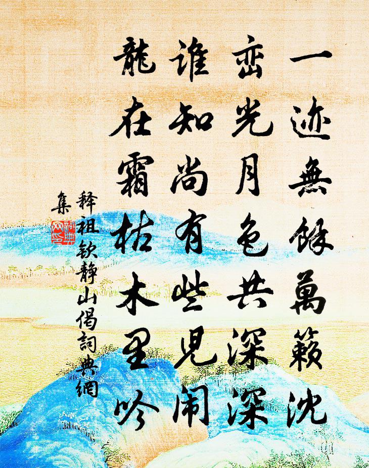 詩詞名句歷史字典書法欣賞書法字典國語詞典說文解字康熙字典古漢語字典標 題 作 者 詩 句 靜山偈作者:釋祖欽 朝代:宋代靜山偈原文一跡無餘萬籟沈,巒光月色共深深。誰知尚有些兒鬧,龍在霜枯木里吟。詩詞問答問:靜山偈的作者是誰?答:釋祖欽問:靜山偈寫於哪個朝代?答:宋代釋祖欽靜山偈書法欣賞靜山偈書法作品詩詞推薦雪中送炭與龔養正范成大〔宋代〕誰與幽人暖直身,筠籠沖雪送烏薪。煩君笑領婆歡喜,探借新年五日春。滿江紅(乙巳生日)方岳〔宋代〕說與花梅花,且花莫道、今花年無雪。花君不見、秋崖鬢底,莖莖騷屑。筆硯只催人老大,湖山不了詩愁絕。問笭別王山人劉得仁〔唐代〕旨甘雖自足,未是祿榮親。尚逐趨時伴,多離有道人。山居衣以草,生寄藥隨身。不食長無疾,年知出十旬。鵝兒黃似酒楊萬里〔宋代〕野水浮天碧,鵝兒弄日黃。傍人殊秀色,以酒更風光。破殼雙翎嫩,眠沙百草香。卻將金郁暢,試比菊衣裳。未慱再賦真覺僧房蘆三首呂祖謙〔宋代〕清曉霜鍾喚客興,餘聲知度幾稜層。煙霞深處無人到,時見憑欄一兩僧。和何議曹郊遊詩 二謝朓〔南北朝〕江皋倦遊客。薄暮懷歸者。揚舲浮大川。惆悵至日下。靃靡青莎被。潺湲石溜瀉。寄語持笙簧。舒憂願自假。歸途雪月交光劉一止〔宋代〕正五雲飛仗,縞練褰裳,亂空交舞。拂石歸來,向玉階微步。欲喚冰娥,暫憑風使,為掃氛驅霧,漸見停輪,人間和方時父劉克莊〔宋代〕曾陪朵殿燕天基,辜負先皇不世知。二客穿傍垂漢史,三良臨穴見秦詩。犬雞拔宅難飛舉,雀鼠貪生愧暮遲。回首宮詞一百首岳珂〔宋代〕鬼章夜縛下洮城,祝冊先朝永裕陵。二聖止戈元有指,未教狡穴盡秋鷹。立齋游山不能偕次遁澤韻二首王柏〔宋代〕色動山行約,令人憶舊遊。地形雖險易,坤道自剛柔。路繞岩頭石,煙橫洞口舟。十年塵土夢,此志幾時醻。小桃紅·碧湖湖上柳陰陰楊果〔元代〕碧湖湖上柳陰陰,人影澄波浸,常記年時歡花飲。到如今,西風吹斷迴文錦。羨他一對,鴛鴦飛去,殘夢蓼花深。漁父詞(靈雲)惠洪〔宋代〕急雨顛風花信早。枝枝葉葉春俱到。何待小桃方悟道。休迷倒。出門無限青青草。根不覆藏塵亦掃。見精明樹唯心賀新郎·老去相如倦劉過〔宋代〕老去相如倦。向文君說似,而今怎生消遣。衣袂京塵曾染處,空有香紅尚軟。料彼此、魂銷腸斷。一枕新涼眠客舍江行書事劉滄〔唐代〕遠渚蒹葭覆綠苔,姑蘇南望思裴徊。空江獨樹楚山背,暮雨一舟吳苑來。人度深秋風葉落,鳥飛殘照水煙開。寒潮墨梅釋善珍〔宋代〕水邊煙外見橫枝,畫裡尋思記舊詩。只道老來風味減,鐵心還自有愁時。五月初二日苦熟楊萬里〔宋代〕人言“長江無六月”,我言六月無長江。只今五月已如許,六月更來何可當!船倉周圍各五尺,且道此中底寬窄!夜懷成父弟趙蕃〔宋代〕晚蟬猶噪樹,新月遂當天。閔雨心雖切,題詩思亦牽。故應聽摵摵,殊愈對娟娟。憶我章泉弟,松窗竹屋邊。弟茝飲至醉醉歸蹶道中荊棘中陳著〔宋代〕聖俞小飲亦百杯,高叉兩手無欹頹。曼卿登樓終日飲,端坐人謂神仙來。二賢佳語三百載,磊磊亦有梅山在。有人偈頌七十六首釋子益〔宋代〕法身充塞太虛空,出沒何曾有定蹤。獨許波旬知此意,半 * 喜半搥胸。沉醉東風·漁夫白樸〔元代〕黃蘆岸白蘋渡口,綠柳堤紅蓼灘頭。雖無刎頸交,卻有忘機友,點秋江白鷺沙鷗。傲 * 間萬戶侯,不識字煙波釣名句推薦昨夜吳中雪,子猷佳興發。李白《答王十二寒夜獨酌有懷》 刑當罪則威,不當罪則侮荀子《荀子·君子》 野橋古梅獨臥寒屋角,疏影橫斜暗上書窗敲。明本《九字梅花詠》 是以動則必陷,為則必辱,是偏傷之患也。荀子《荀子·不苟》 長風萬里送秋雁,對此可以酣高樓。李白《宣州謝朓樓餞別校書叔雲 / 陪侍御叔華登樓歌》 師嚴然後道尊,道尊然後民知敬學。戴聖《禮記·學記》 工欲善其事,必先利其器。佚名《論語七則》 君行逾十年,孤妾常獨棲。曹植《明月上高樓》 無材可去補蒼天,枉入紅塵若許年。曹雪芹《紅樓夢·第一回》 魚網之設,鴻則罹其中;螳螂之貪,雀又乘其後。洪應明《菜根譚·概論》
