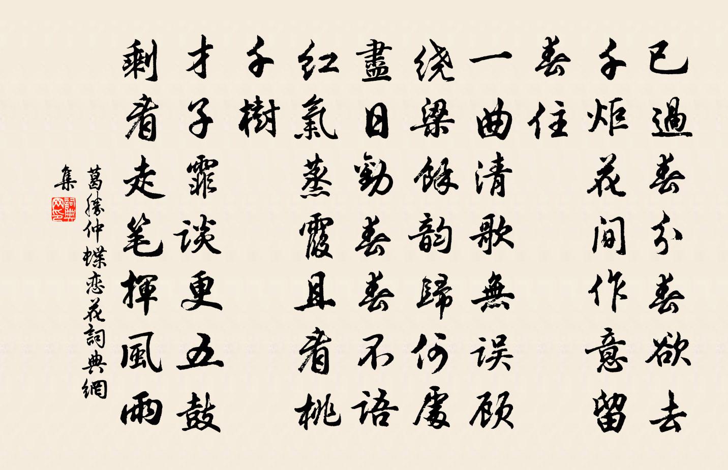 詩詞名句歷史字典書法欣賞書法字典國語詞典說文解字康熙字典古漢語字典標 題 作 者 詩 句 蝶戀花作者:葛勝仲 朝代:宋代蝶戀花原文已過春分春欲去。千炬花間,作意留春住。一曲清歌無誤顧。繞樑餘韻歸何處。盡日勸春春不語。紅氣蒸霞,且看桃千樹。才子霏談更五鼓。剩看走筆揮風雨。詩詞問答問:蝶戀花的作者是誰?答:葛勝仲問:蝶戀花寫於哪個朝代?答:宋代問:蝶戀花是什麼體裁?答:詞葛勝仲蝶戀花書法欣賞蝶戀花書法作品詩詞推薦歐陽拾遺讀書堂項安世〔宋代〕嗟余嗜前訓,蚤歲得胡模。中年困離宗,舊學日荒蕪。秋夜月姜特立〔宋代〕新月秀彎彎,高懸碧落間。何當依玉避,瀟灑看江山。郡宅中齋宋之問〔唐代〕郡宅枕層嶺,春湖繞芳甸。雲甍出萬家,臥覽皆已遍。漁商汗成雨,廨邑明若練。越俗鏡中行,夏祠雲表見。茲都聲聲慢(壽吳憲·四月十三)佚名〔宋代〕洞賓仙客,誕節明朝,方齊自號今日稱觴。為月金丹,希年近也康強。平生鐵石肺腑,肯依阿、貪戀朝行。芹溪上蘭亭會飲觀晉帖黃庚〔宋代〕祗說清談晉業虛,蘭亭之樂後來無。一時人物已陳跡,千古山林空畫圖。鍾帶夕陽來遠寺,碑和春風臥平蕪。昭陵吳煥章送行姜特立〔宋代〕素行躬韋布,長材轢縉紳。老成吾甚畏,競爽爾誰鄰。半刺人稱屈,全牛技未伸。難兄曾托契,薄宦偶同寅。和韻江行五絕鄭獬〔宋代〕快帆美滿送船去,忽值高沙船不行。只道今朝風色好,不知還有暗灘生。偈頌七十八首釋正覺〔宋代〕趙州四門長開,不礙諸方往來。十字街頭人大叫,平鋪買賣沒相猜。和答張衡仲孫應時〔宋代〕我方開竹徑,公肯屈籃輿。別去夢猶見,詩來錦不如。乾坤愁思里,風月醉眠餘。會卜溪橋畔,鄰牆小結廬。大滌洞留題裴良傑〔宋代〕杖屨乘閒歷眾山,俄驚凡跡到仙壇。清潨潄玉一川媚,瑞氣浮空兩洞寒。風入喬松琴弄操,煙籠遠岫灶燒丹。我今客中遇鄉友季芳遠歸省親真山民〔宋代〕河梁邂逅話襟期,獵獵西風透裌衣。酒臉未隨紅葉醉,鄉心先逐白雲飛。客中送客難為別,山上安山胡不歸。借使食梅趙汝騰〔宋代〕兒時摘青梅,葉底尋彈丸。所恨襟袖窄,不憚頰舌穿。我年不自覺,以我齒尚完。嘗新試一薦,喉棘眉先攢。豈味景定癸亥特旨以布衣陳隨隱除東宮掌書作賀之錢舜選〔宋代〕夜泛孤篷載月船,靜搜吟料六橋邊。詩成上達宸聰了,流落人間到處傳。孤鸞(早春)馬子嚴〔宋代〕沙堤香軟。正宿雨初收,落梅飄滿。可奈東風,暗逐馬蹄輕卷。湖波又遠漲綠,粉牆陰、日融煙暖。驀地刺桐枝上呈嬾翁六首白玉蟾〔宋代〕倦子冷居姑射,居士高臥毗耶。鈍置詩盟酒約,只 * 香喫茶。羅浮飛雲頂李昴英〔宋代〕山行頗覺思悠然,游遍仙家幾洞天。登見日亭風颳面,立飛雲頂月齊肩。稚川翁有燒丹灶,影泰師留卓錫泉。我得贈蜀府將溫庭筠〔唐代〕蠻入成都,頻著功勞。十年分散劍關秋,萬事皆隨錦水流。志氣已曾明漢節,功名猶自滯吳鉤。雕邊認箭寒雲重,劉寺置酒遇雨次韻答王大著項安世〔宋代〕勝絕今年第一壽,錢湖劉寺雨中游。湯傾衢點雲隨肘,羹汎戎酥雪滿甌。竹塢張煙闈客住,梅檐翻水勸人留。只因水龍吟 秋聲項鴻祚〔清代〕西風已是難聽,如何又著芭蕉雨?泠泠暗起,澌澌漸緊,蕭蕭忽住。候館疏碪,高城斷鼓,和成淒楚。想亭皋木落早朝姜特立〔宋代〕迷曉逆風飄漏遠,驚秋墮葉響廊深。五更又上籃輿去,忘卻當年調笑吟。名句推薦幾硯昔年游,於今成十秋。司馬光《送龔章判官之衛州·新及第》 欺君為大,加諸罪無可免;枉法不容,縱其為禍方懲。來俊臣《羅織經·謀劃卷第九》 滿堂唯有燭花紅,歌且從容,杯且從容。辛棄疾《一剪梅·中秋元月》 求得人間成小會,試把金尊傍菊叢。晏殊《破陣子·燕子欲歸時節》 榮非己莫恃,禍惟他勿縱。來俊臣《羅織經·瓜蔓卷第十二》 欲寄彩箋兼尺素,山長水闊知何處?晏殊《蝶戀花·檻菊愁煙蘭泣露》 淮水東邊舊時月,夜深還過女牆來。劉禹錫《金陵五題·石頭城》 風雨送人來,風雨留人住。游次公《卜運算元·風雨送人來》 九日明朝酒香,一年好景橙黃。張可久《滿庭芳·客中九日》 無限枝頭好顏色,可憐開不為重陽。丘浚《詠菊》