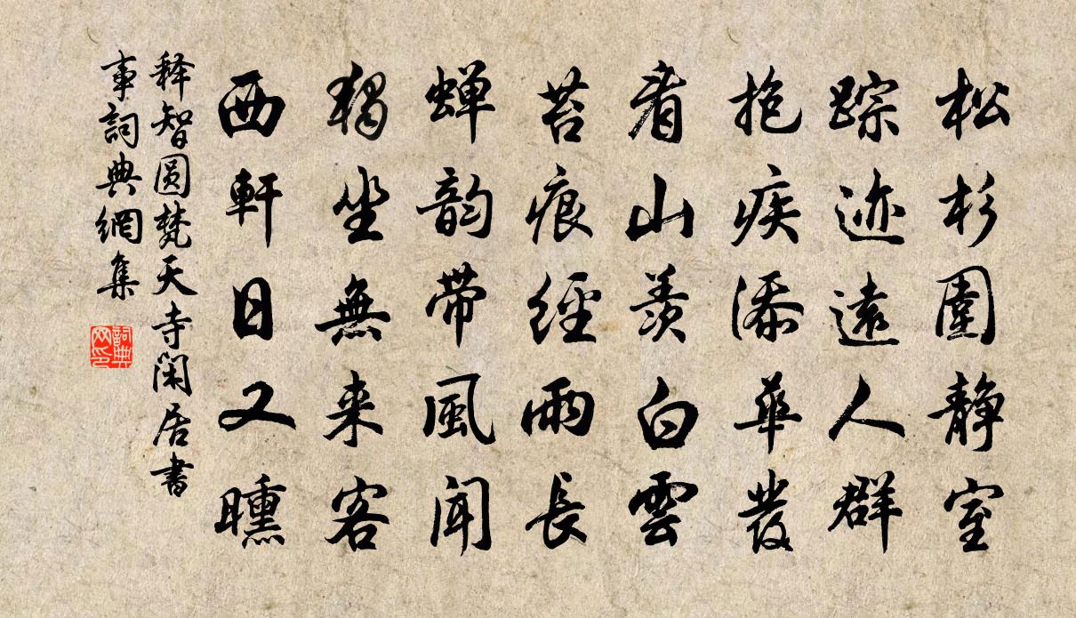 詩詞名句歷史字典書法欣賞書法字典國語詞典說文解字康熙字典古漢語字典標 題 作 者 詩 句 梵天寺閒居書事作者:釋智圓 朝代:宋代梵天寺閒居書事原文松杉圍靜室,蹤跡遠人群。抱疾添華發,看山羨白雲。苔痕經雨長。蟬韻帶風聞。獨坐無來客,西軒日又曛。詩詞問答問:梵天寺閒居書事的作者是誰?答:釋智圓問:梵天寺閒居書事寫於哪個朝代?答:宋代釋智圓梵天寺閒居書事書法欣賞梵天寺閒居書事書法作品詩詞推薦宮中行樂詞其六李白〔唐代〕今日明光里。還須結伴遊。春風開紫殿。天樂下朱樓。 * 全知巧。嬌歌半欲羞。更憐花月夜。宮女笑藏鉤。自贊釋德光〔宋代〕辭九重,歸東越。聽松風,對江月。冷笑老胡得一橛。送宋校書赴宣州幕李端〔唐代〕浮舟壓芳草,容裔逐江春。遠避看書吏,行當入幕賓。夜潮沖老樹,曉雨破輕蘋。鴛鷺多傷別,欒家德在人。宿青草湖(重湖,南青草,北洞庭)杜甫〔唐代〕洞庭猶在目,青草續為名。宿槳依農事,郵簽報水程。寒冰爭倚薄,雲月遞微明。湖雁雙雙起,人來故北征。送杜景齊歸平陽二首方回〔宋代〕君住平陽縣,無家不讀書。計偕今已廢,師授未應疏。兵革崩騰後,衣冠喪盪余。別懷似難寫,吾道竟何如。戲呈薛彝皎然〔唐代〕山僧不厭野,才子會須狂。何處銷君興,春風擺綠楊。冬窩夜語錢時〔宋代〕幽人只合臥林邱,不覺心幽境更綱。青汗有時昭帝則,黑甜餘暇伴賓游。黃花粲粲冬窩夜,丹葉蕭蕭蜀阜秋。會得書山中道士壁釋智圓〔宋代〕松下消搖自扣扉,相留終日話真機。煙藏花島青牛臥,客散仙房獨鶴歸。丹井泉澄天影小,玉壇風冷磬聲微。乘閒蘇州元日郡齋感懷,寄越州元相公、杭州白舍人李諒〔唐代〕稱慶還鄉郡吏歸,端憂明發儼朝衣。首開三百六旬日,新知四十九年非。當官補拙猶勤慮,遊宦量才已息機。舉族和陳和卿四絕姚勉〔宋代〕絕交久是孔方兄,賒得村醪小款迎。君豈真無食肉相,夜來蔬筍太僧清。送陳使君之同州徐鉉〔唐代〕太守驅征旆,翩翩西過關。冰容先臘至,膏雨逐春還。綠樹游沙苑,高樓看華山。從來京輔地,出入盡崇班。減字木蘭花歐陽修〔宋代〕歌檀斂袂。繚繞雕梁塵暗起。柔潤清圓。百琲明珠一線穿。櫻唇玉齒。天上仙音心下事。留往行雲。滿坐 * 酒半寄顧子敦曾鞏〔宋代〕清曠亭邊雁欲回,南湖分浪入城來。空山過臘猶藏雪,野岸先春已放梅。三徑未歸聊自適,一尊尋勝每同開。如今偈頌一百一十七首釋紹曇〔宋代〕太里阿瘞豐城劍,才遇張華例發光。積世冤讎都掃卻,蟄龍銀匣襲珍藏。女冠子(夏景)柳永〔宋代〕火雲初布。遲遲永日炎暑。濃陰高樹。黃鸝葉底,羽毛學整,方調嬌語。薰風時漸勸,峻閣池塘,芰荷爭吐。畫梁七峰亭獨坐喻良能〔宋代〕雨霽失炎燠,新亭境清淑。層波綠奫泫,疊嶂青陸續。風篁韻絲桐,煙柳開畫軸。澹然塵慮銷,庶足永曛旭。船子和尚贊釋慧遠〔宋代〕老手當年靠夾山,全機喪盡結深冤。父南子北家何在,撥轉天關地軸翻。梅答胡仲弓〔宋代〕多謝東君為主張,十分霜雪十分香。開時已辦和羹料,肯作風流時世裝。次韻衡州先生游花光因泛舟過向園示坐客之作趙蕃〔宋代〕使君有佳招,宿雨曉更驚。晨起候天色,對岸煙嵐生。使君匪遨遊,因行問農甿。農甿趨急務,歡然慰中情。天公陪山泉登芝山和文正公舊韻釋道璨〔宋代〕培塿視崔巍,眼高如許哉。舉頭天在上,四面景皆來。漸老成多病,看山又一回。盡供詩世界,霽色為君開。名句推薦只恐夜深花睡去,故燒高燭照紅妝。蘇軾《海棠》 夢裡不知身是客,一晌貪歡。李煜《浪淘沙令·簾外雨潺潺》 江山如此多嬌,引無數英雄競折腰 * 《沁園春·雪》 小住京華,早又是,中秋佳節。秋瑾《滿江紅·小住京華》 去年米貴闕軍食,今年米賤大傷農。杜甫《歲晏行》 以子之矛,陷子之盾韓非及後人《韓非子·難一》 相州晝錦堂廚醞,衛國淇川岸竹萌。姜特立《雅志小飲適寬仲送相州法醞並竹萌同至》 佳期悵何許,淚下如流霰謝朓《晚登三山還望京邑》 上馬擊狂胡,下馬草軍書。陸游《觀大散關圖有感》 心即理也。天下又有心外之事,心外之理乎王陽明《傳習錄·卷上·徐愛錄》