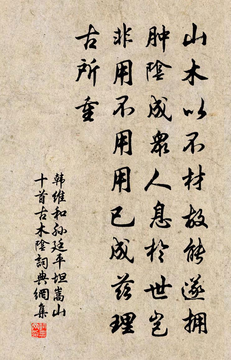 詩詞名句歷史字典書法欣賞書法字典國語詞典說文解字康熙字典古漢語字典標 題 作 者 詩 句 和孫廷平坦嵩山十首古木陰作者:韓維 朝代:宋代和孫廷平坦嵩山十首古木陰原文山木以不材,故能遂擁腫。陰成眾人息,於世豈非用。不用用已成,茲理古所重。詩詞問答問:和孫廷平坦嵩山十首古木陰的作者是誰?答:韓維問:和孫廷平坦嵩山十首古木陰寫於哪個朝代?答:宋代韓維和孫廷平坦嵩山十首古木陰書法欣賞和孫廷平坦嵩山十首古木陰書法作品詩詞推薦相和歌辭。銅雀台鄭愔〔唐代〕日斜漳浦望,風起鄴台寒。玉座平生晚,金尊妓吹闌。舞餘依帳泣,歌罷向陵看。蕭索松風暮,愁煙入井闌。頌證道歌證道歌釋印肅〔宋代〕證實相,無人法,不用尺刀並寸甲。魔軍盡總證菩提,大地須彌一芥納。句鄭澣〔唐代〕但慮彩色污,無虞臂胛肥。(段成式記,長安菩薩寺有畫維摩變,為俗講僧文淑裝之,筆跡盡矣,故興元鄭尚書題晚登橫溪閣陸游〔宋代〕樓鼓聲中日又斜,憑高愈覺在天涯。空桑客土生秋草,野渡虛舟集晚鴉。瘴霧不開連六詔,俚歌相答帶三巴。故鄉頌古二十七首釋雲賁〔宋代〕指點深紅與昔同,更無夭艷在芳叢。南泉笑里移春去,留得殘紅醉密蜂。南海送韋七使君赴象州任陳陶〔唐代〕一鶚韋公子,新恩頒郡符。島夷通荔浦,龍節過蒼梧。地理金城近,天涯玉樹孤。聖朝朱紱貴,從此展雄圖。壽五一弟四首廖行之〔宋代〕奉養烝嘗子職共,盍迎爾相重承宗。人生正始嚴昏娶,嬖御雖賢禮不容。夏室晃沖之〔宋代〕豐室不御暑,竹陰新未交。幽花時結子,晚燕續開巢。午夢還高枕,晨炊出近庖。此生吾自了,客至莫相嘲。南停對酒送春白居易〔唐代〕含桃實已落,紅薇花尚熏。冉冉三月盡,晚鶯城上聞。獨持一杯酒,南亭送殘春。半酣忽長歌,歌中何所云?雲我題枕帶雙流閣程公許〔宋代〕層樓架蒲牢,其下表奇觀。江連內流以,山列遠近案。烽火日平安,煙霞奉娛心。蔽芾南國棠,挺特九秋乾。和太原鄭中丞登龍興寺閣歐陽詹〔唐代〕青窗朱戶半天開,極目凝神望幾回。晉國頹墉生草樹,皇家瑞氣在樓台。千條水入黃河去,萬點山從紫塞來。獨恨書幸陸游〔宋代〕土盎常余菜,山庖不絕煙。罷醫翻少疾,無術自長年。小舴煙波宅,閒身陸地仙。東窗最佳處,日對坐忘編。過秀城哭葉俯倅衛宗武〔宋代〕久矣致生芻,斯行夫豈徒。不惟哀一老。亦欲識諸孤。魏笏期傳祖,韋經在業儒。女平仙去早,萬事付長吁。題劉君英石屏舒岳祥〔宋代〕天碑萬古閟嶙峋,自我來追此日新。旭日小村鳩喚婦,寒霜疏木雁來賓。路長橋斷誰家店,天遠舟行何處人。萬頃題傅岩叟悠然閣三章章八句陳文蔚〔宋代〕悠然閣這名,名從見中起。長喔好仁詩,高山勤仰止。意與口俱到,掘井真得不。嗟哉世間人,穿鑒求義理。句李邴〔宋代〕長廊風度磬,深院雨留香。禪人並化主寫真求贊釋正覺〔宋代〕形聲幻為,聞見智隨。自然出礙,平等何疑。瑩明而絕累,圓應而無疵。而今問你,且道是誰。孤雲王令〔宋代〕一片孤雲逐吃飛,東西終日竟何依。旁人莫道能為雨,惟恨青山未得歸。醉太平(送人入湘)王夢應〔宋代〕寒窗月晴。寒梢露明。一痕歸影燈青。又分攜短亭。蘅皋佩雲。蒸溪酒春。有誰勤說歸程。是峰頭雁聲。書懷二絕句晁說之〔宋代〕古木江亭懶不開,書空自笑興悠哉。蒼台一徑淺深遍,知道無人向此來。名句推薦天外鳳凰誰得髓?無人解合續弦膠。杜牧《讀韓杜集》 治亂之藥石,刑罰為重;興平之梁肉,德教為先。程登吉《幼學瓊林·卷四·訟獄》 往年同在鸞橋上,見倚朱闌詠柳綿。韓偓《寒食日重遊李氏園亭有懷》 命室攜童弱,良日登遠遊陶淵明《酬劉柴桑》 雪粉華,舞梨花,再不見煙村四五家。關漢卿《大德歌·冬景》 東風吹水日銜山,春來長是閒。李煜《阮郎歸·呈鄭王十二弟》 自古聖賢盡貧賤,何況我輩孤且直!鮑照《擬行路難·其六》 王師北定中原日,家祭無忘告乃翁。陸游《示兒》 獨立雕欄,誰憐枉度華年。王沂孫《高陽台·殘萼梅酸》 有過必悛,有不善必懼左丘明《國語·楚語·藍尹亹論吳將斃》