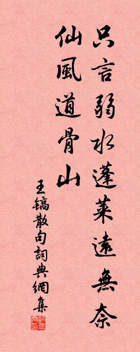 詩詞名句歷史字典書法欣賞書法字典國語詞典說文解字康熙字典古漢語字典標 題 作 者 詩 句 句作者:王鎬 朝代:宋代句原文只言弱水蓬萊遠,無奈仙風道骨山。詩詞問答問:句的作者是誰?答:王鎬問:句寫於哪個朝代?答:宋代王鎬句書法欣賞句書法作品詩詞推薦正月九日微雪二首趙蕃〔宋代〕霰雪纖纖晚倍寒,梅花清瘦不 * 。小園準擬尋詩去,少待侵苔屐齒乾。單同年求德興俞氏聚遠樓詩三首蘇軾〔宋代〕聞說樓居似地仙,不知門外有塵寰。幽人隱几寂無語,心在飛鴻滅沒間。發岐亭宿故鎮三首張耒〔宋代〕征人不敢安,蓐食待明發。潤沖石上雲,冷踏松間月。艱難付一笑,歲月驚屢閱。偃亞道傍松,茯苓應可掘。送炅法師葬詩庾信〔南北朝〕龍泉今日掩。石洞實時封。玉匣摧談柄。懸河落辯鋒。香爐猶是柏。麈尾更成松。郭門未十里。山回已數重。尚聞過東灘入馬肝峽陸游〔宋代〕書生就食等奔逃,道路崎嶇信所遭。船上急灘如退鷁,人緣絕壁似飛猱。口夸遠嶺青千疊,心憶平波綠一篙。猶勝苦雨王安石〔宋代〕靈場奔走尚無功,去馬來車道不通。風助亂雲陰更密,水爭高岸氣尤雄。平時溝洫今多廢,下戶京囷久已空。肉食五馬山李從訓〔宋代〕北山從何來,崑岷而鼻祖。並包河與江,考歷不能譜。近推連括蒼,繼乃至天姥。既而南入台,盤桓遂東下。嵯峨山中遣興五首李流謙〔宋代〕嗣聖承堯禹,圖書未見之。兵威輕破竹,天意決占龜。燕雀甘藜莠,蛟龍或沼池。但令無戰伐,貧賤亦何辭。寄贈王十將軍承俊杜甫〔唐代〕將軍膽氣雄,臂懸兩角弓。纏結青驄馬,出入錦城中。時危未授鉞,勢屈難為功。賓客滿堂上,何人高義同。晨炊皂徑楊萬里〔宋代〕問路無多子,驅車半日間。行穿崖石古,蹈破蘚花斑。綠語鶯邊柳,青眼水底山。人家豈無地,爭住小溪灣?遷陽亭詩江淹〔南北朝〕擥淚訪亭候。茲地乃閩城。萬古通漢使。千載連吳兵。瑤磵敻嶄崒。銅山郁縱橫。方水埋金雘。圓岸伏丹瓊。下視五溪陶弼〔宋代〕六月五溪邊,溪深氣象偏。晝陰疑雨後,久冷覺秋先。棧倚臨崖石,竿通隔領泉。片帆雲里現,知是貢賨船。蠟梅武衍〔宋代〕賦得姿容類至中,哨枝宿葉又春風。品題雖入江梅譜,可惜名同韻不同。仙掌峰劉邊〔宋代〕銅盤捧露幾何年,渭水秋風淚泫然。已向山中閒袖手,為誰半壁更擎天。答陳述古二首蘇軾〔宋代〕漫說山東第二州,棗林桑泊負春遊。城西亦有紅千葉,人老簪花卻自羞。小桃破萼未勝春,羅綺叢中第一人。聞道游玉仙觀以春風吹倒人為韻得吹字陳與義〔宋代〕清游天不借,破帽沙疾吹。下馬榱桷鳴,未恨十里陂。風余檐鐸語,坐定爐煙遲。新春碧瓦麗,古意喬木奇。黃冠桂江中題香頂台劉言史〔唐代〕岧岧香積凌空翠,天上名花落幽地。老僧相對竟無言,山鳥卻呼諸佛字。心月照雲溪 贈趙德備王丹桂〔元代〕但凡入道,屏棄繁華早。柔弱守清貧,把靈台、時時拂掃。塵心起處,宜向死前觀,憑乞化,做生涯,餘事絕論討伯父《送先人下第歸蜀》詩云︰人稀野店休安蘇軾〔宋代〕我坐名過實,讙嘩自招損。汝幸無人知,莫厭家山穩。夜起來(一作起夜來)施肩吾〔唐代〕香銷連理帶,塵覆合歡杯。懶臥相思枕,愁吟起夜來。名句推薦簫鼓追隨春社近,衣冠簡樸古風存。陸游《游山西村》 禁里疏鍾官舍晚,省中啼鳥吏人稀。王維《酬郭給事 / 贈郭給事》 空獨倚東風,芳思誰寄。周密《繡鸞鳳花犯·賦水仙》 夫為將者,必有腹心、耳目、爪牙。諸葛亮《將苑·卷一·腹心》 斬草除根,萌芽不發馮夢龍《警世通言·卷三十七》 情同而親合,親合而事生之。姜子牙《六韜·文韜·文師》 白頭太守真愚甚,滿插茱萸望辟邪。宋祁《九日置酒》 玉容寂寞淚闌乾,梨花一枝春帶雨。白居易《長恨歌》 譽人不增其美。王充《論衡·卷八·藝增篇》 三湘愁鬢逢秋色,萬里歸心對月明。盧綸《晚次鄂州》