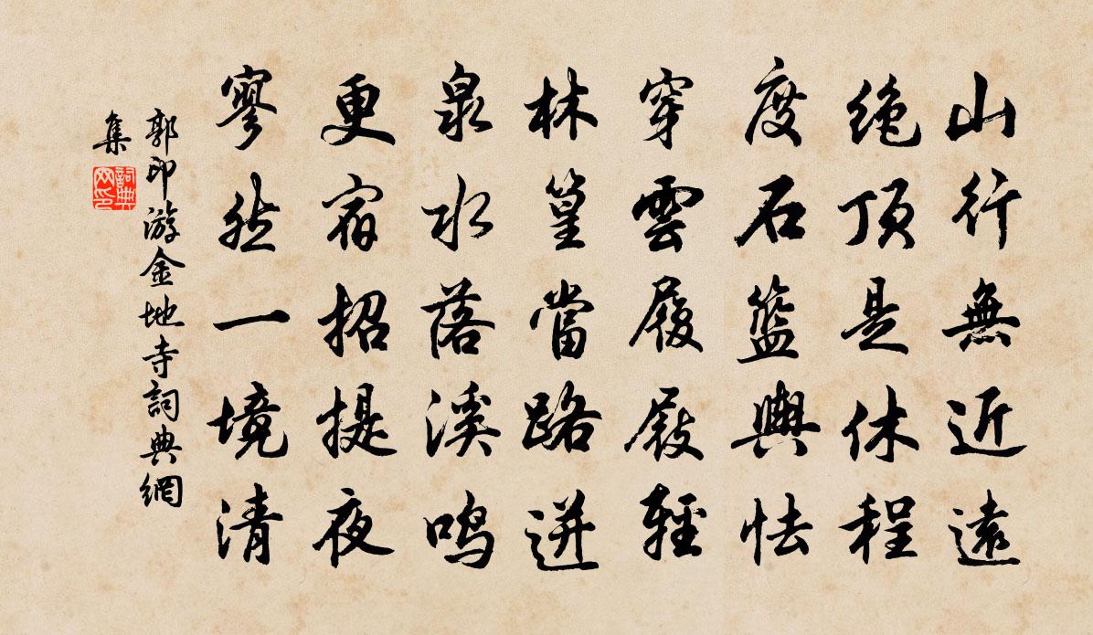 詩詞名句歷史字典書法欣賞書法字典國語詞典說文解字康熙字典古漢語字典標 題 作 者 詩 句 游金地寺作者:郭印 朝代:宋代游金地寺原文山行無近遠,絕頂是休程。度石籃輿怯,穿雲履屐輕。林篁當路迸,泉水落溪鳴。更宿招提夜,寥然一境清。詩詞問答問:游金地寺的作者是誰?答:郭印問:游金地寺寫於哪個朝代?答:宋代郭印游金地寺書法欣賞游金地寺書法作品詩詞推薦農桑陸游〔宋代〕蠶如黑螘稻青鍼,夫婦耕桑各苦心。但得老親供養足,不羞布袂與蒿簪。觀魚台汪元量〔宋代〕高台留古蹟,不見隱公游。白日悲風起,清河逆水流。潛魚投別浦,狡兔據荒丘。應笑臧僖伯,何如諫得休。晚步於石〔宋代〕徑狹不容車,溪淺不容釣。平蕪淡雲煙,獨鳥下殘照。見山孑無言,倚樹忽長嘯。徘徊澹忘歸,空林明遠燒。漫題方岳〔宋代〕投老自山林,灰寒寸寸心。鶴眠漁屋小,僧語雪籬深。夜讀貧如昨,春犁懶到今。松根有蒼石,抱膝一長吟。紙被歌訓行童釋印肅〔宋代〕皂袖寒袍入體儀,霞光閃爍繞身飛。或行或坐頻頻看,或臥或眠每每披。幾度入山游勝境,數回海上覓龍騎。假饒再經太平觀訪沈道士不遇二首陳舜俞〔宋代〕不見芝岩駕鶴翁,抱琴歸去悄無蹤。黃花似有東籬舊,山後山前取次逢。和許守喜雨韻吳芾〔宋代〕千里焦枯頓郁蒼,邦人寧復慮年荒。大田一雨渾沾足,鄰壤群偷更伏藏。治郡羨君端有術,救民愧我獨無方。夜來游山上一道觀三佛寺周敦頤〔宋代〕琳宮金剎接林巒,一徑潛通竹樹寒。是處塵埃皆可息,時清終未忍辭官。醉花陰張元乾〔宋代〕翠箔陰陰籠畫閣。昨夜東風惡。芳徑滿香泥,南陌東郊,惆悵妨行樂。傷春比似年時惡。潘鬢新來薄。何處不禁愁答蘇州韋應物郎中皎然〔唐代〕詩教殆淪缺,庸音互相傾。忽觀風騷韻,會我夙昔情。蕩漾學海資,郁為詩人英。格將寒松高,氣與秋江清。何必依韻和發運許主客詠影梅堯臣〔宋代〕答影陶潛興,長吟為我聽。與之相遇日,曾不異於形。動靜隨生趣,存藏委曜靈。莊周疾走意,推本置諸銘。夜行船許棐〔宋代〕一轡東風留不住。離歌斷、日斜春暮。多事啼鶯,妒情飛燕,一路送人歸去。文君自被琴心誤。卻惆悵、落花飛絮雪三首林逋〔宋代〕皓然窗戶曉來新,畫軸碑廳絕點塵。洛下高眠應有道,山陰清興更無人。寒連水石鳴漁墅,猛共松篁壓寺鄰。酒渴宮詞胡仲弓〔宋代〕垂楊枝上喜遷鶯,梅子黃時雨乍晴。幾陣薰風穿玉殿,直珠簾內有歡聲。和台州衛倅曹勛〔宋代〕昔日連牆事可嘉,固應屢見雪中花。稍收帢幘山房景,欲學孤山處士家。把酒要陪高士醉,臨風未覺此心遐。銷閒和鄭邦達主簿五絕黃公度〔宋代〕邂逅天涯一破顏,緇塵染素客途艱。休將俗眼輕遊子,無數珠璣咳唾間。贈晦叔憶夢得白居易〔唐代〕自別崔公四五秋,因何臨老轉風流?歸來不說秦中事,歇定唯謀洛下游。酒面浮花應是喜,歌眉斂黛不關愁。得君岐陽三首元好問〔金代〕突騎連營鳥不飛,北風浩浩發陰機。三秦形勝無今古,千里傳聞果是非;偃蹇鯨鯢人海涸,分明蛇犬鐵山圍。窮途入村方岳〔宋代〕宿雨初晴曉日晶,彌川滿谷白雲平。燦銀堆裹素螺髻,畫出江潮萬里橫。黃牛峽范成大〔宋代〕朝離封悲秋宅,封午榜疊石封磯。小留封黃牛廟,細讀石馬詩。黃牛隱見蒼山里,石馬至今猶馘耳。當年夢境識仙名句推薦慘慘時節盡,蘭葉復凋零。徐幹《室思》 一別都門三改火,天涯踏盡紅塵。蘇軾《臨江仙·送錢穆父》 黃河九天上,人鬼瞰重關。元好問《水調歌頭·賦三門津》 粽包分兩髻,艾束著危冠。陸游《乙卯重五詩》 年少辭家從冠軍,金鞍寶劍去邀勛。王涯《塞下曲二首·其二》 秋色冷並刀,一派酸風卷怒濤。陳維崧《南鄉子·邢州道上作》 漠漠黃雲,濕透木棉裘。蔣捷《梅花引·荊溪阻雪》 花開不並百花叢,獨立疏籬趣未窮。鄭思肖《畫菊》 獨善其身盡日安,何須千古名不朽!羅貫中《三國演義·第三十七回》 遙想獨游佳味少,無方騅馬但鳴嘶。蘇轍《懷澠池寄子瞻兄》