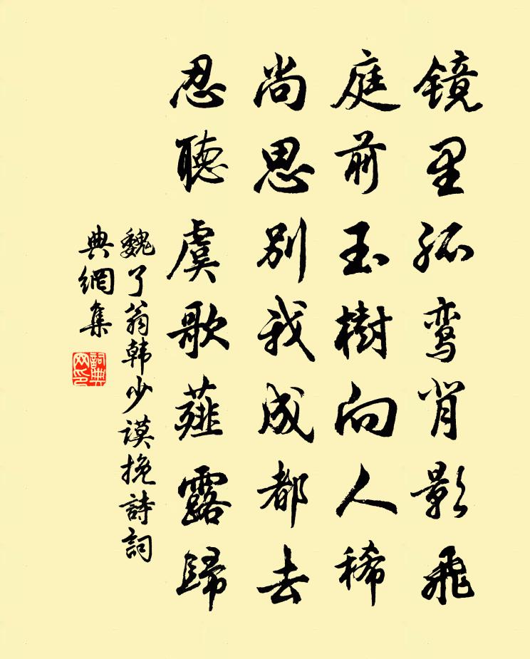 詩詞名句歷史字典書法欣賞書法字典國語詞典說文解字康熙字典古漢語字典標 題 作 者 詩 句 韓少謨輓詩作者:魏了翁 朝代:宋代韓少謨輓詩原文鏡里孤鸞背影飛,庭前玉樹向人稀。尚思別我成都去,忍聽虞歌薤露歸。詩詞問答問:韓少謨輓詩的作者是誰?答:魏了翁問:韓少謨輓詩寫於哪個朝代?答:宋代魏了翁韓少謨輓詩書法欣賞韓少謨輓詩書法作品詩詞推薦毗陵太平院壁間畫山水熟視之有飛動勢殆仙筆林景清〔宋代〕山風不動雲四寂,萬頃波濤生素壁。三峽夜怒搖星河,九溟晝沸卷霹靂。誰將江海一筆吞,華陽入硯玄波翻。靈鰲江岸茅舍傍古梅奇甚攜酒即之袁說友〔宋代〕不為村深與水隈,也依籬落有時開。幾年寂寞無人問,一日聲名動客杯。句胡山甫〔宋代〕病起百花開。聞吳端朝作真率集韓元吉〔宋代〕他年曾作社中人,骯髒歸來白髮新。闊別常思共杯酌,舊交那得更比鄰。黃雞白酒可勞勸,青筍烏椑未絕貧。恨不和遲田舍雜詩九首蘇轍〔宋代〕平湖近西垣,杖屨可以游。偶從大夫後,不往三經秋。盎中插蒲蓮,菱芡亦易求。閉門具樽俎,父子相獻酬。舟次赤壁羅與之〔宋代〕呈王峴畔泛川流,赤壁磯頭半日游。勝地空餘豪傑跡,扁舟不載古今愁。極知風景終無異,莫念天時逝不留。傷事自永康還連日又告旱懇祈勤恪初四五日再得甘程公許〔宋代〕井花湔手寶香焚,一念何曾隔紫清。半夜瓦溝飛急響,化工元不吝生成。贈朱質宋寧宗〔宋代〕袖手長才世路輕,愛閒那有鬻榮名。掛冠便欲辭丹闕,策杖還歸老故城。適喜不求三仕喜,傳家惟有十分清。林間三月晦日偶成蔣恢〔宋代〕一年芳信雨消磨,負此吟懷奈若何。倚檻忽驚新綠暗,掃軒更惜落紅多。春歸惟有時禽覺,睡足從渠日影蹉。閒里答廣宣供奉問蘭陵居李益〔唐代〕居北有朝路,居南無住人。勞師問家第,山色是南鄰。碧鮮亭春題竹薛能〔唐代〕竹少竹更重,碧鮮疆更名。有欄常憑立,無徑獨穿行。夕月陰何亂,春風葉盡輕。已聞圖畫客,兼寫薛先生。將赴天平職書懷寄翰林從兄曹鄴〔唐代〕居處絕人事,門前雀羅施。誰遣辟書至,仆隸皆展眉。匹馬渡河洛,西風飄路歧。手執王粲筆,閒吟向旌旗。香晚逍遙詠宋太宗〔宋代〕法則定乾坤,千秋與萬春。金烏飛絳闕,玉兔弄精神。達識逢堪笑,賢愚本是真。清風搖聖境,仙說洞中人。中呂·普天樂·酒色財氣滕賓〔元代〕酒謫仙強,劉伶繆。笑豪來鯨吸,有甚風流?聊復爾,無何有。醞釀潮紅春風透,興來時付與觥籌。頻頻到口,輕晚步陳深〔宋代〕偶偕二三子,處屐古城陰。遠慕求羊跡,永懷江海心。殘陽隱深巷,積雨歇高林。自笑黃荂曲,那追白雪吟。題朱賞門紹興卜者〔宋代〕澗水涓涓繞洞崖,洞邊時有小桃開。四邊環合疑無路,為問東風何處來。西溪子毛文錫〔唐代〕昨夜西溪游賞,芳樹奇花千樣。鎖春光,金尊滿,聽弦管。嬌妓舞衫香暖。不覺到斜暉,馬馱歸。初秋喜雨陳宓〔宋代〕稚金無力拒炎光,挾雨呼風作晚涼。玉漏城頭傳一箭,征人已覺十分長。和傅岩叟梅花二首辛棄疾〔宋代〕靈均恨不與同時,欲把幽香贈一枝。堪入離騷文字不,當年何事未相知。立春日雷方岳〔宋代〕出地奔霆便發聲,寒花衰草亦欣榮。天公只要新群聽,不等春來蟄已驚。名句推薦欲買桂花同載酒,終不似,少年游。劉過《唐多令·蘆葉滿汀洲》 醉臥沙場君莫笑,古來征戰幾人回?王翰《涼州詞二首·其一》 迸籜分苦節,輕筠抱虛心。柳宗元《巽公院五詠·苦竹橋》 我有所念人,隔在遠遠鄉。白居易《夜雨》 頌其詩,讀其書,不知其人,可乎?是以論其世也。孟子《孟子·萬章章句下·第八節》 恐是仙家好別離,故教迢遞作佳期。李商隱《辛未七夕》 江山留勝跡,我輩復登臨。孟浩然《與諸子登峴山》 白雲一片去悠悠,青楓浦上不勝愁。張若虛《春江花月夜》 晴煙漠漠柳毿毿,不那離情酒半酣。韋莊《古離別》 失道而後德,失德而後仁,失仁而後義,失義而後禮。老子《老子·德經·第三十八章》