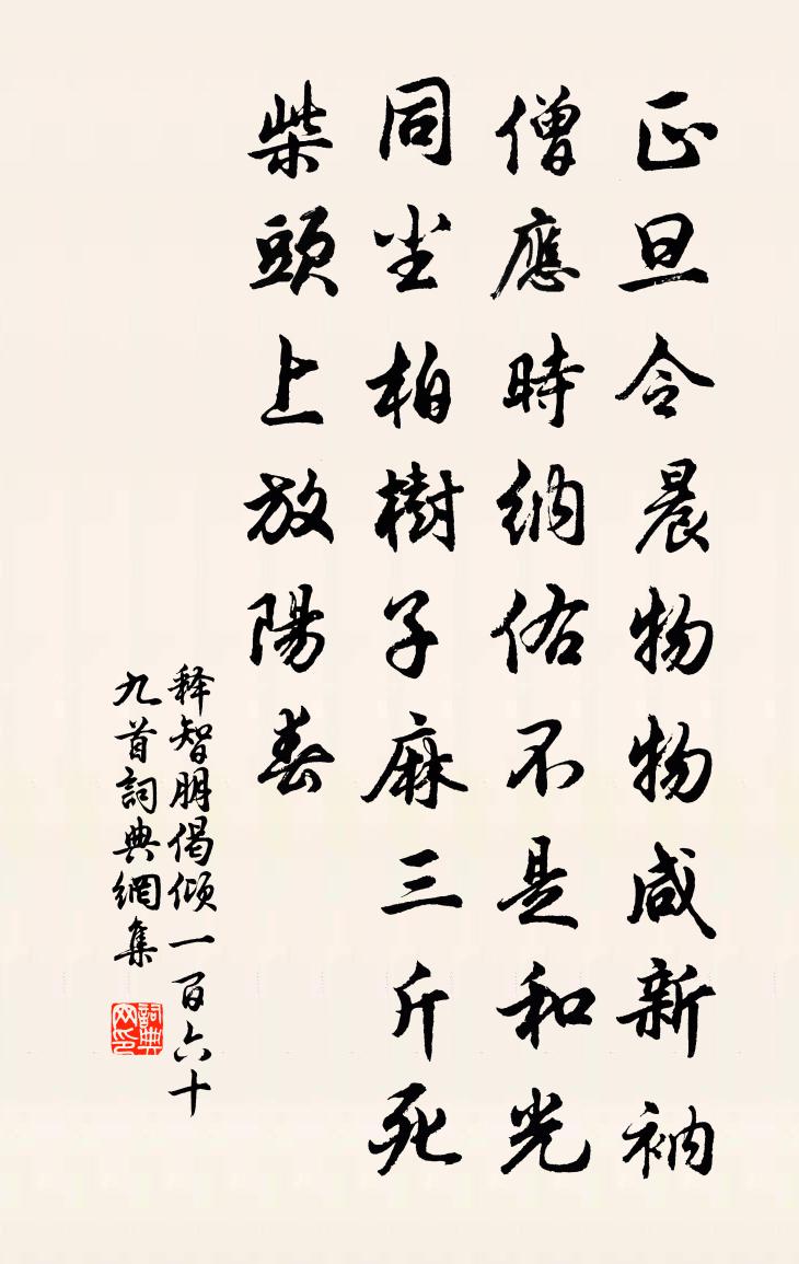 詩詞名句歷史字典書法欣賞書法字典國語詞典說文解字康熙字典古漢語字典標 題 作 者 詩 句 偈傾一百六十九首作者:釋智朋 朝代:宋代偈傾一百六十九首原文正旦令晨,物物鹹新。衲僧應時納佑,不是和光同塵。柏樹子,麻三斤,死柴頭上放陽春。詩詞問答問:偈傾一百六十九首的作者是誰?答:釋智朋問:偈傾一百六十九首寫於哪個朝代?答:宋代釋智朋偈傾一百六十九首書法欣賞偈傾一百六十九首書法作品詩詞推薦題金碧山水卷錢選〔宋代〕煙雲出沒有無間,半在空虛半在山。我亦閒中消日月,幽林深處聽潺湲。明堂慶成五首任希夷〔宋代〕國重明禋預戒期,九筵宏敞肅宗祈。階前萬旅皆花帽,庭下千官盡絳衣。三日齋心嚴殿宿,一聲清蹕響簾幃。聖躬瀫波亭徐慥〔宋代〕古縣幽亭勝景多,青春啼鳥每相過。林間石磬風敲竹,水面金蛇日漾波。得友且須頻載酒,愛山何必更捫蘿。我來依許待制送行詩韻詠燕以寄梅堯臣〔宋代〕江燕銜泥日,深堂拂玉琴。不教關合戶,乃見主人心。掠水飛殊捷,迎風去已禁。短書猶可記,聊影托微吟。發篋得故人書有感陸游〔宋代〕衰鬢星星換舊青,世間萬事但堪驚。晨炊欲熟客未覺,夜漏漸殘人尚行。花發且為無事飲,詩成非復不平鳴。京華題陳正字山居李鹹用〔唐代〕怪來忘祿位,習學近瀟湘。見處雲山好,吟中歲月長。花光籠晚雨,樹影浸寒塘。幾日憑欄望,歸心自不忙。寄歐陽舍人書曾鞏〔宋代〕鞏頓首再拜,舍人先生: 去秋人還,蒙賜書及所撰先大父墓碑銘。反覆觀誦,感與慚並。夫銘志之著於世,義留題巾山明慶塔院錢昱〔宋代〕數級崔嵬萬木中,最堪影勢似難同。欄桿夜壓江心月,鈴鐸秋搖岳頂風。重疊畫瞻遮世界,稀疏清磬徹虛空。有時雨中陪子瞻同顏復長官送梁燾學士舟行歸汶上蘇轍〔宋代〕客從南方來,信宿北方去。手棹木蘭舟,不顧長江雨。江昏氣陰黑,雨落無朝暮。肅肅赴波濤,蒙蒙暗洲渚。微涼泛渦水二首宋祁〔宋代〕漠漠新茸上渚蒲,日痕波態共涵虛。無人解作江南曲,荷底田田自戲魚。吾身釋文珦〔宋代〕趨時非好步,步步青山歸。眼界絕塵垢,耳根遺是非。充腸草木實,被體雲霞衣。吾貧豈當念,吾原已無違。文英閣二首秦觀〔宋代〕都門將酒惜分攜,歸路駸駸望欲迷。千里又看新燕語,一聲初聽子規啼。春風天上曾揮翰,遲日江邊獨杖藜。回首和趙茂州即事六首郭印〔宋代〕千岩萬壑最幽深,玉壘西邊古茂林。仕宦不妨真大隱,風流無伴只孤斟。多情竹色朝侵幾,適意松聲夜入琴。莫道別綦毋潛王維〔唐代〕端笏明光宮,歷稔朝雲陛。詔刊延閣書,高議平津邸。適意偶輕人,虛心削繁禮。盛得江左風,彌工建安體。高張新晴偶出林景熙〔宋代〕琴床茶鼎澹相依,偶為尋僧出筆扉。風動松枝山鵲語,雪消菜甲野蟲飛。看花春入桄榔杖,聽瀑寒生薜荔衣,古寺奉和中書常舍人晚秋集賢院即事寄徐薛二侍御錢起〔唐代〕文星垂太虛,辭伯綜群書。彩筆下鴛掖,褒衣來石渠。典墳探奧旨,造化睹權輿。述聖魯宣父,通經漢仲舒。窗明贈相士陳道人曾豐〔宋代〕道人滿藏是光明,況問 * 乞得靈。眸子外無餘造化,士人中有幾公卿。愛名者十忌者百,逢人言失物言得。試指揖讓圖釋智愚〔宋代〕行必有師,進之以禮。昭昭君子心,對面風波起。西莊夜歸張鎡〔宋代〕草聲真似過田間,唧唧蟲催興未闌。珍重小輿能從我,夜深穿遍竹陰寒。送嚴員外(一作劉長卿詩)李嘉祐〔唐代〕春風倚棹闔閭城,水國春寒陰復晴。細雨濕衣看不見,閒花落地聽無聲。日斜江上孤帆影,草綠湖南萬里情。君去名句推薦和氏之璧,不飾以五采;隋侯之珠,不飾以銀黃。其質至美,物不足以飾之。韓非及後人《韓非子·解老》 劍河風急雪片闊,沙口石凍馬蹄脫。岑參《輪台歌奉送封大夫出師西征》 尊前只恐傷郎意,閣淚汪汪不敢垂。夏竦《鷓鴣天·鎮日無心掃黛眉》 思欲委符節,引竿自刺船。元結《賊退示官吏》 道之以政,齊之以刑,民免而無恥。孔子弟子《論語·為政篇》 守經事而不知其宜,遭變事而不知其權。司馬遷《史記·太史公自序》 孤之有孔明,猶魚之有水也。陳壽《隆中對》 客路相逢難,為樂常不足。蘇軾《送頓起》 酒闌更喜團茶苦,夢斷偏宜瑞腦香。李清照《鷓鴣天·寒日蕭蕭上瑣窗》 誠者,不勉而中不思而得:從容中道,聖人也。子思《中庸·第二十章》