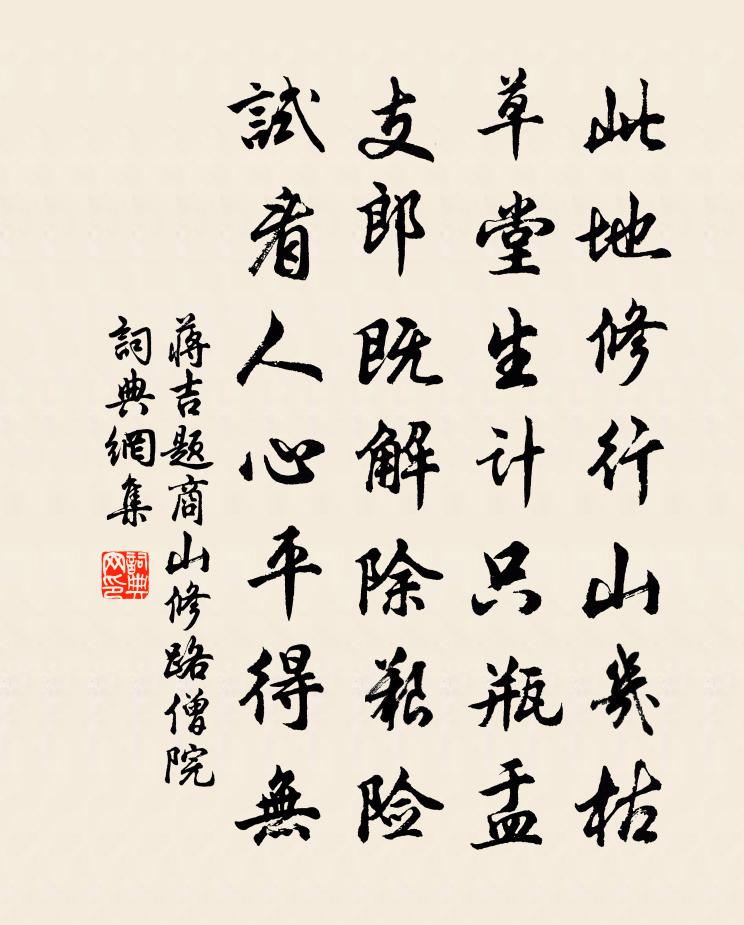 詩詞名句歷史字典書法欣賞書法字典國語詞典說文解字康熙字典古漢語字典標 題 作 者 詩 句 題商山修路僧院作者:蔣吉 朝代:唐代題商山修路僧院原文此地修行山幾枯,草堂生計只瓶盂。支郎既解除艱險,試看人心平得無。詩詞問答問:題商山修路僧院的作者是誰?答:蔣吉問:題商山修路僧院寫於哪個朝代?答:唐代問:題商山修路僧院是什麼體裁?答:七絕蔣吉題商山修路僧院書法欣賞題商山修路僧院書法作品注釋全唐詩:卷771-17詩詞推薦青玉案·一年春事都來幾歐陽修〔宋代〕一年春事都來幾,早過了、三之二。綠暗紅嫣渾可事。綠楊庭院,暖風簾幕,有個人憔悴。買花載酒長安市,又爭發粟至石陂寺王安石〔宋代〕驀水穿山近更賒,三更燃火飯僧家。乘田有秩難逃責,從事雖勤敢嘆嗟。贈相士郭灝魏了翁〔宋代〕載小奚奴長自隨,兩牛腰大贈行詩。逢人有問輒如見,及我相遭不肯奇。每會面時長好好,合開口處或期期。道人道士步虛詞 七庾信〔南北朝〕道生乃太乙。守靜即玄根。中和煉九氣。甲子謝三元。居心受善水。教學重香園。鳧留報關吏。鶴去畫城門。更以題順感院趙企〔宋代〕一上危梯一解顏,重崗復嶺四周環。山川盡出登臨外,天地都歸俯爺間。飛鳥直隨雙目斷,游雲長與片心閒。文書飛來峰猿顧逢〔宋代〕天竺如巴峽,畫圖無此奇。掛藤伸黑臂,剝果餒黃兒。孤影池中夜,三聲月一時。倚闌僧不去,應是苦於詩。漁浦戴栩〔宋代〕久慚竅食侶鵷鴻,尚以詩名玷至公。喜對親慈說田裡,了無事鄙到船蓬。漲流暫急潮差候,陰靄俄銷月在空。夢讀題館中直舍壁陸游〔宋代〕幾年憔悴去清班,敢辱君恩誤賜環。但厭軟麈隨倦馬,不愁弱水隔神山。下帷寢飯群書里,退食雍容眾雋間。行矣雁湖史公亮〔宋代〕梅艷凌霜帶雪余,露華洗盡玉生膚。東方千騎催人去,聊折春風寄雁湖。次韻范淳父送秦少章蘇軾〔宋代〕宿緣在江海,世網如予何。西來庾公塵,已濯長淮波。十年淮海人,初見一麥禾。但欣爭訟少,未覺舟車多。秦郎頌古三十一首釋安永〔宋代〕乞兒拾得錫,暗地空寶惜。撞著明眼人,一文也不直。採桑子謝逸〔宋代〕楚山削玉雲中碧,影落沙汀。秋水澄凝。一抹江天雁字橫。金錢滿地西風急,紅蓼煙輕。簾外砧聲。驚起青樓夢不庚子叨贄合州甘守陽枋〔宋代〕欲陳禮樂字三千,起趁東風萬里船。戎馬不禁文未喪,石魚間出瑞開先。人知制梃枘堅甲,政比黃鐘緩急弦。願借鶴林寺釋雲岫〔宋代〕夾山當日見船子,法眼無瑕亦有瑕。一棹失涇風浪急,和根移卻杜鵑花。秦淮張榘〔宋代〕往在秦淮問六朝,江樓只有女 * 。昭陽太極無行路,歲歲鵝黃土柳條。奉同顏使君真卿開元寺經藏院會觀樹文殊碑皎然〔唐代〕萬國布希私,千年降祖師。雁門傳法至,龍藏立言時。故實刊周典,新聲播魯詩。六銖那更拂,劫石盡無期。念奴嬌(送李士舉)曹勛〔宋代〕公家世德,建凌煙勳業,中興長策。三十年來,皆帝扆殊選,金甌名跡。眷倚江南,澄清一道,遴柬惟公得。西清題坡公贈鄭介夫詩三首劉克莊〔宋代〕下吏語尤硬,投荒身轉輕。不然玉局老,肯喚作先生。道間見梅李曾伯〔宋代〕虛檐索笑幾逡巡,不得春風不肯春。忽睹冰肌傍官道,相逢霜鬢在征塵。憐渠孤迥猶寒畯,慰我漂搖類故人。猶賴贈縉雲陳志仲主簿楚語一篇敖陶孫〔宋代〕若有人兮江之皋,搴珠樹兮紉落毛。既輕舉以無睞,眾流磨磨兮汩獨與吾相遭。余懼夫人之仙幻兮,指逵術以要之名句推薦窗前竹葉,凜凜狂風折。張淑芳《滿路花·冬》 憶昔西池池上飲,年年多少歡娛。晁沖之《臨江仙·憶昔西池池上飲》 燕塞雪,片片大如拳。華清淑《望江南·燕塞雪》 流水便隨春遠,行雲終與誰同。晏幾道《臨江仙·鬥草階前初見》 類同相召,氣同則合,聲比則應。呂不韋《呂氏春秋·覽·恃君覽》 柳花驚雪浦,麥雨漲溪田。李賀《南園十三首》 勿營華屋,勿謀良田。朱柏廬《朱子家訓·全文》 一片段預告飛減卻春,風飄萬點正愁人。杜甫《曲江二首》 江雨霏霏江草齊,六朝如夢鳥空啼。韋莊《台城》 寒眼亂空闊,客意不勝秋。楊炎正《水調歌頭·登多景樓》