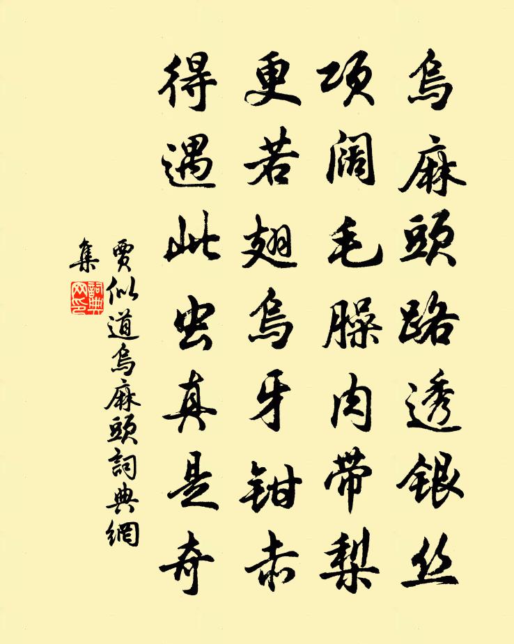 詩詞名句歷史字典書法欣賞書法字典國語詞典說文解字康熙字典古漢語字典標 題 作 者 詩 句 烏麻頭作者:賈似道 朝代:宋代烏麻頭原文烏麻頭路透銀絲,項闊毛臊肉帶梨。更若翅烏牙鉗赤,得遇此蟲真是奇。詩詞問答問:烏麻頭的作者是誰?答:賈似道問:烏麻頭寫於哪個朝代?答:宋代賈似道烏麻頭書法欣賞烏麻頭書法作品詩詞推薦挽俞克晦丈二首趙蕃〔宋代〕憶昨陳平相,鄉閭例薦延。蓬山渝奏墨,岩邑漫銓員。祠館歸求志,周行數選賢。那知終不偶,幕府遂終焉。中秋夜南樓寄友人李群玉〔唐代〕海月出銀浪,湖光射高樓。朗吟無淥酒,賤價買清秋。氣冷魚龍寂,輪高星漢幽。他鄉此夜客,對景餞多愁。秋熱白玉蟾〔宋代〕槐窗過兩頃雨,竹榻無一張涼。風揭蓮花白起,月篩桂子黃香。資殿清惠陳公哀詩三首劉克莊〔宋代〕端平元祀王正月,我與公同被特招。甲午英游小元佑,庚申景運再陳橋。可憐轉枕成春夢,猶憶聯鞍趁早朝。若見每憶家園樂蜀中寄傅逸人張詠〔宋代〕每憶家園樂,當年枉用心。翻身期濟物,明代已腰金。守道知無取,防奸似不任。休今得休去,誰肯羨為霖。涵暉谷劉仲堪〔宋代〕嵌空在山半,天設茲閒敞。清墟生畫白,高迥傳遙響。窮應到真境,憩暫祛煩想。岩石如可耕,此地堪長往。辛酉富池元宵寫懷二首董嗣杲〔宋代〕七年交春七日強,蒙蒙春雨吞江鄉。此夕莫知是元夕,地爐埋伏身猶僵。鼓簫聲絕想景物,燈火焰短如尋常。逢辰次韻荼槱二絕洪咨夔〔宋代〕愛春留得瓊英在,添竹扶將翠蔓高。更著金沙相間種,主人四壁錦周遭。十二月中旬書戴溪亭王銍〔宋代〕天上東風轉斗星,天涯羇客尚飄萍。道塗況復經殘歲,風雪那堪宿旅亭。春到怯添雙鬢白,夜寒愁對一燈青。殘年菩薩蠻(送太夫人就養南安)郭應祥〔宋代〕佳辰昨日傳筒黍。今朝重把離觴舉。別駕奉安輿。前呵方塞途。龐眉真壽相。兩處交迎養。庾嶺到星沙。風光屬一宿鄭山鋪李公明〔宋代〕行役苦行役,淒涼應奈何。自從多事後,應恨一身多。草店張燈宿,石橋乘月過。曳裾悲我計,回首一煙簑。酹江月侯善淵〔元代〕無形道體,運陽光、密布通微恢鄂。炫惚昏衢烹浩氣,沖塞英華盈落。瑩日千尋,清風萬里,顯煥神光爍。夷門羽出城寫望宋祁〔宋代〕驅車南陌道,物色喜春還。水暖初成浦,雲晴不抱山。原姿平澶漫,禽哢巧間關。此適非謀野,祠官只在閒。題雪竇禪師壁(一作贈雪竇峰禪師)方乾〔唐代〕飛泉濺禪石,瓶注亦生苔。海上山不淺,天邊人自來。長年隨檜柏,獨夜任風雷。獵者聞疏磬,知師入定回。僧舍小池張鼎〔唐代〕引出白雲根,潺潺漲蘚痕。冷光搖砌錫,疏影露枝猿。淨帶凋霜葉,香通洗藥源。貝多文字古,宜向此中翻。賓州二首陶弼〔宋代〕何處登臨好,城樓對萬山。新青上孤壘,遠黑落諸蠻。竹引風穿壁,苔隨雨上階。有時寧免俗,銀燭間金釵。晨炊翫鞭亭二首楊萬里〔宋代〕問著無聲是阿兄,坐看家賊只吞聲。戮屍大放經綸手,長柄判將鍚茂弘。黎州安撫趙輓詩魏了翁〔宋代〕不為軟語混光塵,獨把剛腸敵世紛。讀史功夫頭沒膝,疾時風論齒穿齦。慈烏反哺終違志,斷雁辭行不作群。猶有答外龍輔〔宋代〕金徽只自秘,玉匣不曾開。梅花難獨弄,袖手待郎來。慎交歌釋智圓〔宋代〕莫言青松青,有時亦摧折。莫言圓月明,有時亦虧缺。莫逆論心素,刎頸定交結。年發未及衰,交情已消歇。俄因名句推薦青山欲共高人語。聯翩萬馬來無數。辛棄疾《菩薩蠻·金陵賞心亭為葉丞相賦》 事莫貴乎有驗,言莫棄乎無徴。徐幹《中論·上卷·貴驗》 雪洗虜塵靜,風約楚雲留張孝祥《水調歌頭·和龐佑父》 玉樓深鎖薄情種。清夜悠悠誰共。秦觀《桃源憶故人·玉樓深鎖薄情種》 黃昏獨倚朱闌。西南新月眉彎。馮延巳《清平樂·雨晴煙晚》 亂之所生也,則言語以為階。佚名《易傳·繫辭傳上·第八章》 寂寞深閨,柔腸一寸愁千縷。李清照《點絳唇·閨思》 征蓬出漢塞,歸雁入胡天。王維《使至塞上》 柳岸風來影漸疏,使君家似野人居。杜牧《齊安郡晚秋》 無我原非你,從他不解伊。曹雪芹《紅樓夢·第二十二回》