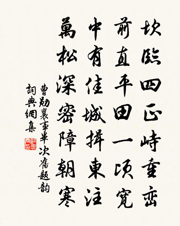 詩詞名句歷史字典書法欣賞書法字典國語詞典說文解字康熙字典古漢語字典標 題 作 者 詩 句 襄事畢次舊題韻作者:曹勛 朝代:宋代襄事畢次舊題韻原文坎臨四正峙重巒,前直平田一頃寬。中有佳城揖東注,萬松深密障朝寒。詩詞問答問:襄事畢次舊題韻的作者是誰?答:曹勛問:襄事畢次舊題韻寫於哪個朝代?答:宋代曹勛襄事畢次舊題韻書法欣賞襄事畢次舊題韻書法作品詩詞推薦泛舟至竹洲呂祖儉〔宋代〕湖光拍天浮竹洲,隱然一面城之幽。中有高士披素裘,我欲從之恐淹留。探囊百金辦扁舟,又煩我友著意修。微風夜過吳江聖壽寺宿復中行方丈成廷珪〔元代〕深夜扣禪扃,天寒月在庭。鳥栖驚後樹,僧掩讀殘經。蔓草風吹白,枇杷雪洗青。對床聽法文,心孔愈惺惺。文昌寓直鄭谷〔唐代〕何遜空階夜雨平,朝來交直雨新晴。落花亂上花磚上,不忍和苔蹋紫英。次韻答潘宰見和送正仲多字韻詩舒岳祥〔宋代〕強健近八十,如君誠未多。夢中思謁帝,醉後縱懸河。撫事遽如許,流年奈若何。相期成二老,舉斗酌纖阿。檢校竹隱竹數三首趙蕃〔宋代〕憶昔山中居,朝莫惟脫粟。何以居之安,賴此猗猗綠。一朝顧捨去,夢寐勞心目。今晨忽在眼,如客得歸宿。題倪上人詩卷劉克莊〔宋代〕故交歲晚各西東,解後斯人慰老窮。莫把冠巾浼澄觀,更添鬚髮惱林公。強牽謝客為禪客,閒伴涪翁作釣翁。行矣拒霜花王安石〔宋代〕落盡群花獨自芳,紅英渾欲拒嚴霜。開元天子千秋節,戚里人家承露囊。曉行張問陶〔清代〕人語夢頻驚,轅鈴動曉征。飛沙沉露氣,殘月帶雞聲。客路逾千里,歸心折五更。回憐江上宅,星漢 * 明。成都遨樂詩二十一首寒食出城田況〔宋代〕郊外融和景,濃於城市中。歌聲留客醉,花意盡春紅。遊人一何樂,歸馭莫怱怱。木蘭花秦觀〔宋代〕秋容老盡芙蓉院,草上霜花勻似翦。西樓促坐酒杯深,風壓繡簾香不捲。玉纖慵整銀箏雁,紅袖時籠金鴨暖。歲華洞庭連天樓傅若金〔元代〕崔嵬古廟壓危沙,縹緲飛樓入斷霞。南極千峰迷楚越,西江眾水混渝巴。鮫人夜出風低草,龍女春還雨濕花。北倚鷓鴣天晏幾道〔宋代〕楚女腰肢越女腮,粉圓雙蕊髻中開。朱弦曲怨愁春盡,淥酒杯寒記夜來。新擲果,舊分釵,冶遊音信隔章台。花間元日方翥〔宋代〕又見增年齒,謀身事事非。時難逢歲飯,日暖換春衣。新莽奸猶在,懷王殯未歸。中原久離絕,感節淚頻揮。送胥裴二子回馬上作梅堯臣〔宋代〕陰陰雪雲低,遊子去將懶。豈惟遊子倦,疲馬行亦款。送罷我獨還,回看鴈為伴。念此日暮時,寂寞閉竹館。題袁溪張逸人所居羅隱〔唐代〕蒲梢獵獵燕差差,數里溪光日落時。芳樹文君機上錦,遠山孫壽鏡中眉。雞窗夜靜開書卷,魚檻春深展釣絲。若使春雪二首張耒〔宋代〕春雲驕不行,凍雨作飛雪。夜深歸無燭,已覺馬蹄滑。那知事未已,通夕注不歇。堂寒曉附火,檐滴更清絕。前者醉落魄范成大〔宋代〕棲鳥飛絕,絳河綠霧星明滅。燒香簟眠清樾。花影吹笙,滿地淡黃月。好風碎竹聲如雪。昭華三弄臨風咽。鬢絲撩題陽關圖二首黃庭堅〔宋代〕斷腸聲里無形影,畫出無聲亦斷腸。想得陽關更西路,北風低草見牛羊。石壕吏杜甫〔唐代〕暮投石壕村,有吏夜捉人。老翁逾牆走,老婦出門看。吏呼一何怒,婦啼一何苦。聽婦前致詞,三男鄴城戍。一男風月陸游〔宋代〕老來苦無伴,風月獨見知。未嘗費招呼,到處相娛嬉。披襟萬里快,弄影三更奇。淋漓蜀苑酒,散落江樓詩。狂歌名句推薦袨服華妝著處逢,六街燈火鬧兒童。元好問《京都元夕》 執古之道,以御今之有。老子《老子·道經·第十四章》 明月松間照,清泉石上流。王維《山居秋暝》 高峰入雲,清流見底陶弘景《答謝中書書》 矜偽不長,蓋虛不久。韓非及後人《韓非子·難一》 陽關萬里道,不見一人歸。庾信《重別周尚書》 虛空落泉千仞直,雷奔入江不暫息。徐凝《廬山瀑布》 贈君明月滿前溪,直到西湖畔。毛滂《燭影搖紅·送會宗》 安得五彩虹,駕天作長橋。李白《焦山望寥山》 君子之守,修其身而天下平。孟子《孟子·盡心章句下·第三十二節》