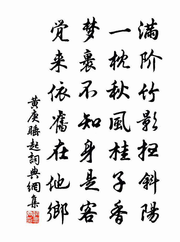 詩詞名句歷史字典書法欣賞書法字典國語詞典說文解字康熙字典古漢語字典標 題 作 者 詩 句 睡起作者:黃庚 朝代:宋代睡起原文滿階竹影掃斜陽,一枕秋風桂子香。夢裹不知身是客,覺來依舊在他鄉。詩詞問答問:睡起的作者是誰?答:黃庚問:睡起寫於哪個朝代?答:宋代黃庚睡起書法欣賞睡起書法作品詩詞推薦與西寺月石橋二首陳著〔宋代〕相逢相約到雲閒,欲往從人卻又還。留取有餘無盡意,眼中處處見西山。行至羅江代者爽期得史者書復還涪濱徑走富樂程公許〔宋代〕淋浪一日雨,浩蕩千岩秋。莞彼石澗水,奔霆撼林丘。須臾忽斂縮,幽咽鏘琳璆。混混須有本,萬古江河流。夷齊廟釋智圓〔宋代〕曾聞叩馬犯君顏,萬古清風滿世間。若便干戈為揖讓,夷齊終不死空山。【雙調】壽陽曲李壽卿〔元代〕金刀利,錦鯉肥,更那堪玉蔥纖細。添得醋來風韻美,試嘗道甚生滋味!點絳唇(榮國生日二首·二之一)張綱〔宋代〕飛雪初晴,曉來佳氣生庭戶。寶薰籠霧。簾幕香風度。鶴髮龜齡,堂上潘輿駐。花深處。緩歌金縷。莫借杯頻舉。看花四絕句司馬光〔宋代〕洛陽春日最繁華,紅綠陰中十萬家。誰道群花如錦鄉,人將錦繡學群花。四者吟邵雍〔宋代〕目時然後視,耳時然後聽。口時然後言,身時然後行。前不見厚祿,然不見重兵。惟其義所在,安知利與名。靖安寄居孟郊〔唐代〕寄靜書不寄華,書愛茲嵽嵲書居。渴飲濁清泉,飢食無名蔬。敗菜不敢火,補衣亦寫書。古雲儉成德,今乃實起予烏臼燭楊萬里〔宋代〕焰白光寒淚亦收,臼燈十倍蜜燈休。忘情也似誠齋叟,燒盡心時不淚流。廣陵遇孟九雲卿韋應物〔唐代〕雄藩本帝都,游士多俊賢。夾河樹鬱郁,華館千里連。新知雖滿堂,中意頗未宣。忽逢翰林友,歡樂斗酒前。高文揚旗杜甫〔唐代〕江雨颯長夏,府中有餘清。我公會賓客,肅肅有異聲。初筵閱軍裝,羅列照廣庭。庭空六馬入,駊騀揚旗旌。回回罷攝官後將還舊居,留辭李侍御劉長卿〔唐代〕江海今為客,風波失所依。白雲心已負,黃綬計仍非。累辱群公薦,頻沾一尉微。去緣焚玉石,來為采葑菲。州縣沖雪至餘慶覺林雪連日不止陸游〔宋代〕策蹇清吟涉若耶,灞橋猶恨近京華。山前千頃誰種玉?座上六時天散花。林雀無聲溪彴斷,炊煙不動竹籬斜。勝游浣溪沙周紫芝〔宋代〕無限春情不肯休。江梅未動使人愁。東昏覷得玉奴羞。對酒情懷疑是夢,憶花天氣黯如秋。喚春雲夢澤南州。次韻許深父張栻〔宋代〕下瞰寒江百尺坡,小松新種也婆娑。栽培擬待凌雲日,眼底浮花奈若何。淳祐祭海神十六首佚名〔宋代〕[徽一曲]若稽有唐,克致崇極。祝號既升,爰增祭式。從享於郊,神斯受職。我祀事新,式祈險驚。會稽頌曹娥祠諸葛興〔宋代〕悄叢祠兮江這湄,懍予心兮肅祗。表卓行兮尚之祀,垂妙辭兮淳之碑。嗟窈窕兮踐天性,一念烈兮萬古鏡。山眉兮嘆元九白居易〔唐代〕不入城門來五載,同時班列盡官高。何人牢落猶依舊,唯有江陵元士曹。嘉陽絕無木犀偶得一枝戲作陸游〔宋代〕久客紅塵不自憐,眼明初見廣寒仙。只饒籬菊同時出,尚占江梅一著先。重露濕香幽徑曉,斜陽烘蕊小窗妍。何人山間三首孔武仲〔宋代〕江城八月苦炎暉,瀟灑山間挾纊時。峰頂寶林俱勝絕,籃輿從此上天池。名句推薦林下春晴風漸和,高崖殘雪已無多。王守仁《春晴》 想當年、空運籌決戰,圖王取霸無休。柳永《雙聲子·晚天蕭索》 相思黃葉落,白露濕青苔。李白《長相思三首》 料想故園桃李,也應怨月愁風趙崇《清平樂·懷人》 但箭雁沈邊,梁燕無主。劉辰翁《蘭陵王·丙子送春》 尺之木必有節目,寸之玉必有瑕適。呂不韋《呂氏春秋·覽·離俗覽》 竹籬茅舍,淡煙衰草孤村。白樸《天淨沙·冬》 虛則知實之情,靜則知動者正。韓非及後人《韓非子·主道》 昨夜更闌酒醒,春愁過卻病。李璟《應天長·一鉤初月臨妝鏡》 夕陽閒淡秋光老,離思滿蘅皋柳永《少年游·參差煙樹灞陵橋》